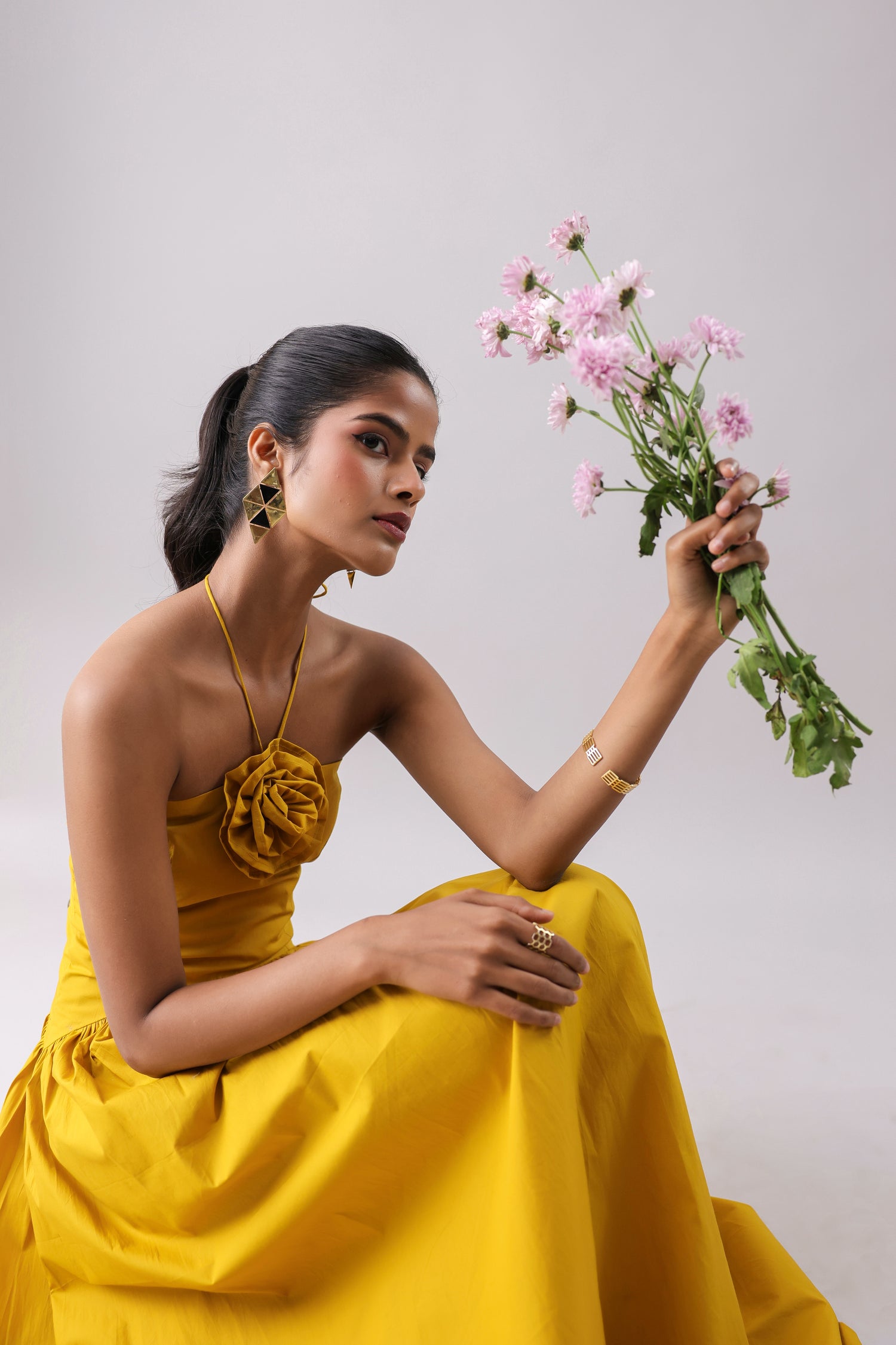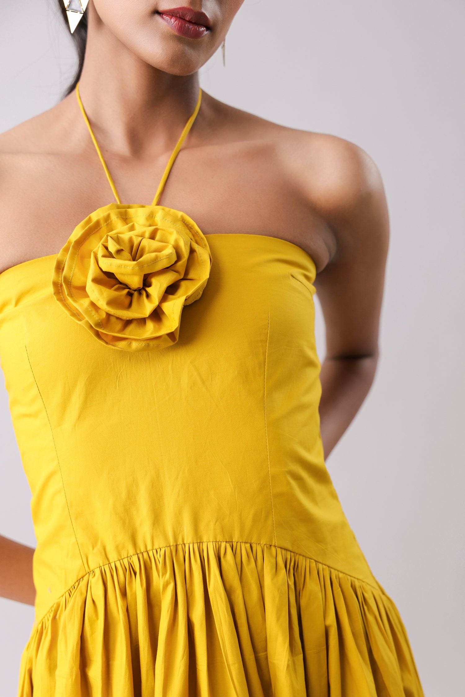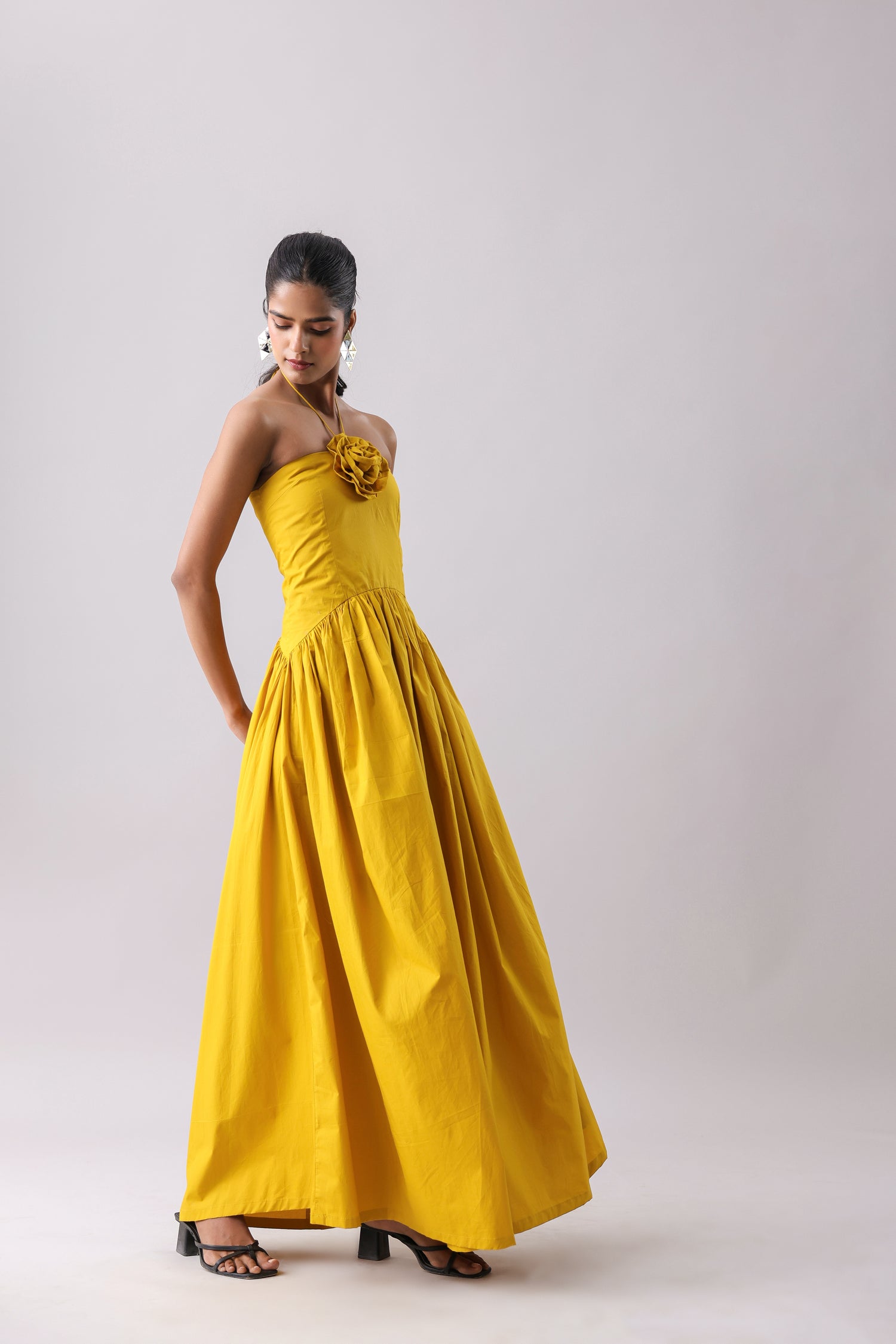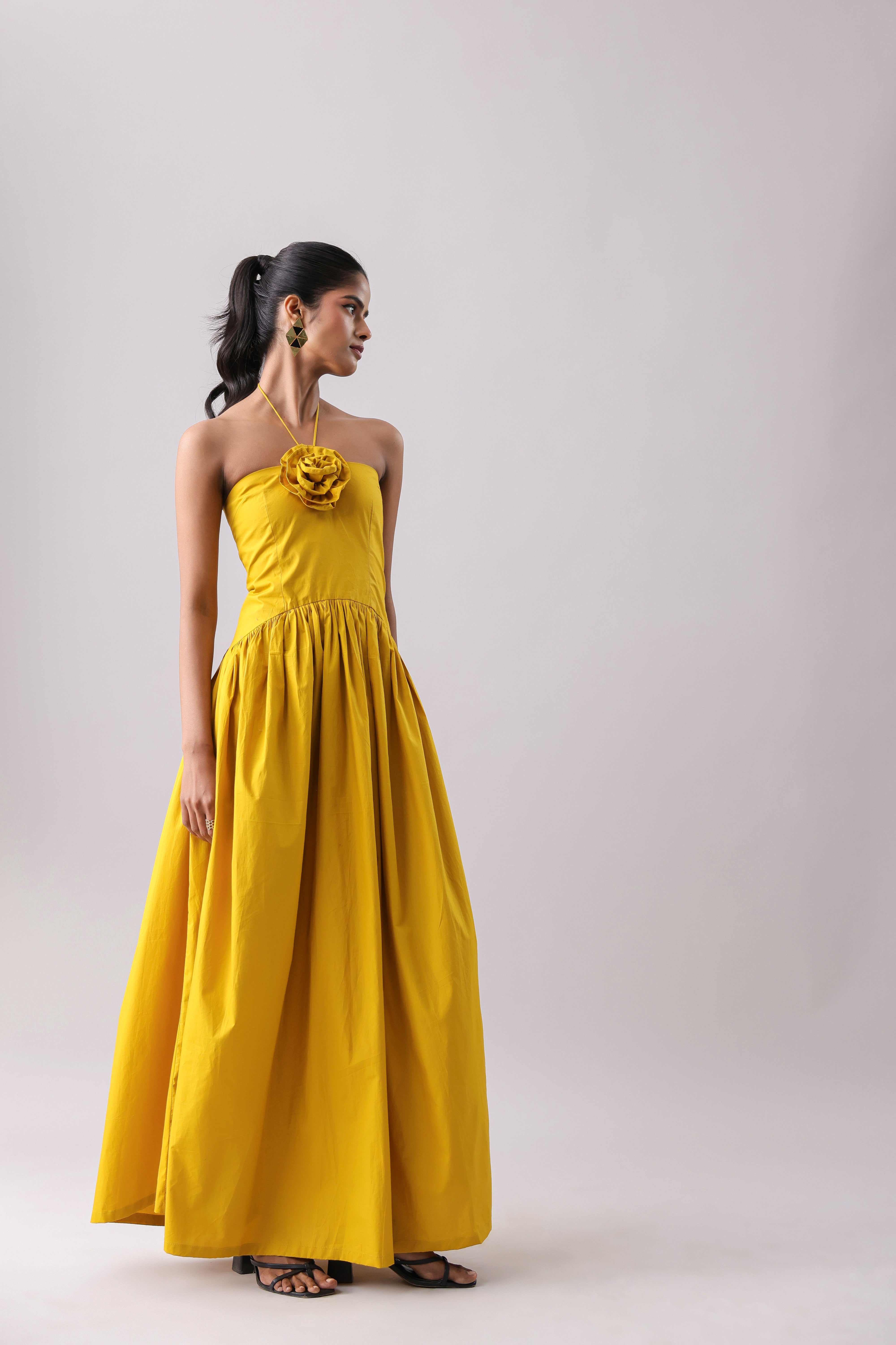 Halter maxi with an attached floret and a side-drop waist detail.