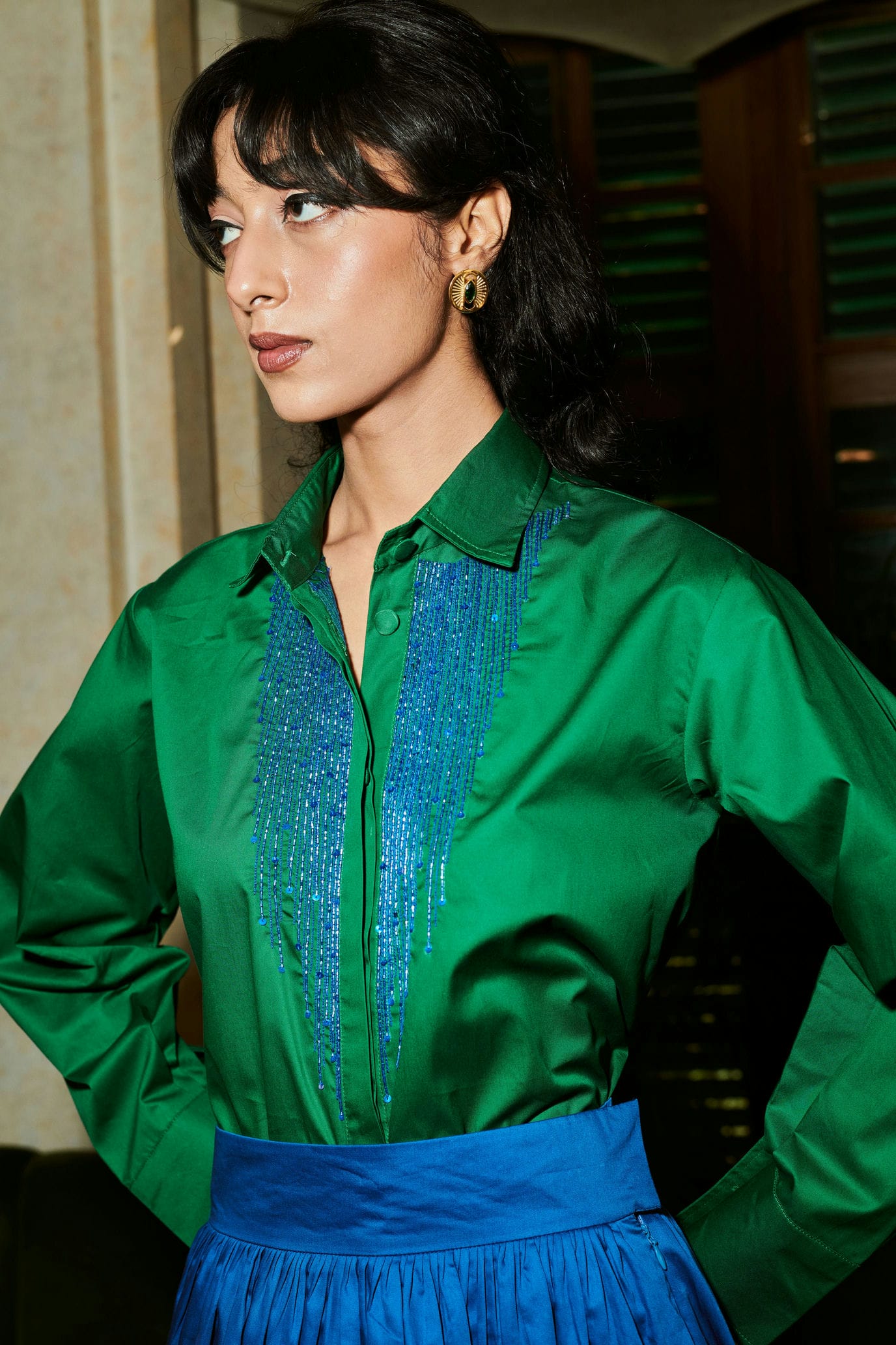 Co-ord set featuring and emerald green shirt with delicate blue crystal embroidery inspired by the falling stars, paired with a blue gathered skirt.