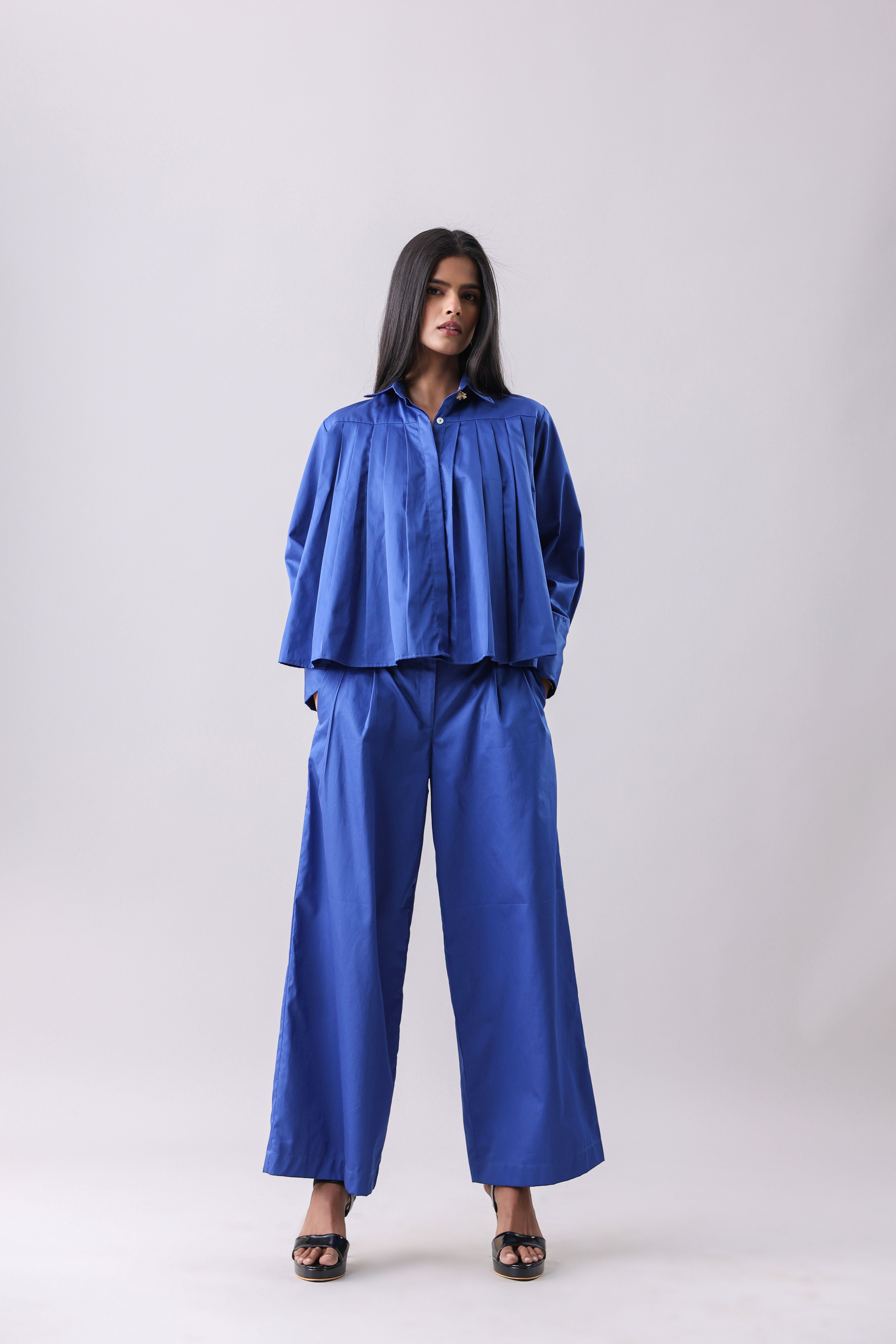 Wide pants with pleats on the waist. Side pockets, zip fly & button fastening.