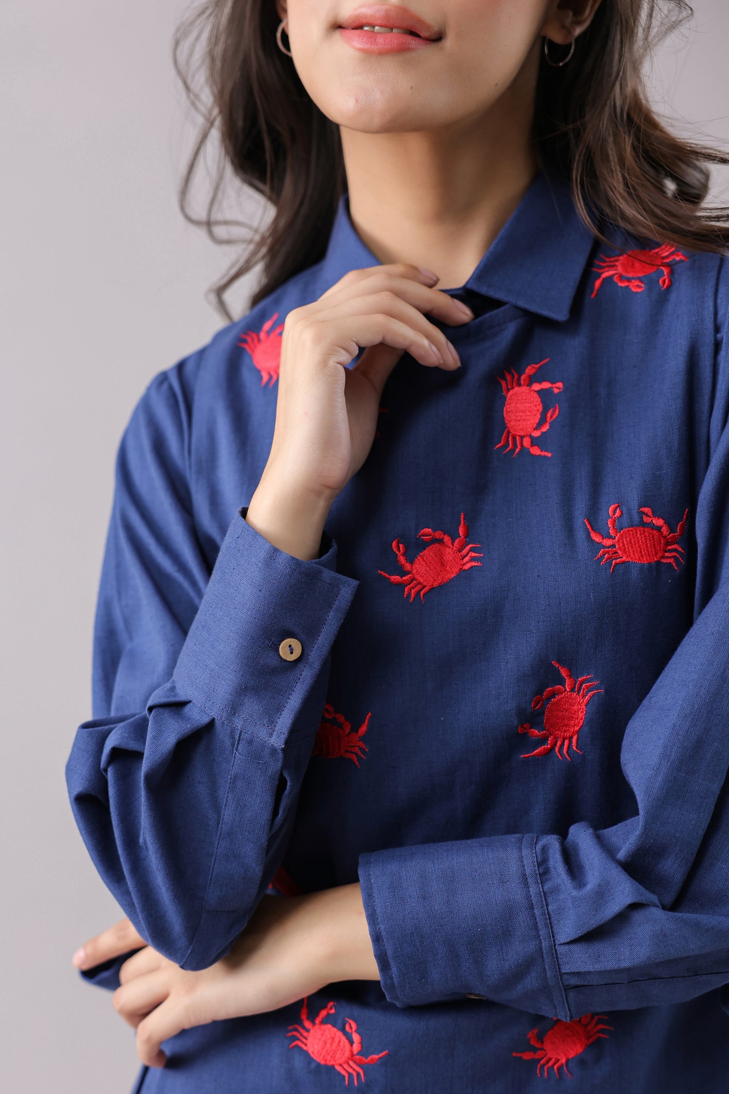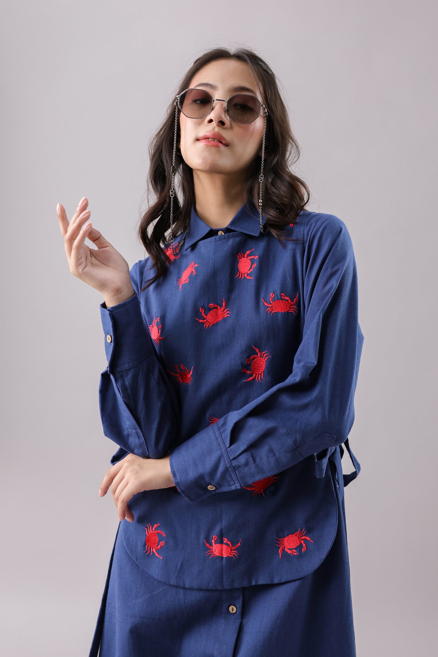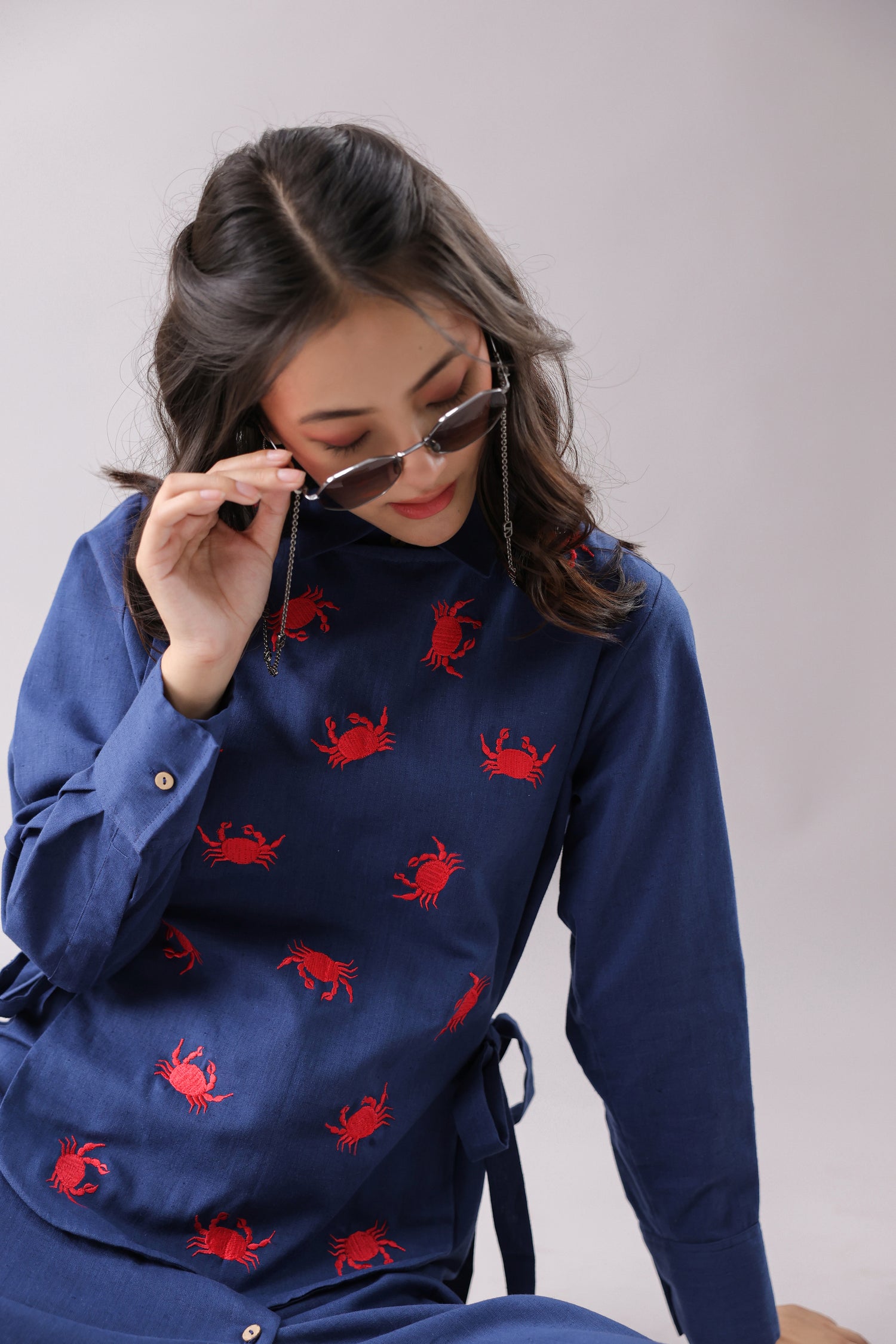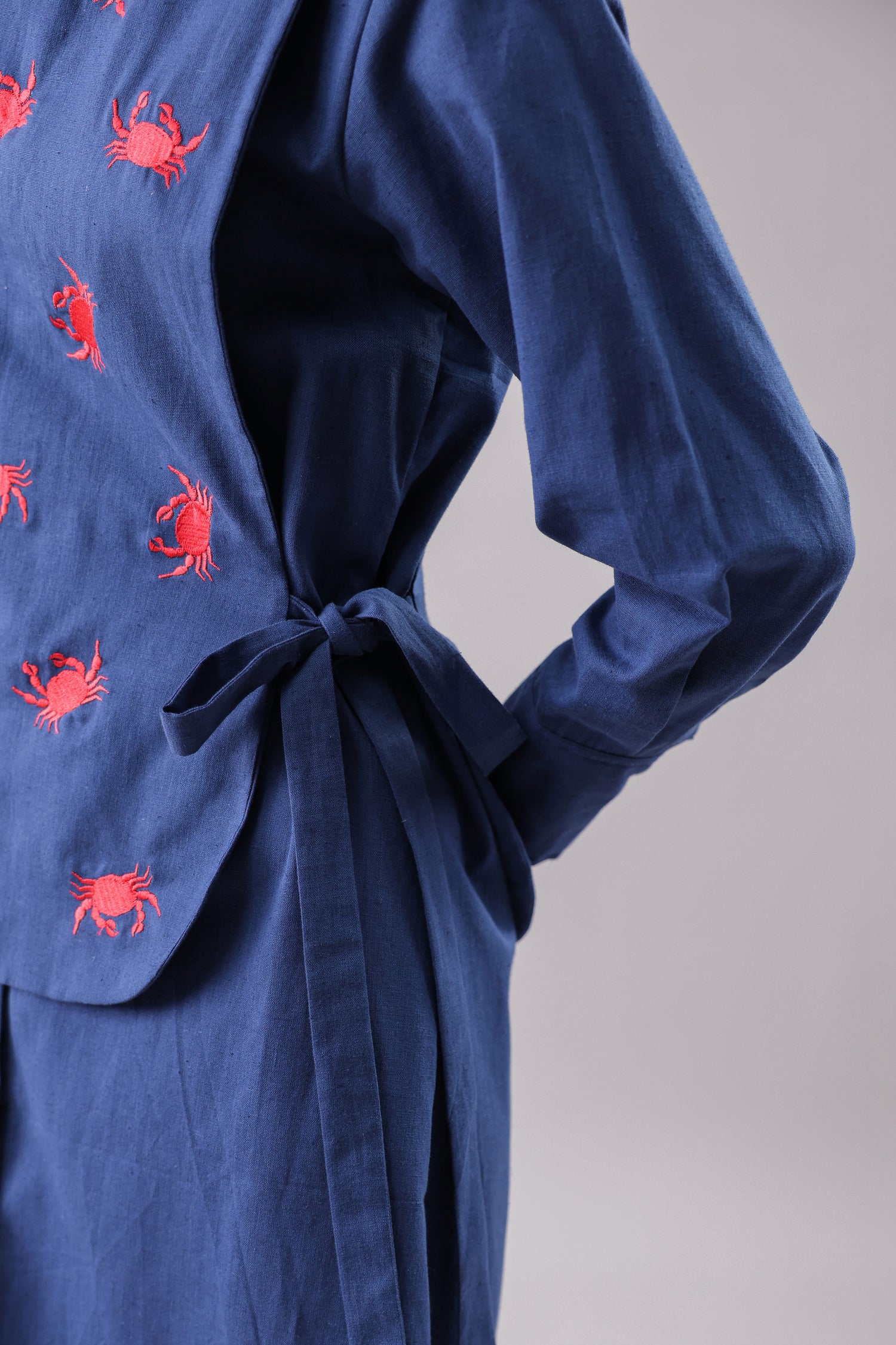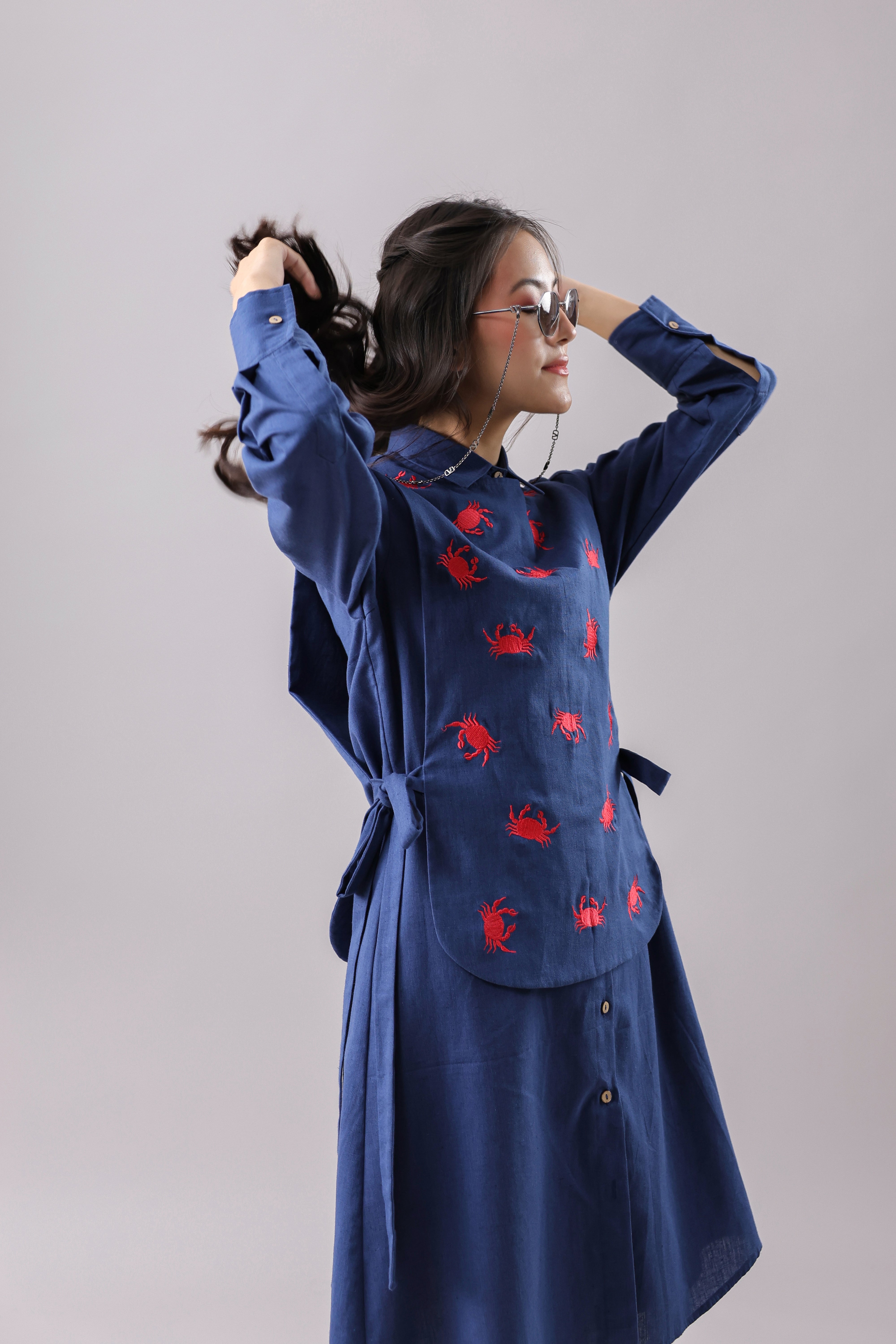 Vermillion crabs embroidered bib, lined and side bow tie-up fastening.