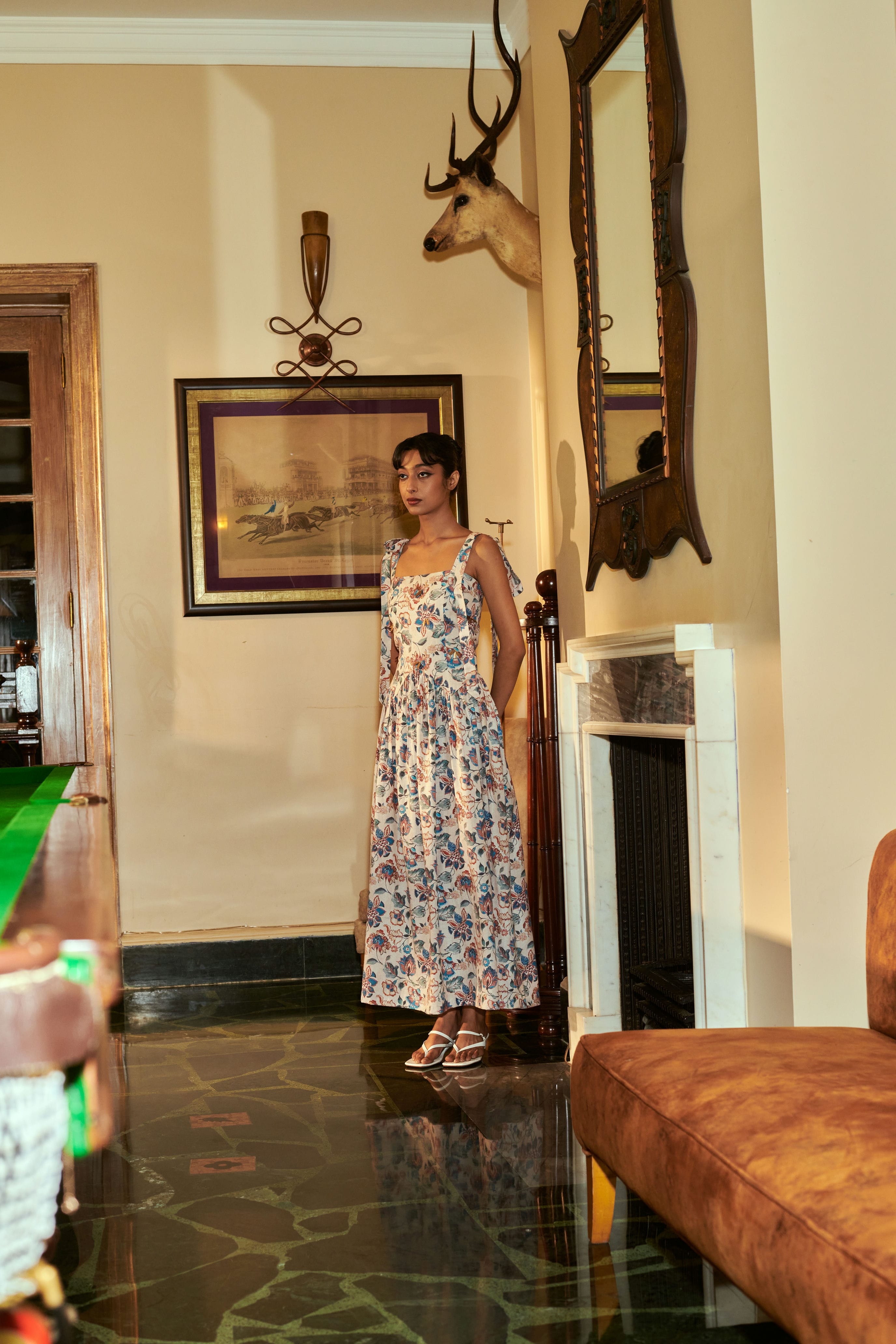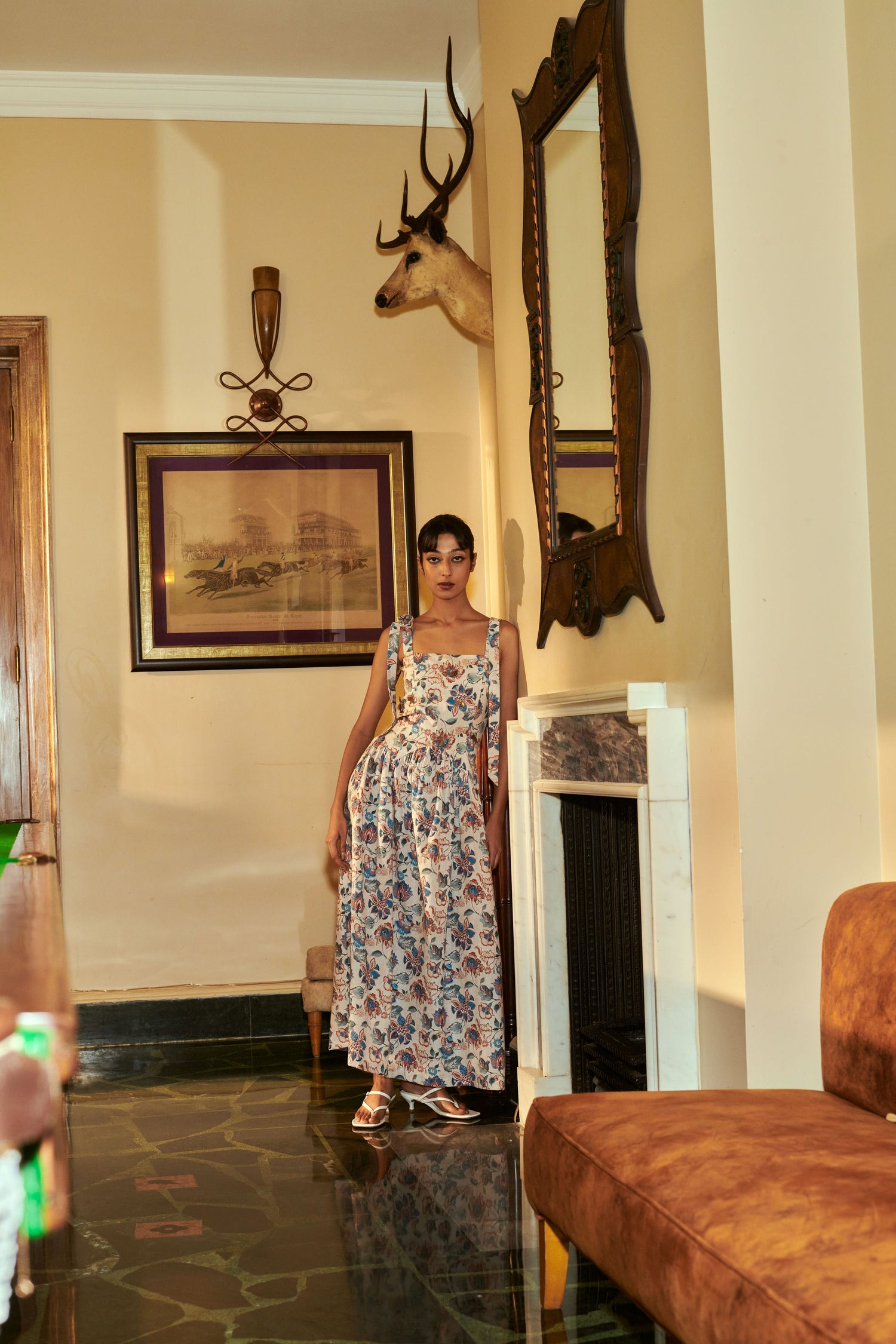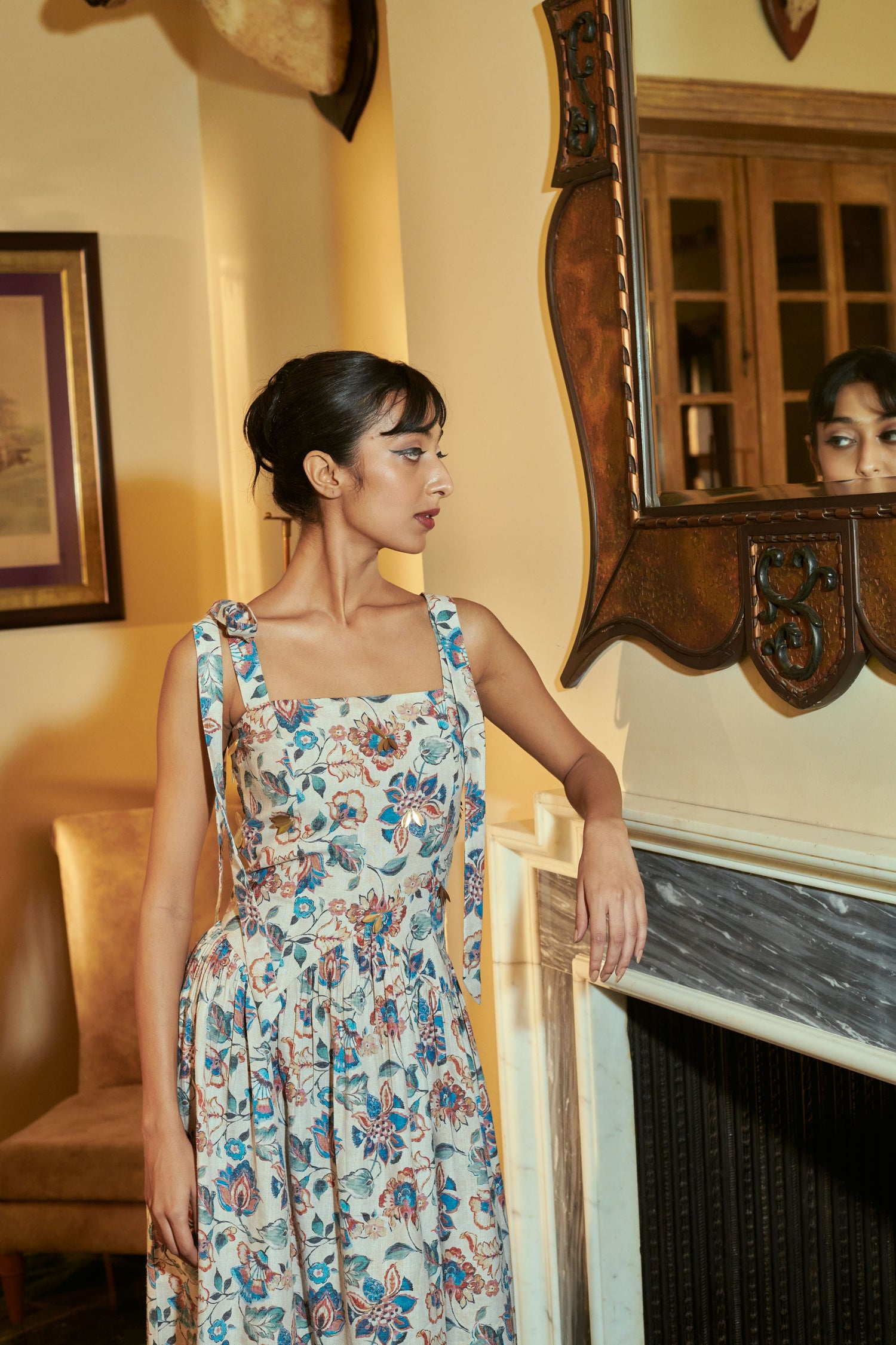 Dreamy meadow-like maxi dress with bronze embellishments.