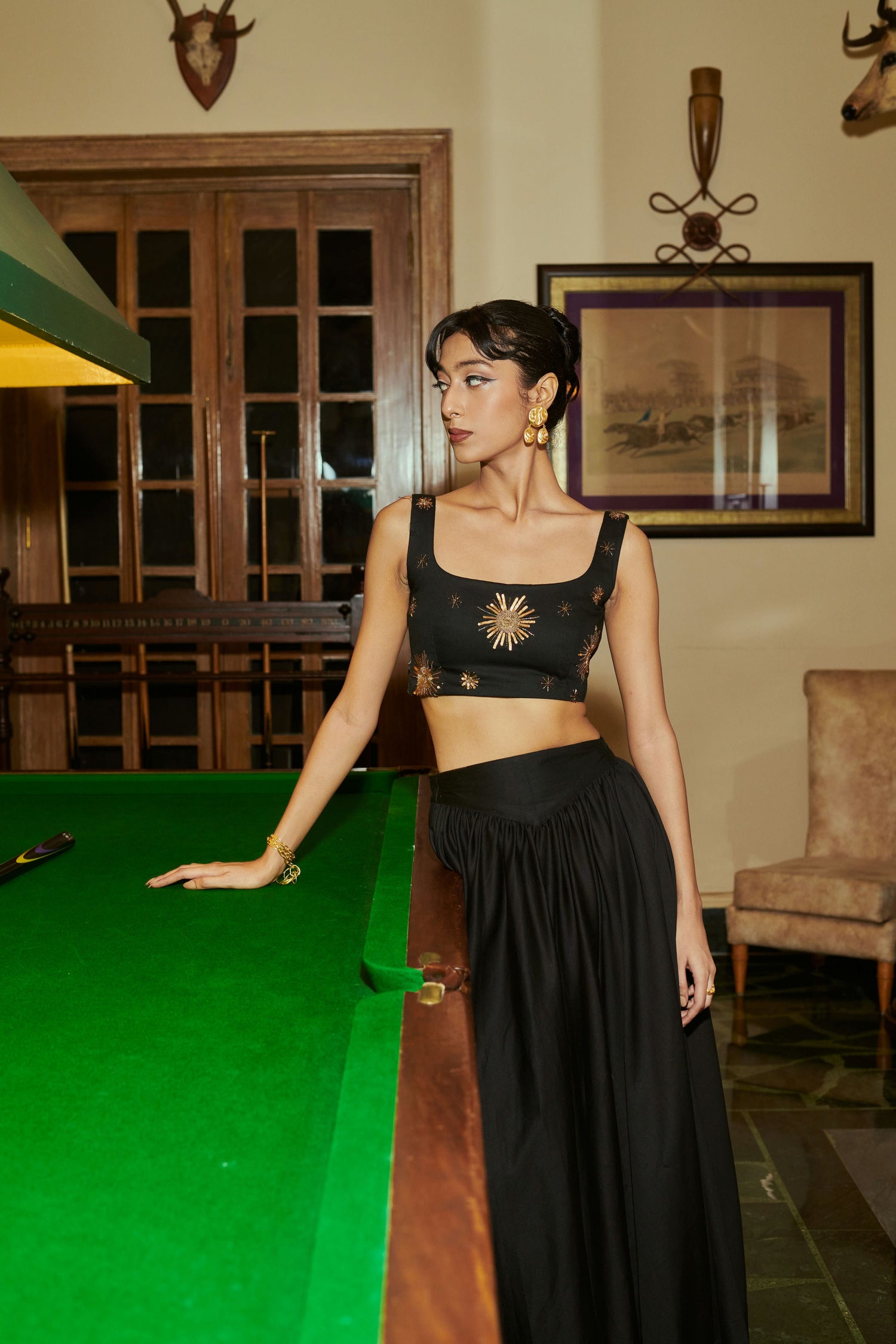 Drop-waist full circle gathered skirt. Side zip fastening with hook.