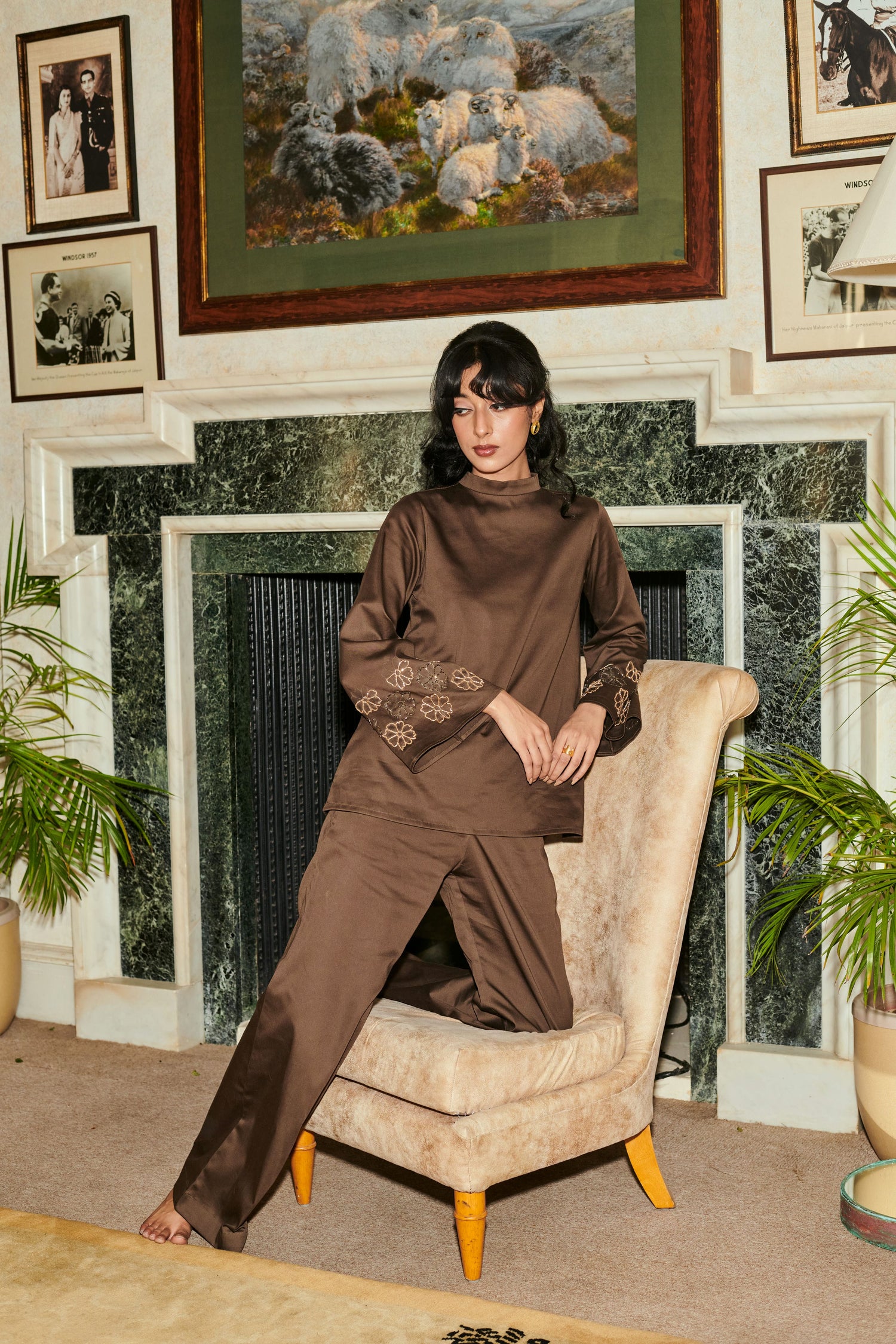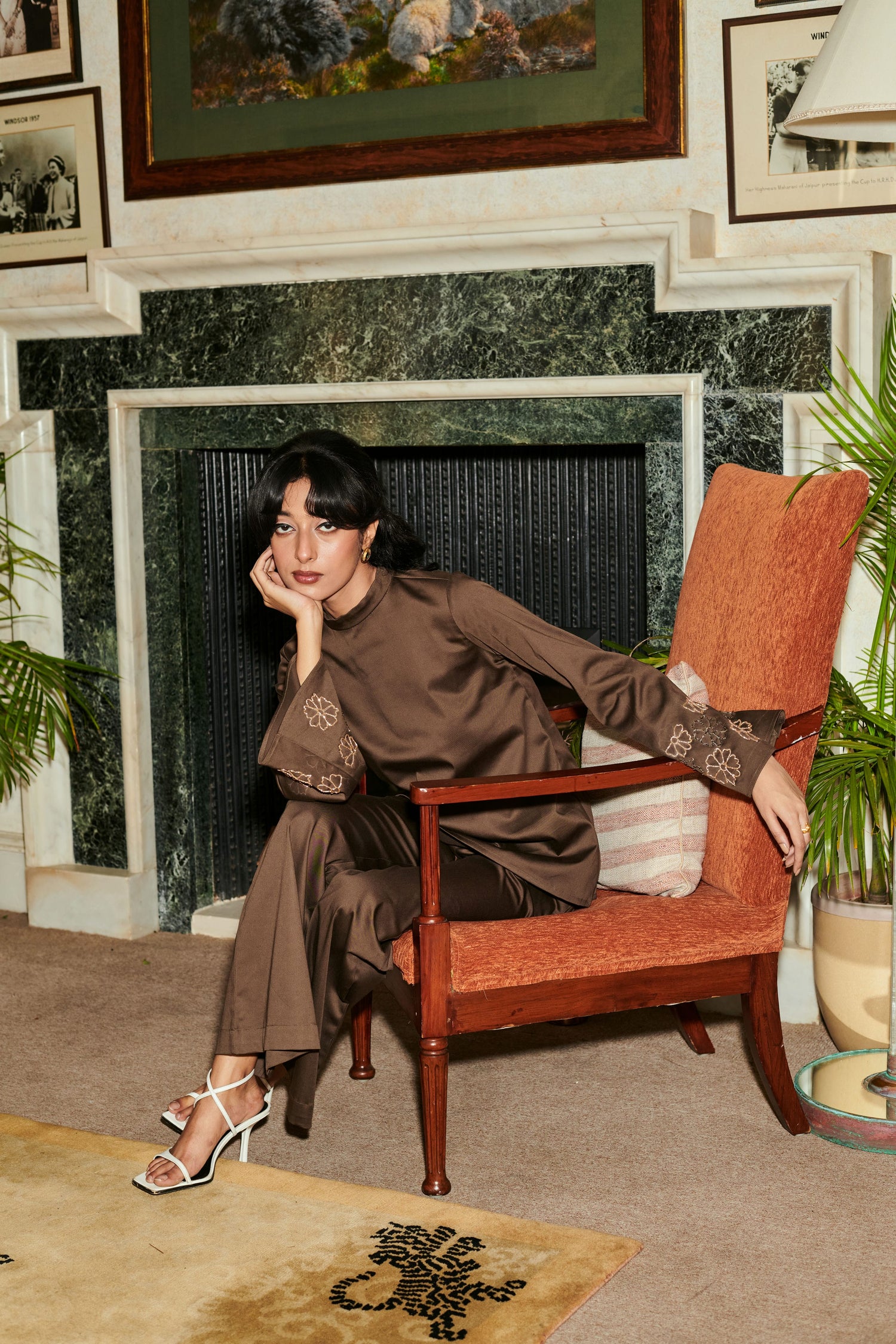 Co-ord set featuring a top adorned with subtle floral motifs on the sleeves, paired with wide tonal pants.