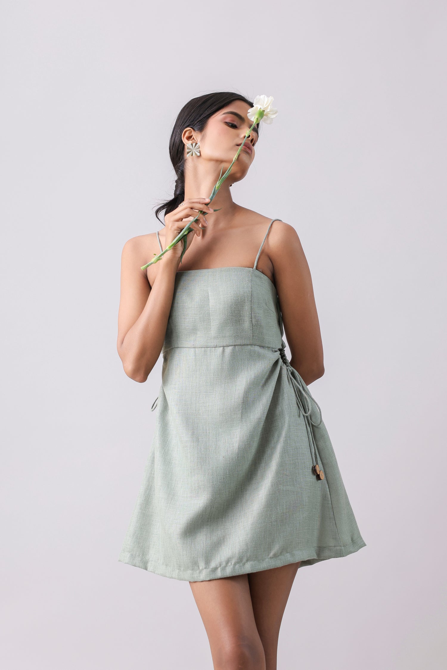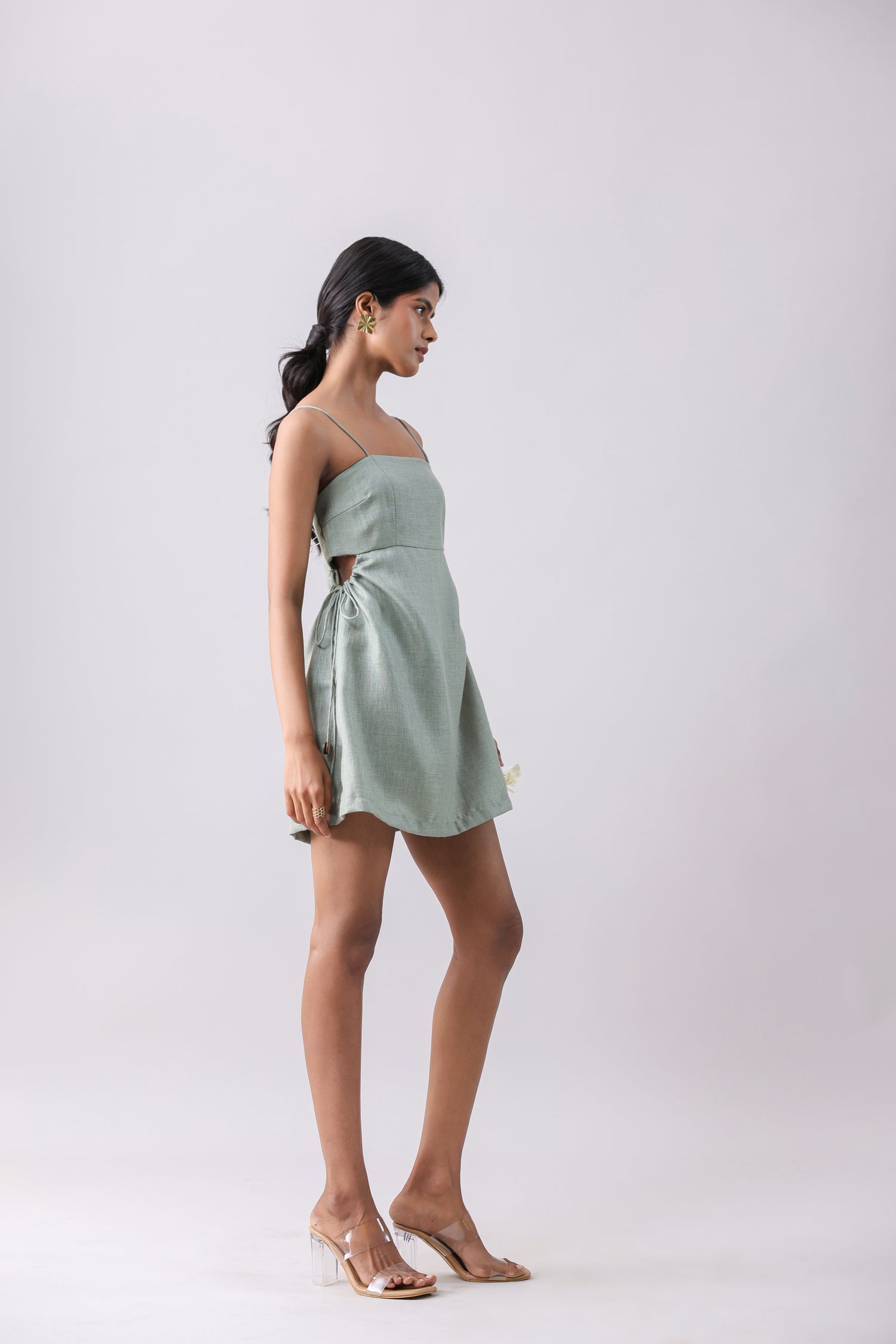 Mini dress with straight neckline and thin straps. Featuring cut-out details with a drawstring to adjust. Side zipper closure concealed in the seam.