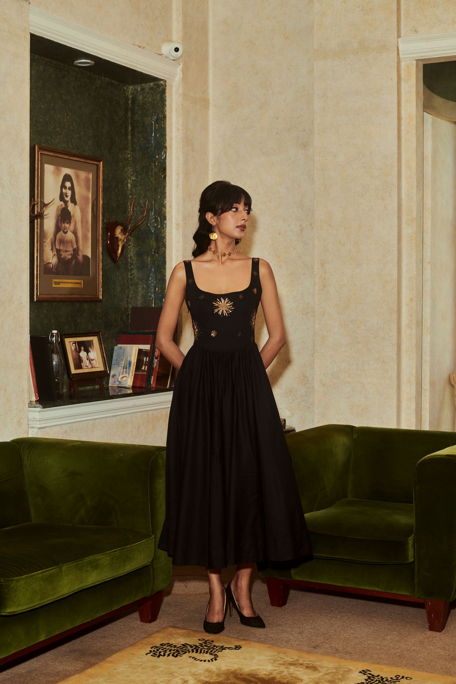 Maxi dress featuring our Fireflowers hand embroidery on the top, drop waist detail, and a full circle skirt. Zipper concealed in the side seam. U-neck front and back.