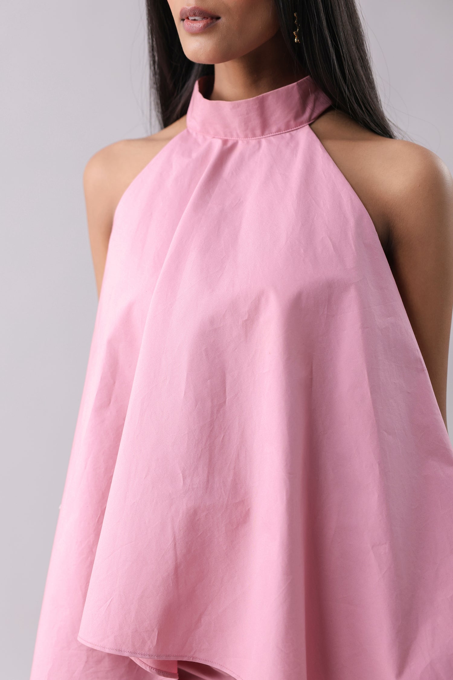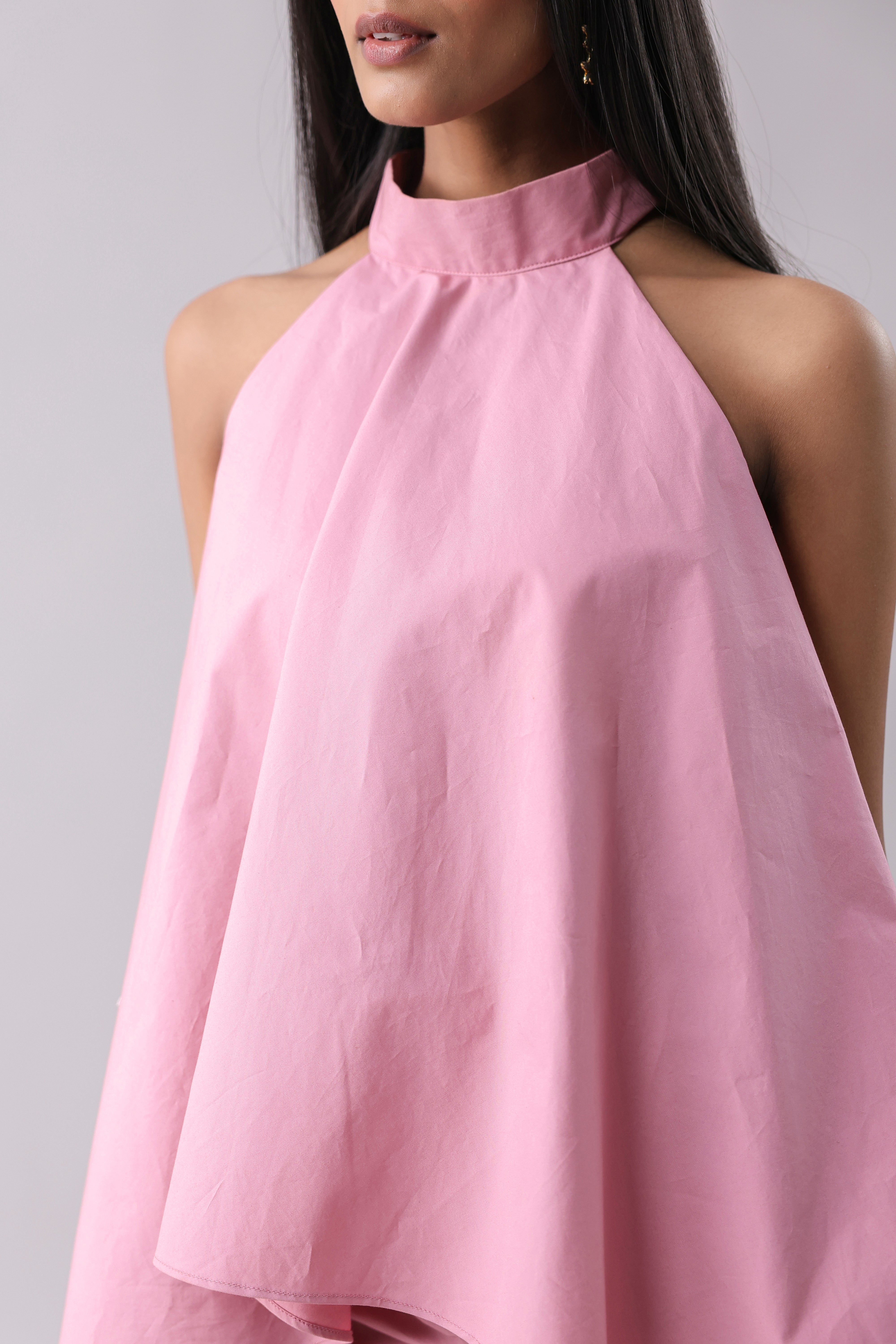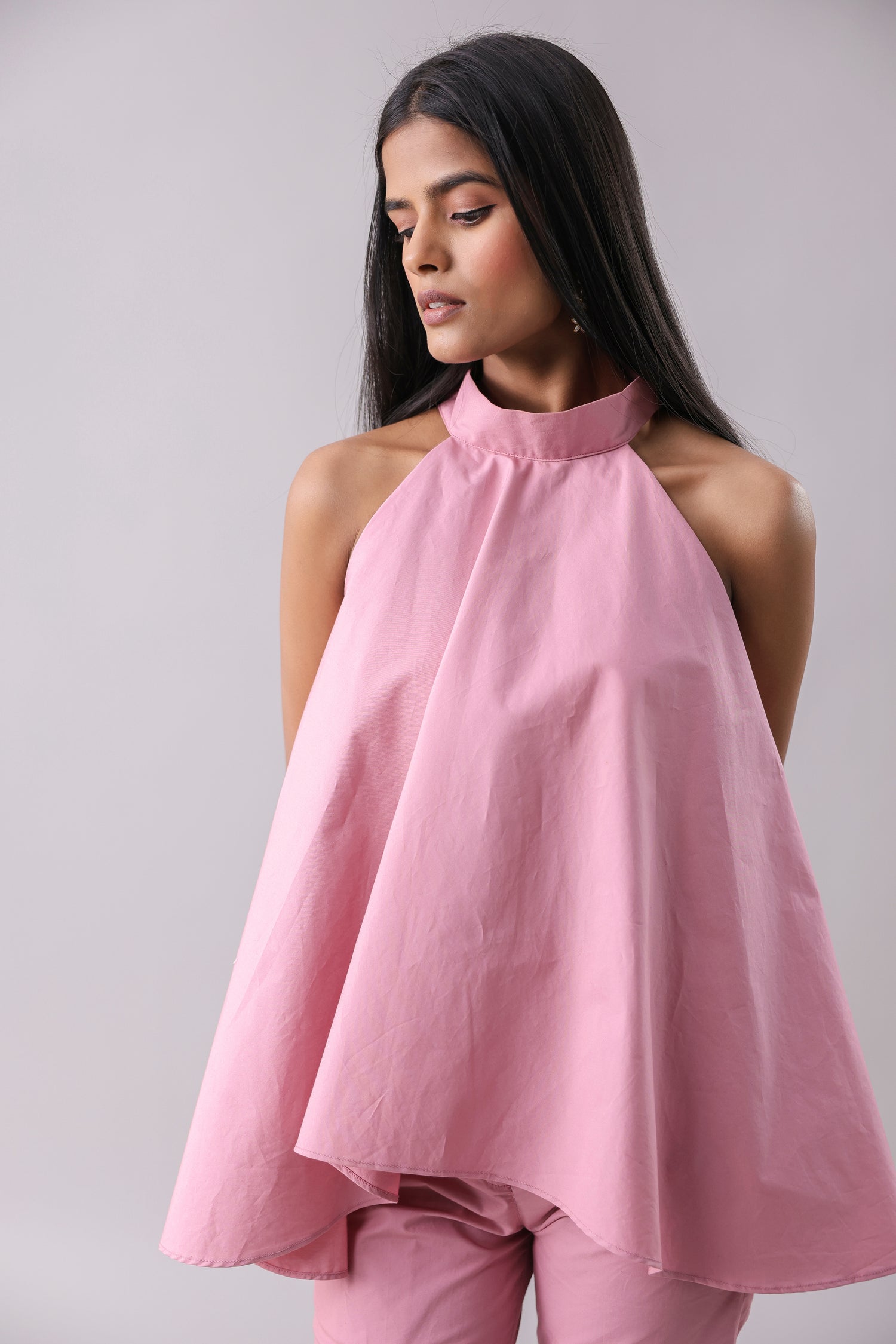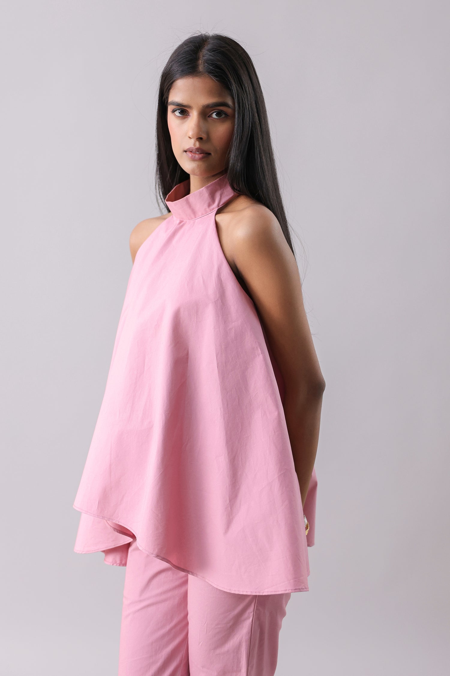 Halter-neck top, with neck (back) hook-eye fastening. Featuring a high-low detail and a belt.