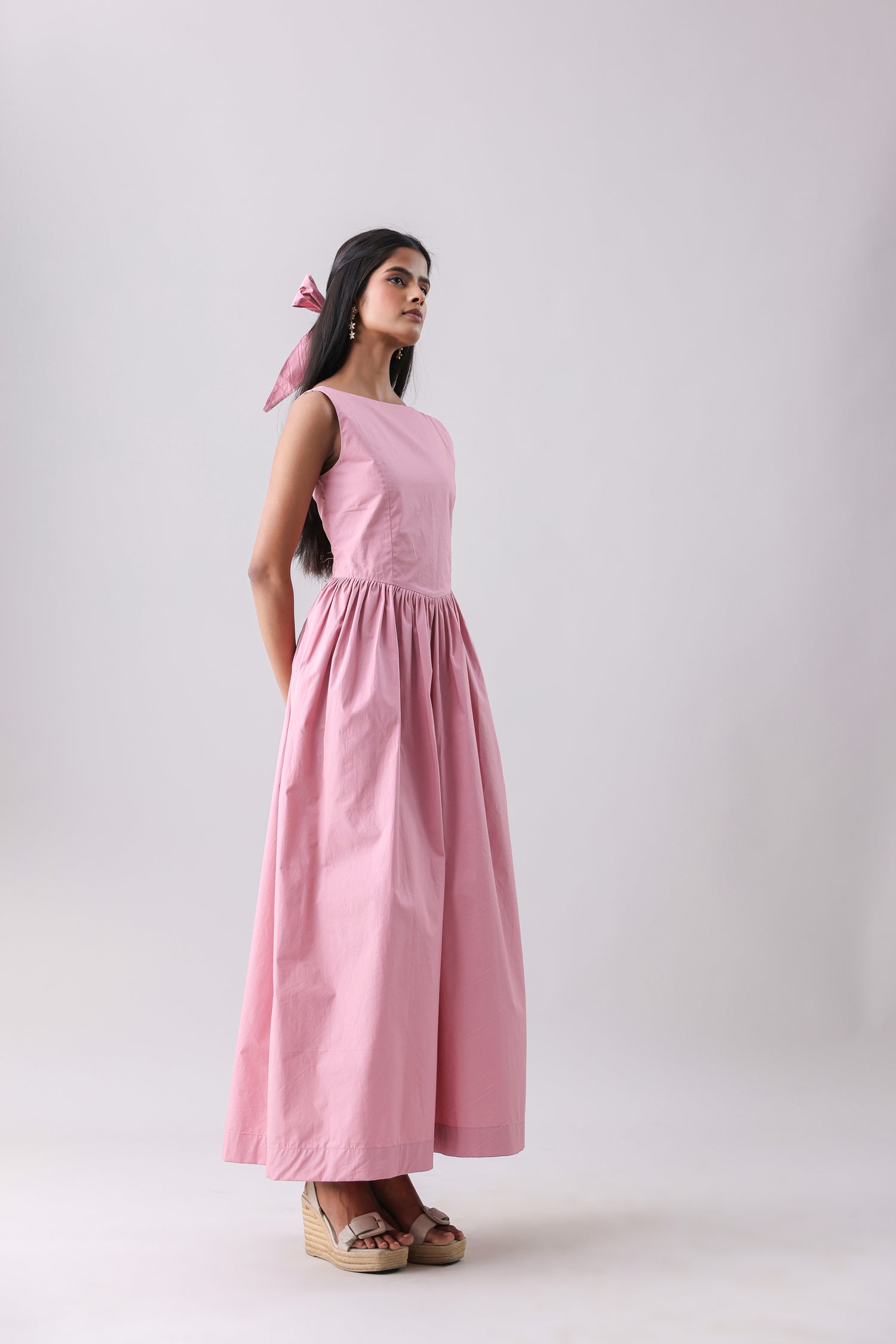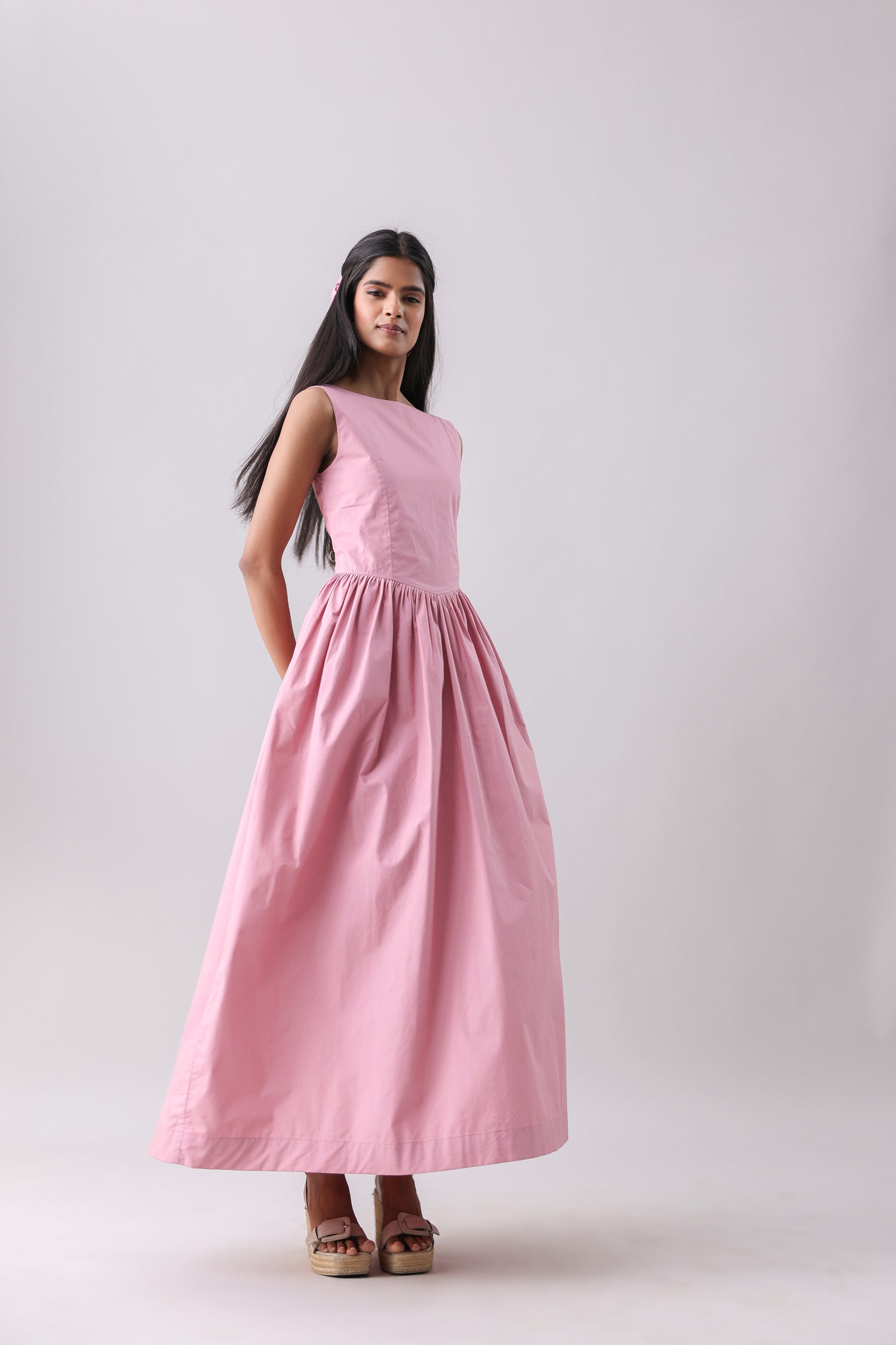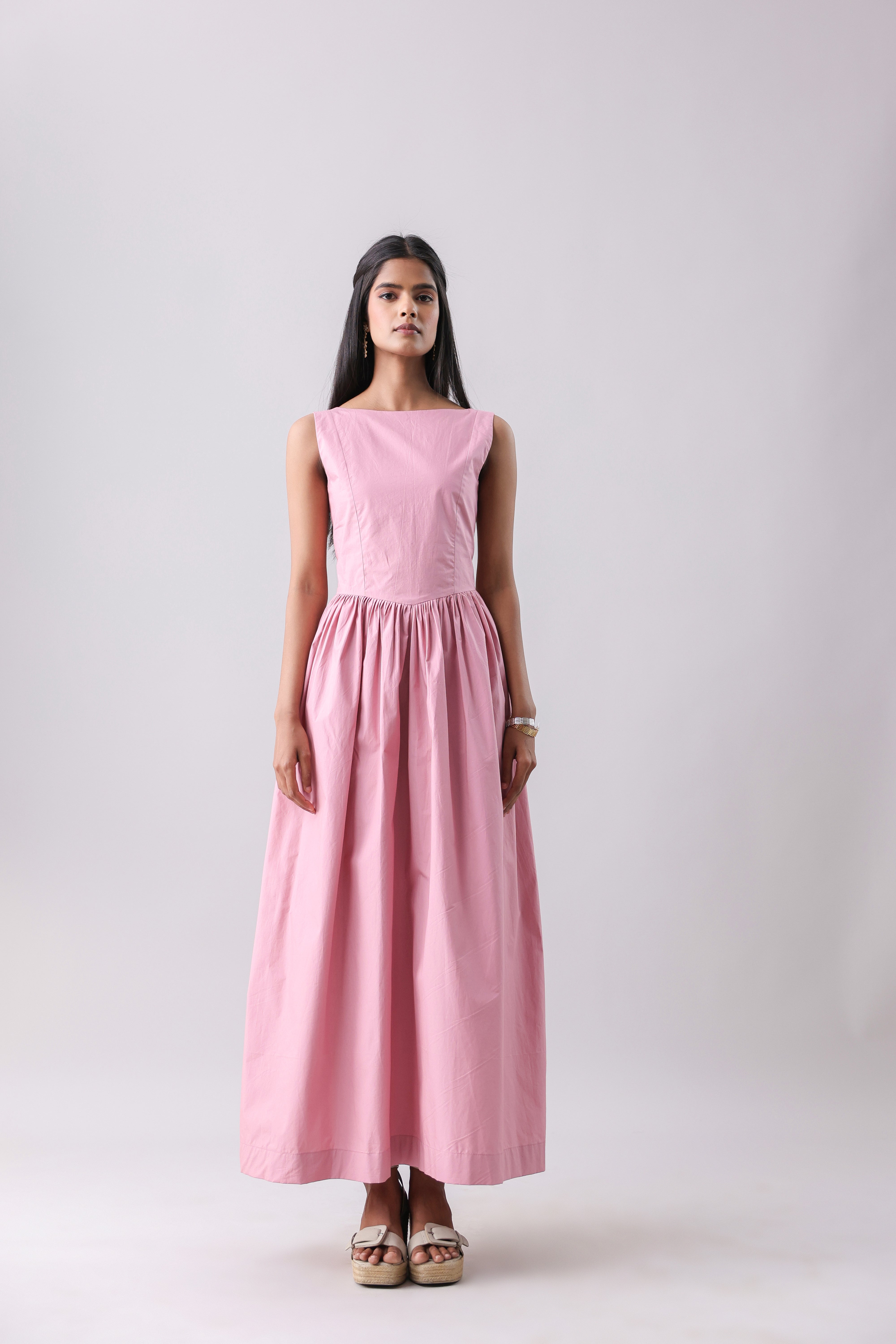 Boat neck maxi dress with a gathered full skirt. Featuring a drop waist detail and a deep back, with concealed zip closure at the back.