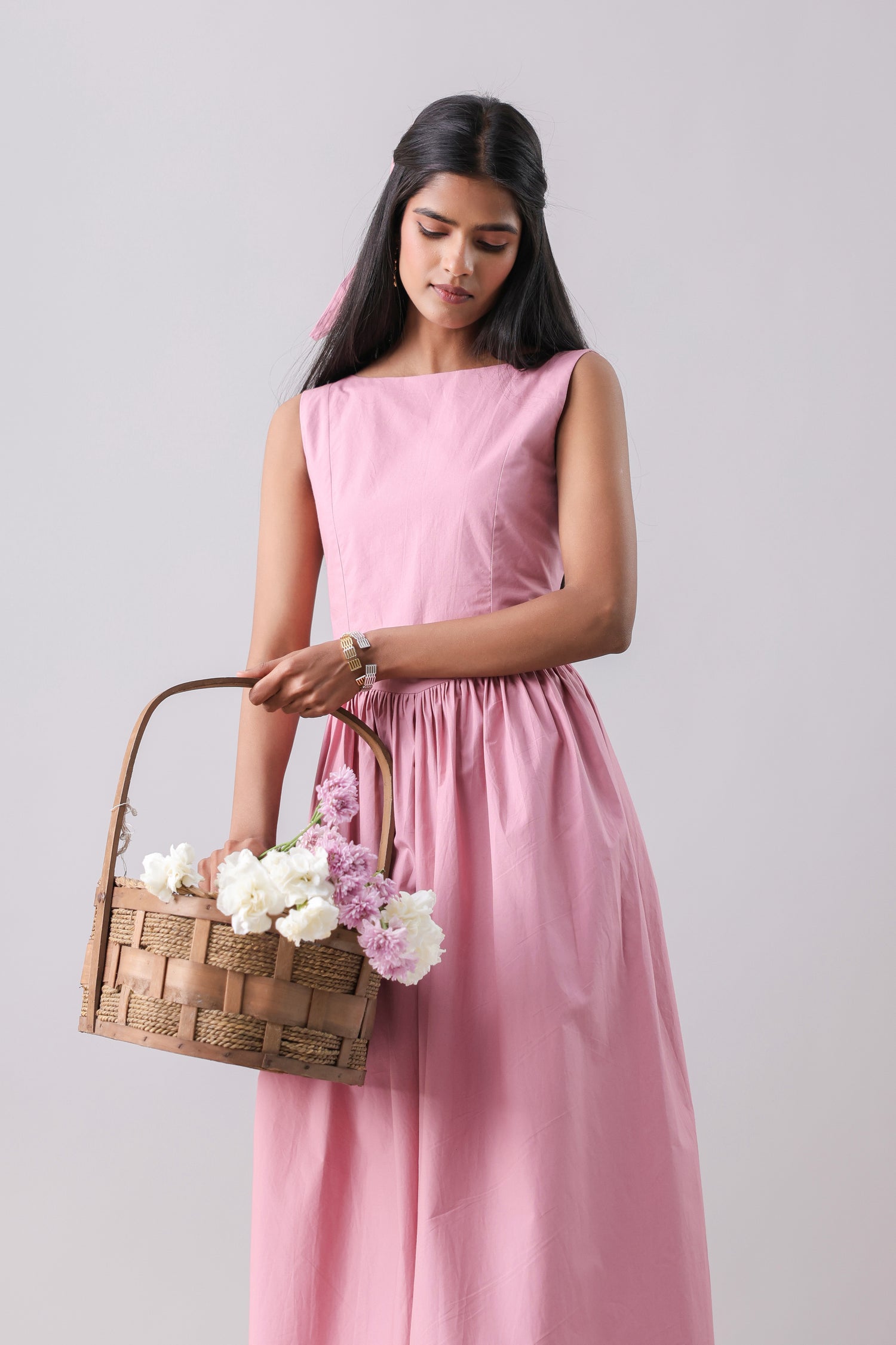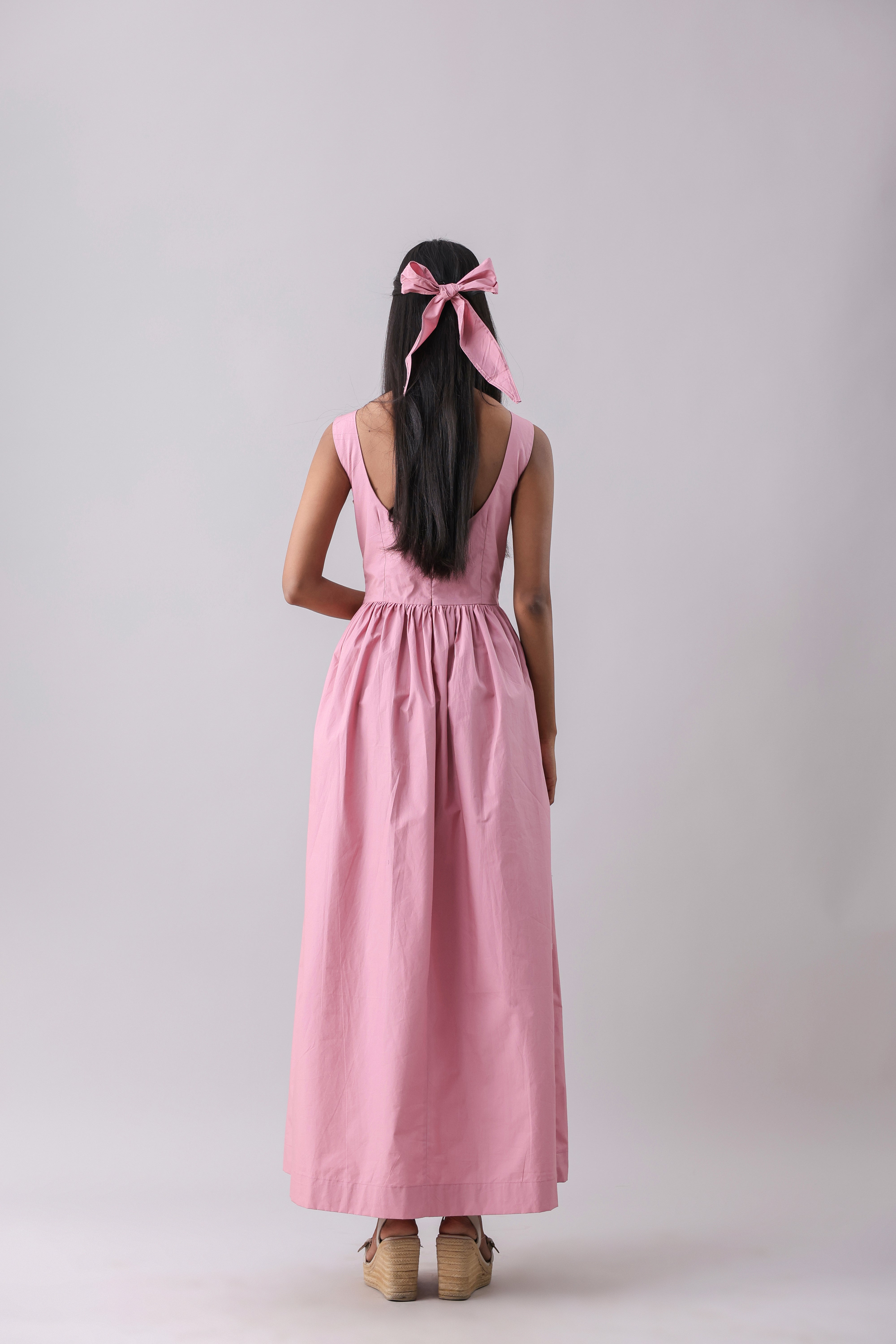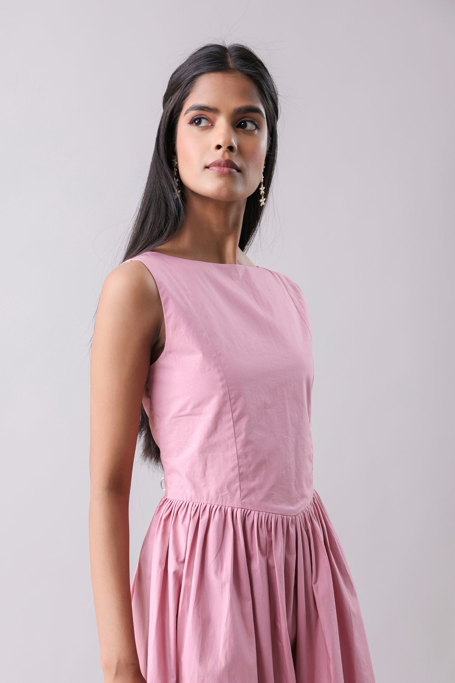 Boat neck maxi dress with a gathered full skirt. Featuring a drop waist detail and a deep back, with concealed zip closure at the back.