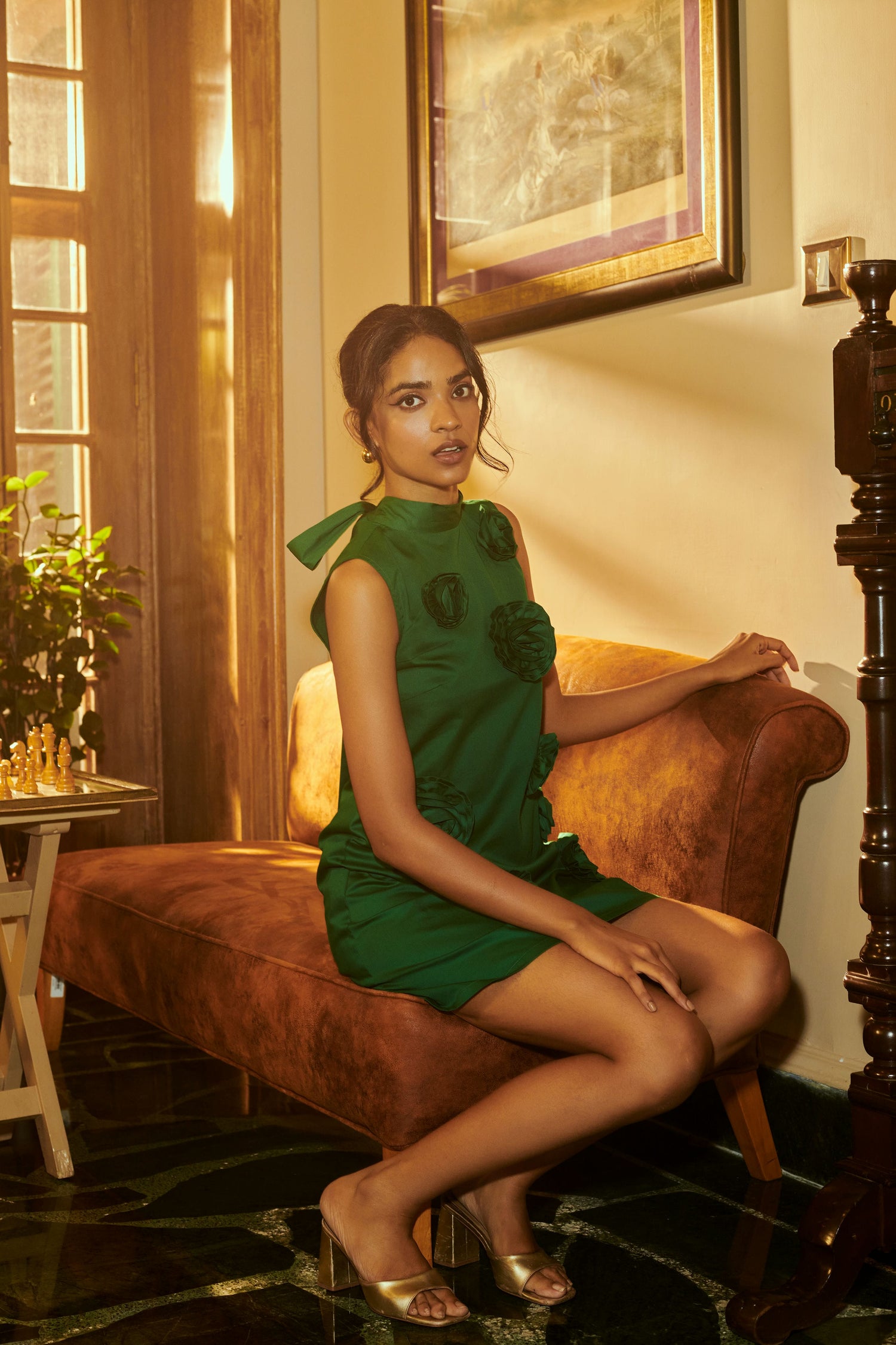 Floret mini dress, featuring florets over the dress. Pull-over style with neck bow-tie in a dramatic size.