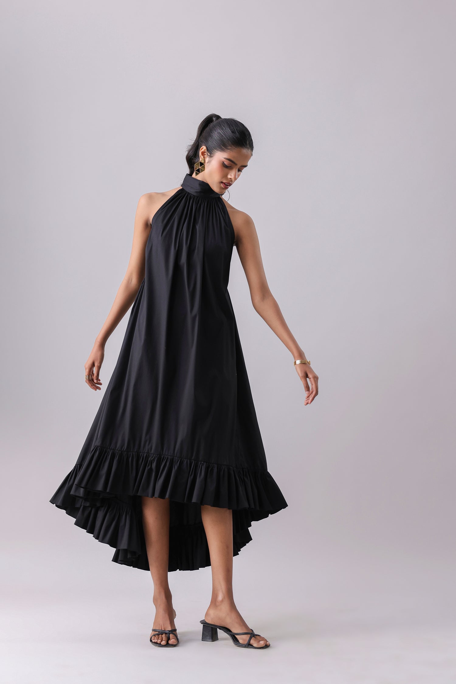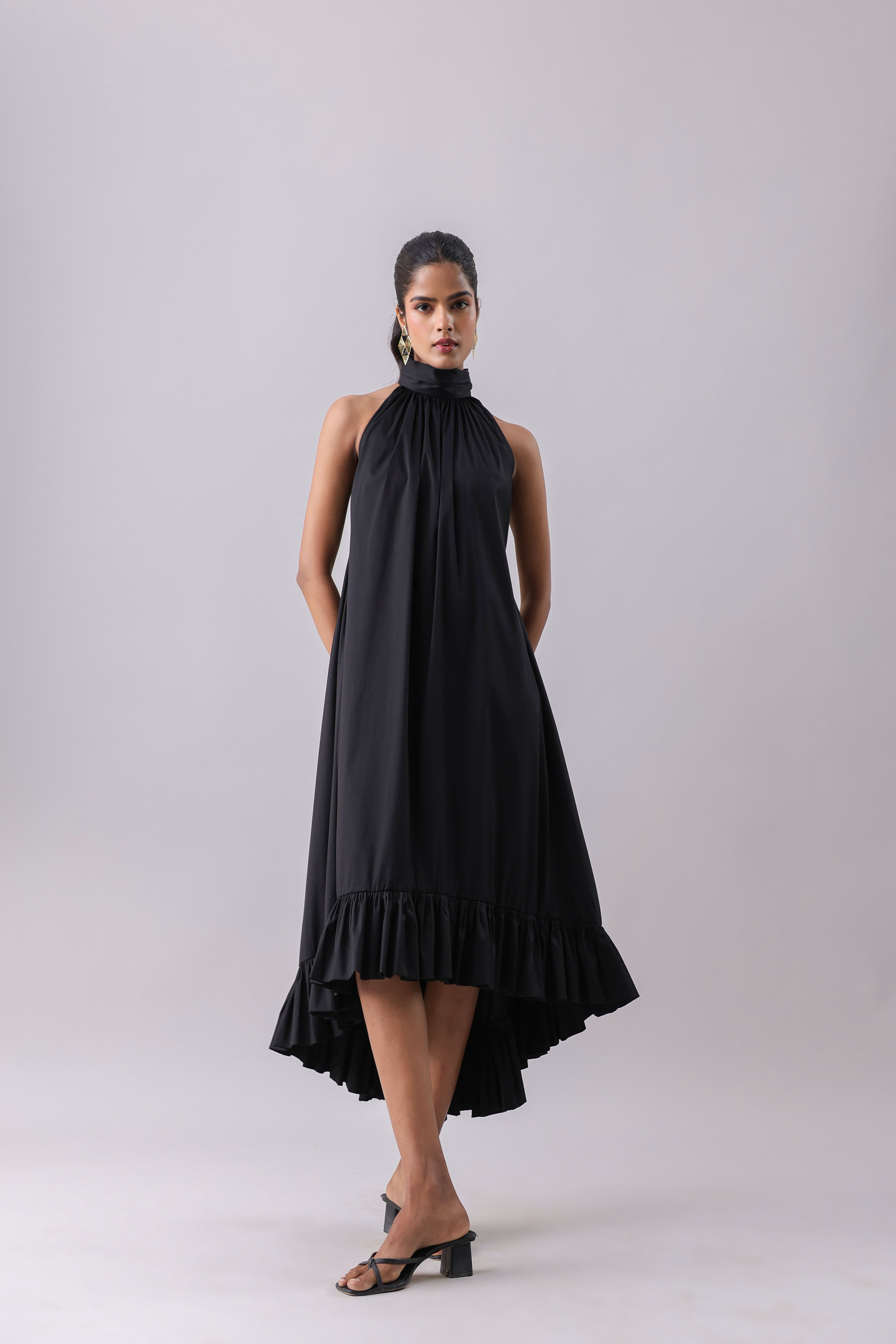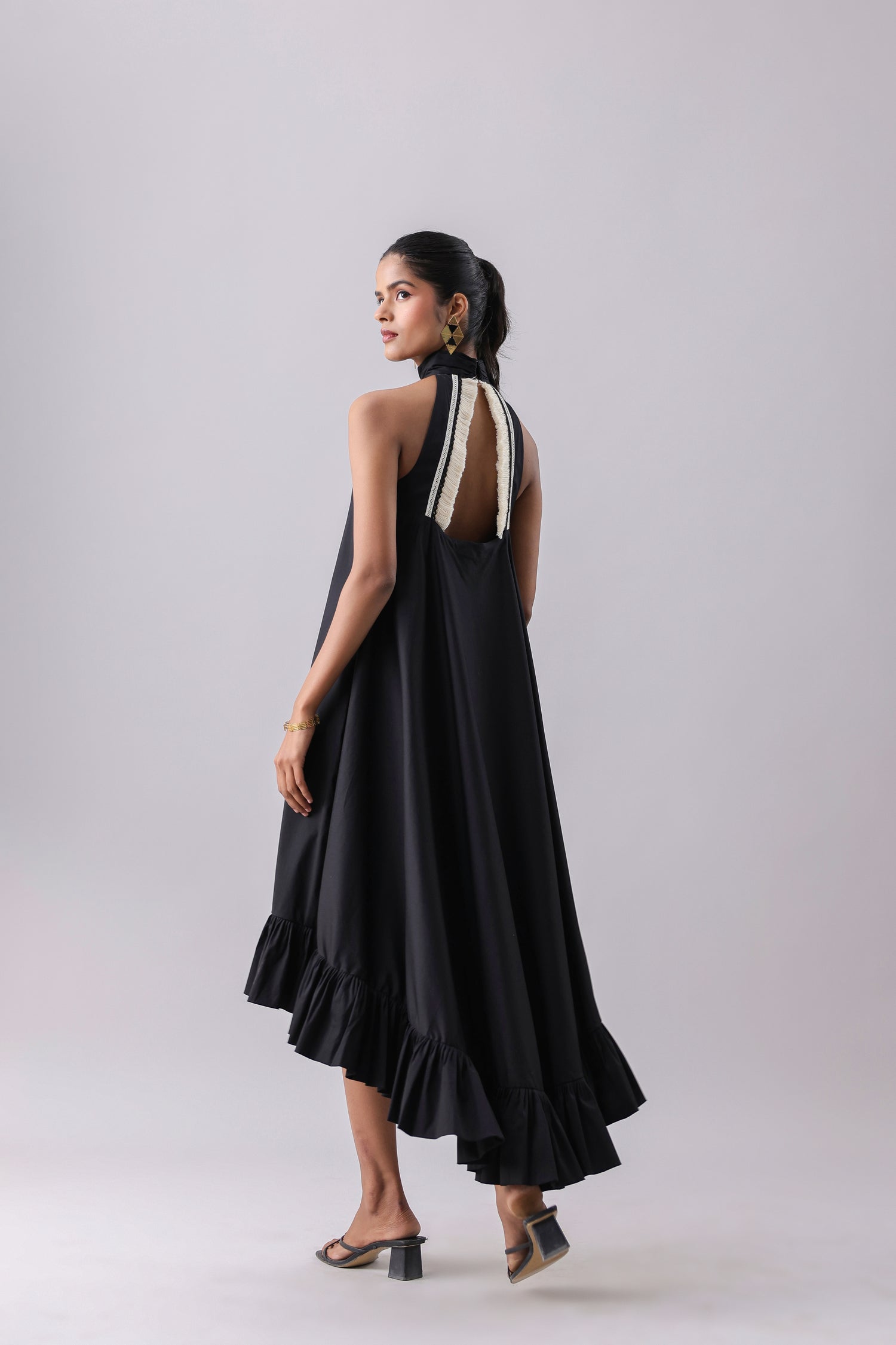 Halter Flounce Dress with a high-low detail and a cut-out lace back.