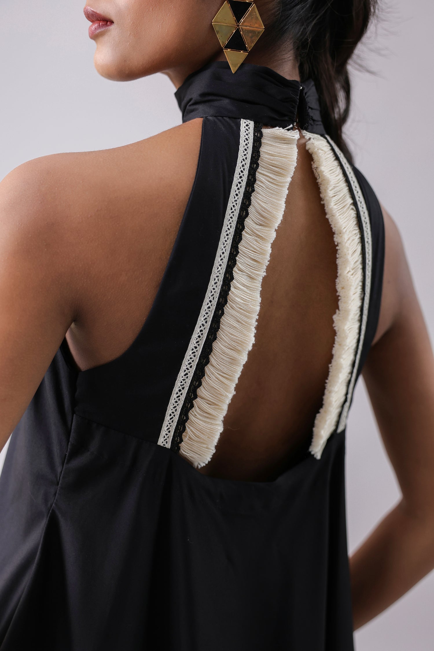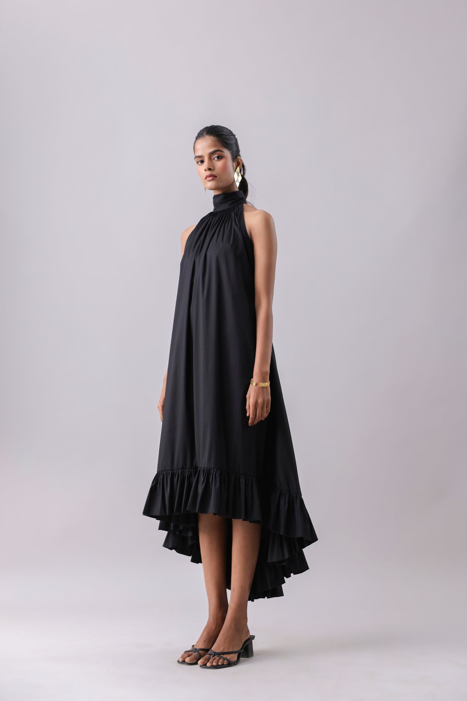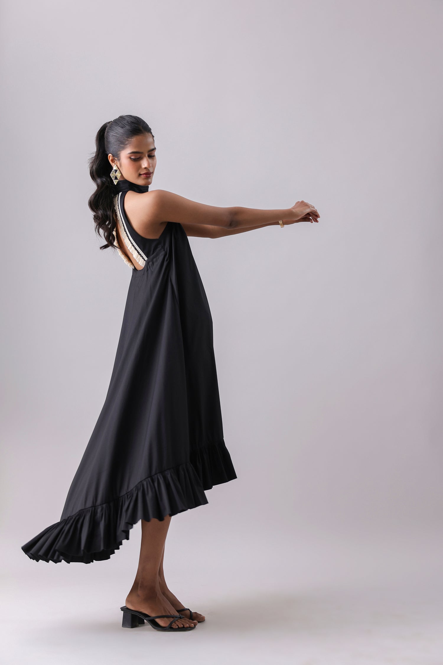 Halter Flounce Dress with a high-low detail and a cut-out lace back.