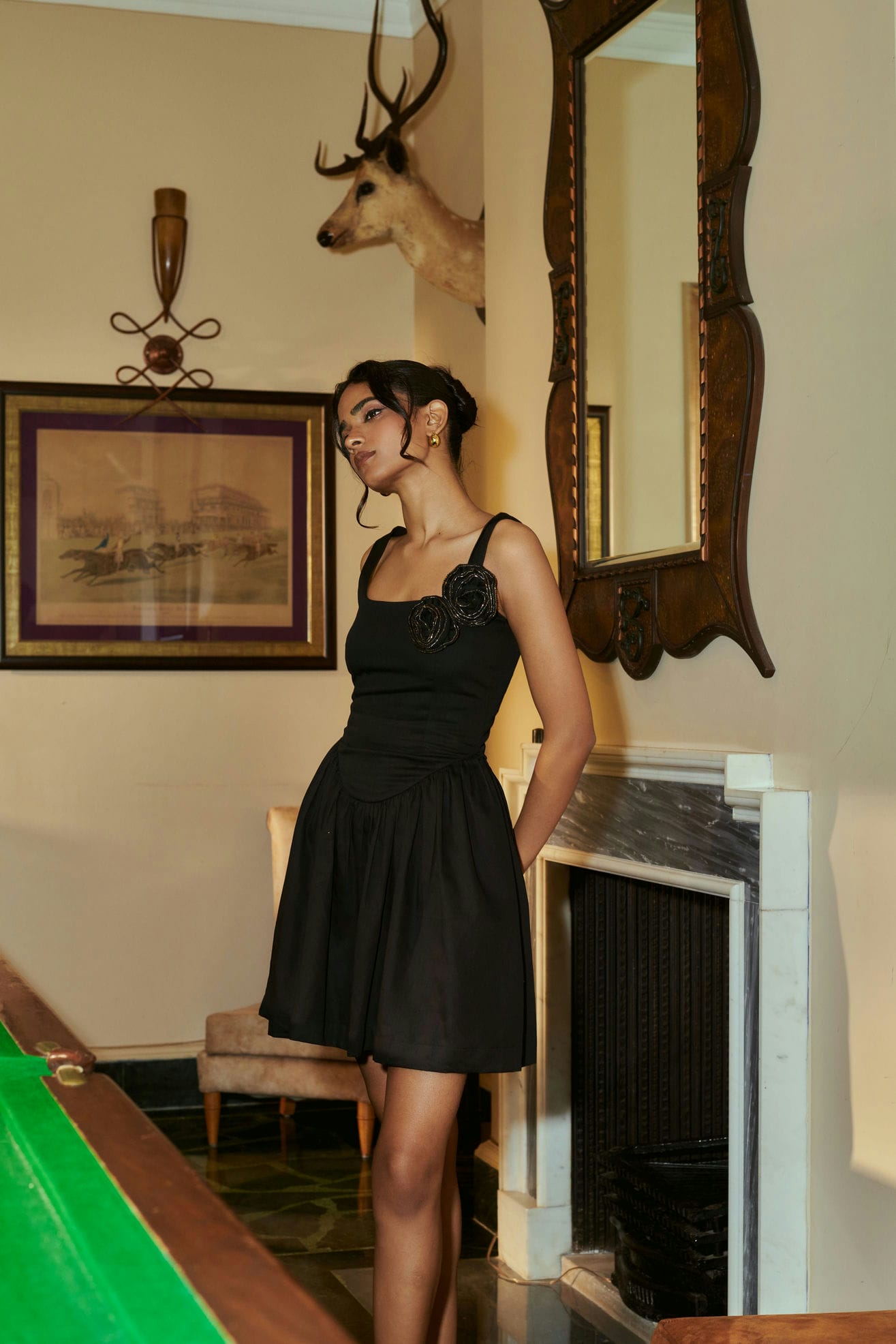 Drop-waist mini dress, featuring hand embroidered florets. Zipper fastening concealed in the back seam. Lined with premium cotton.