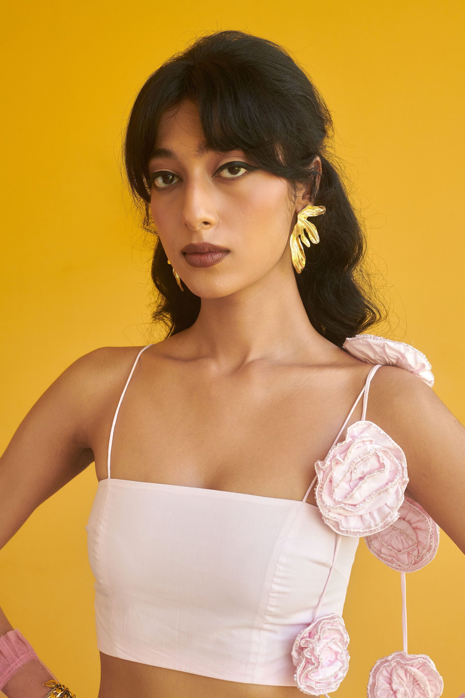 Crop top featuring our embellished Florets attached to a strap. Straight neckline with thin straps, lined with premium cotton. Side zip fastening
