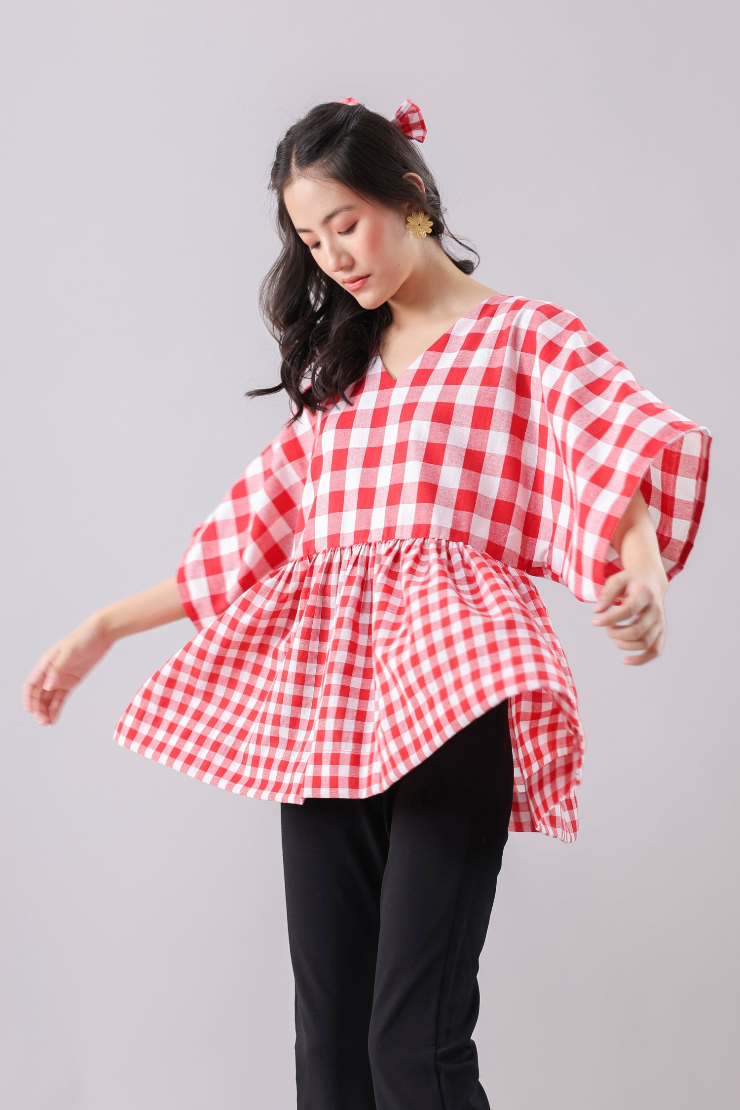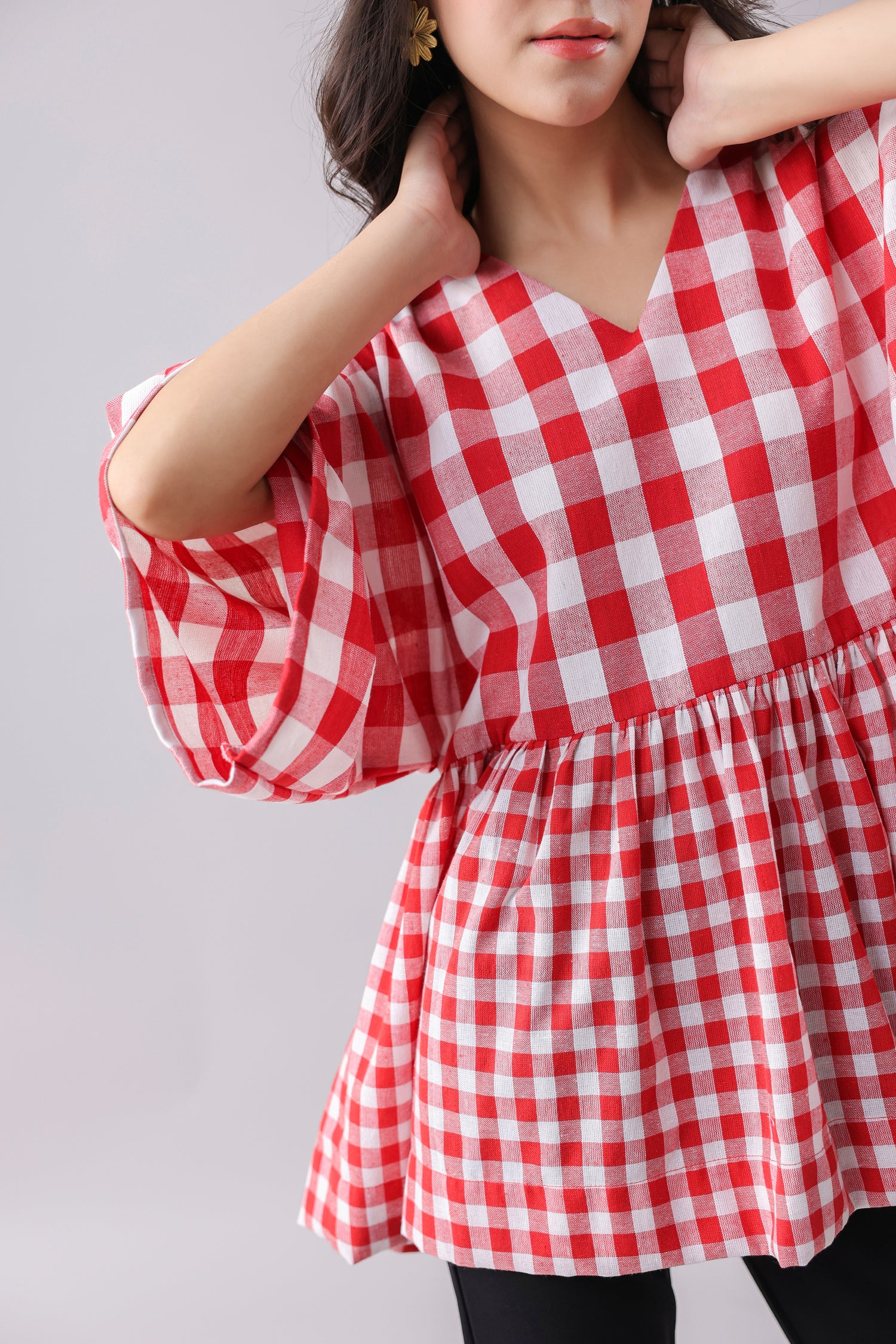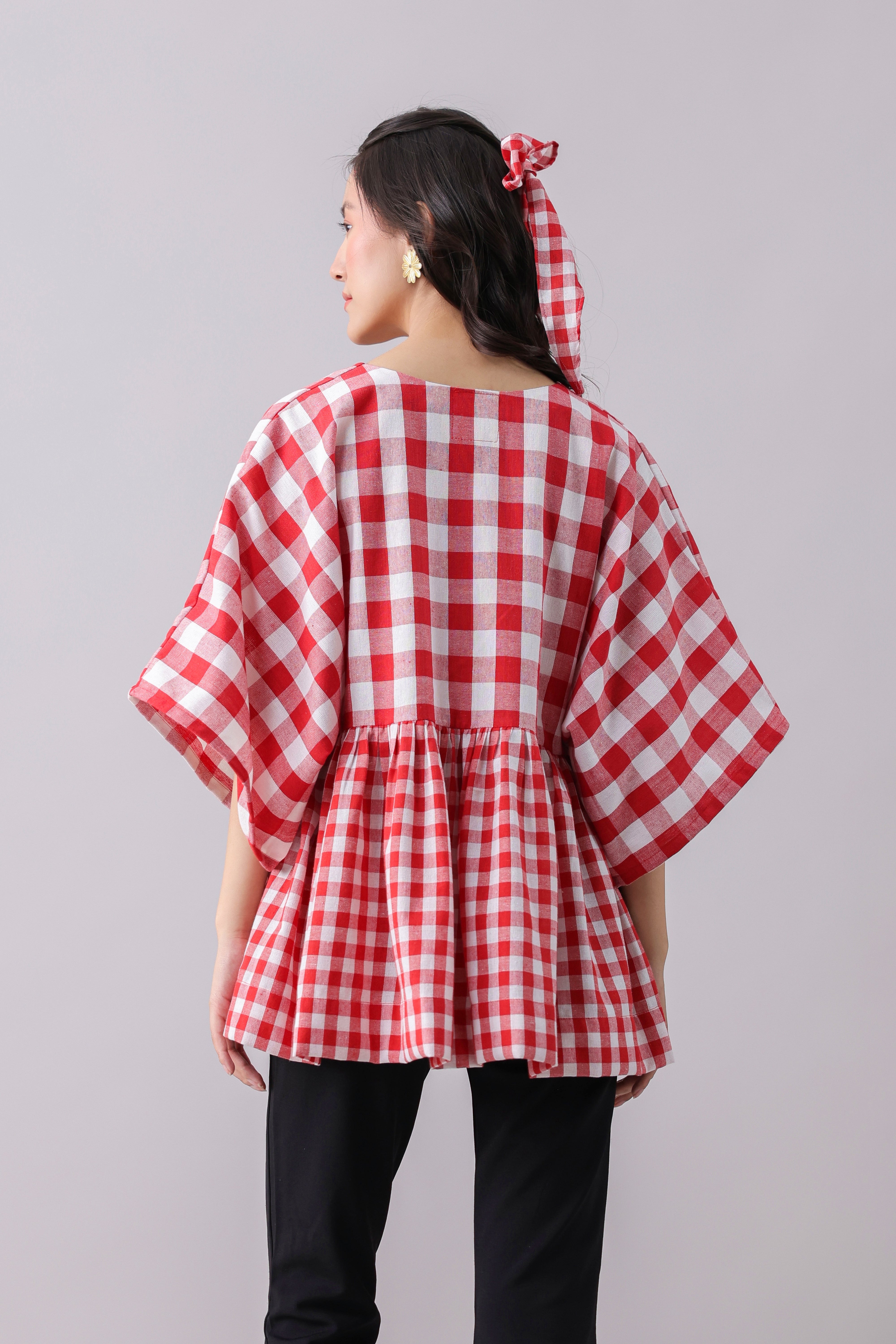 Gingham print Kimono-style top.
