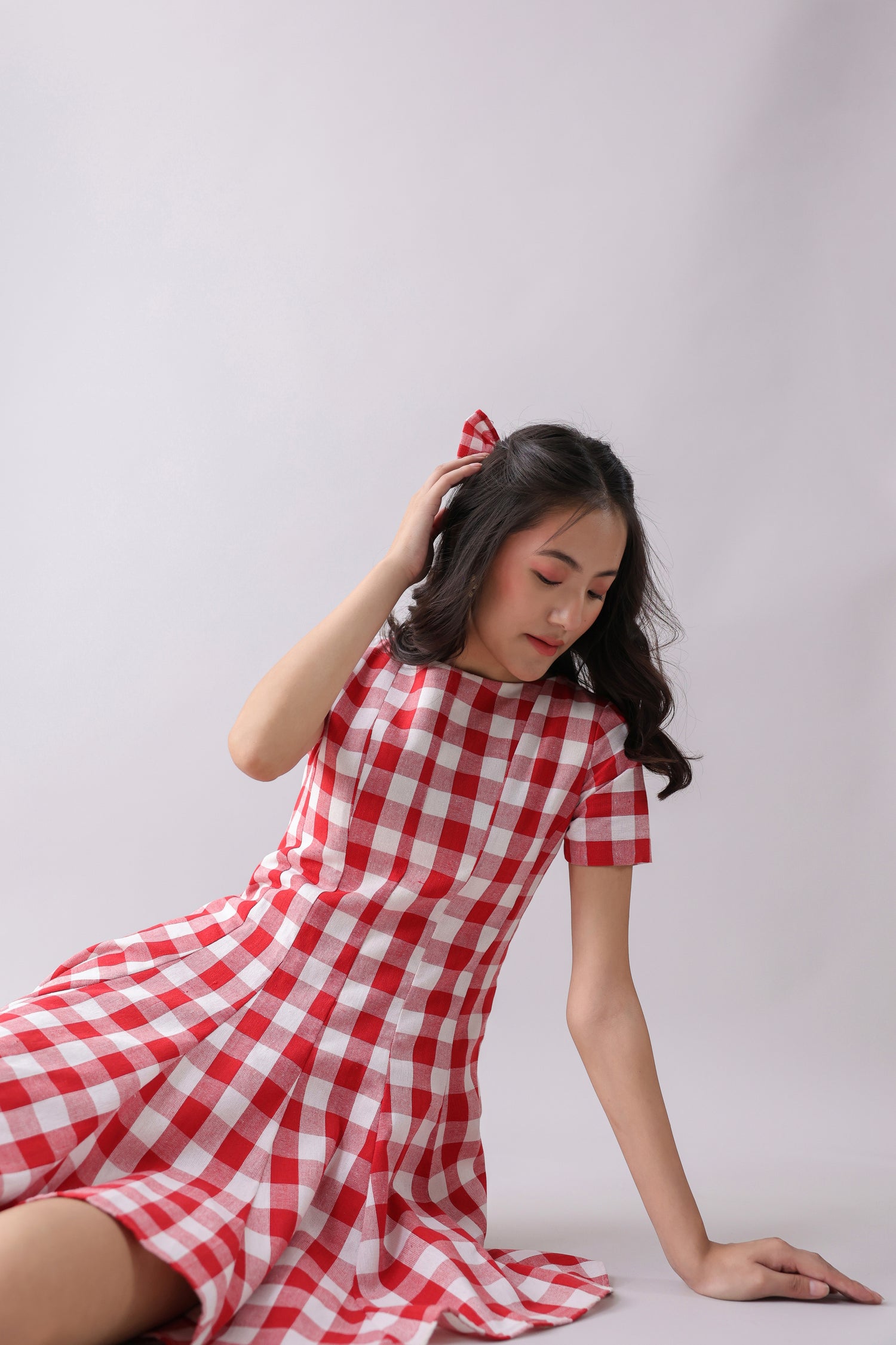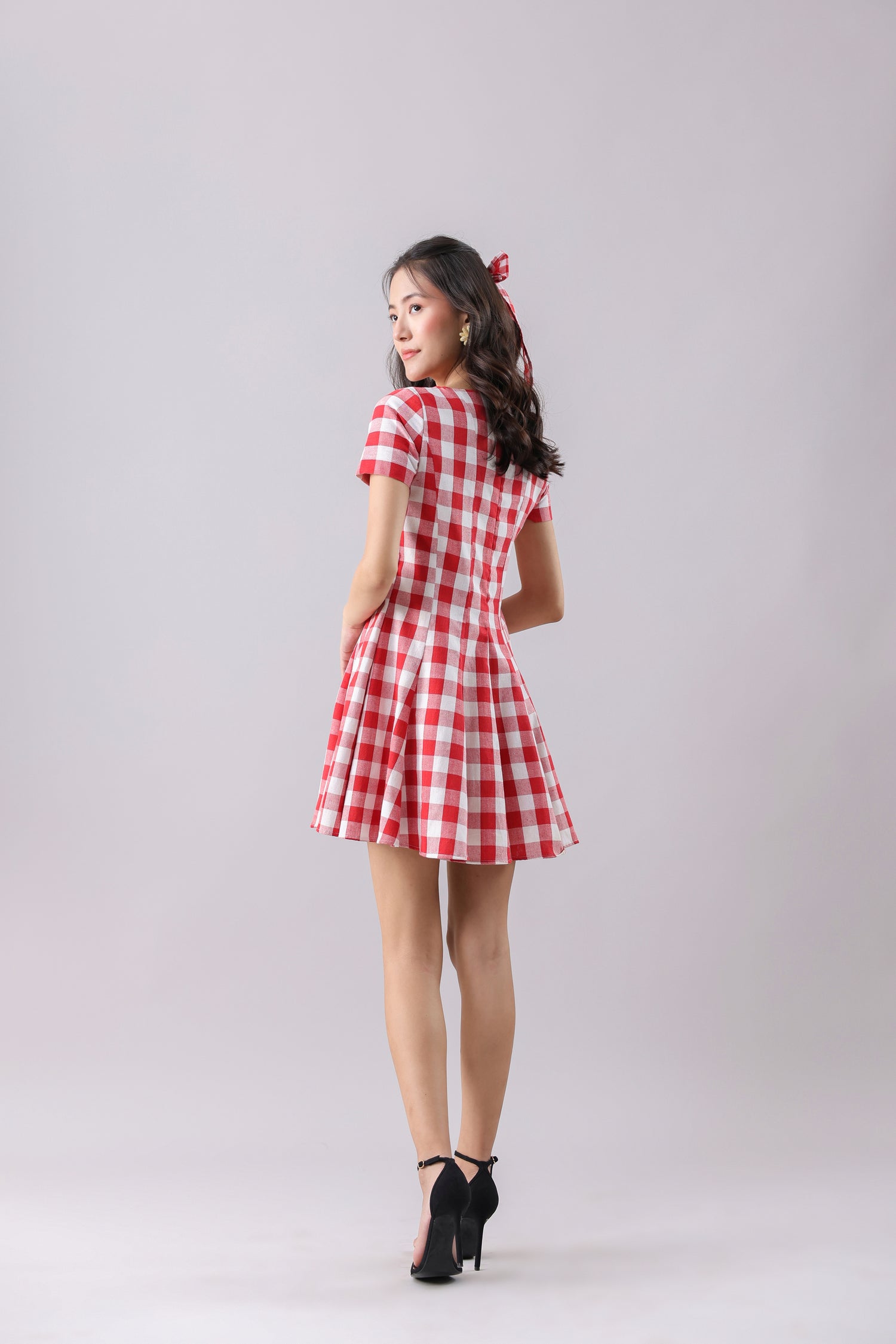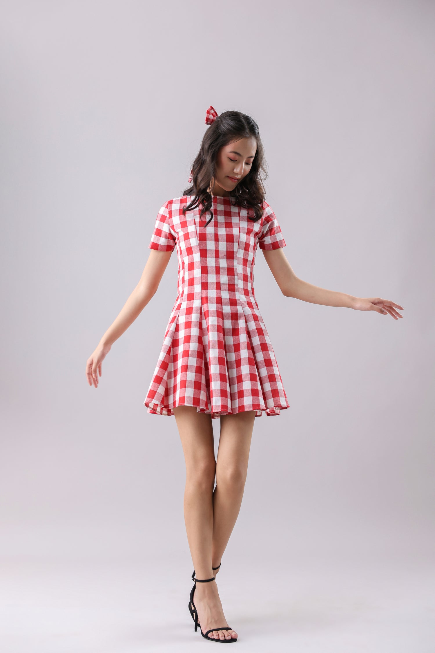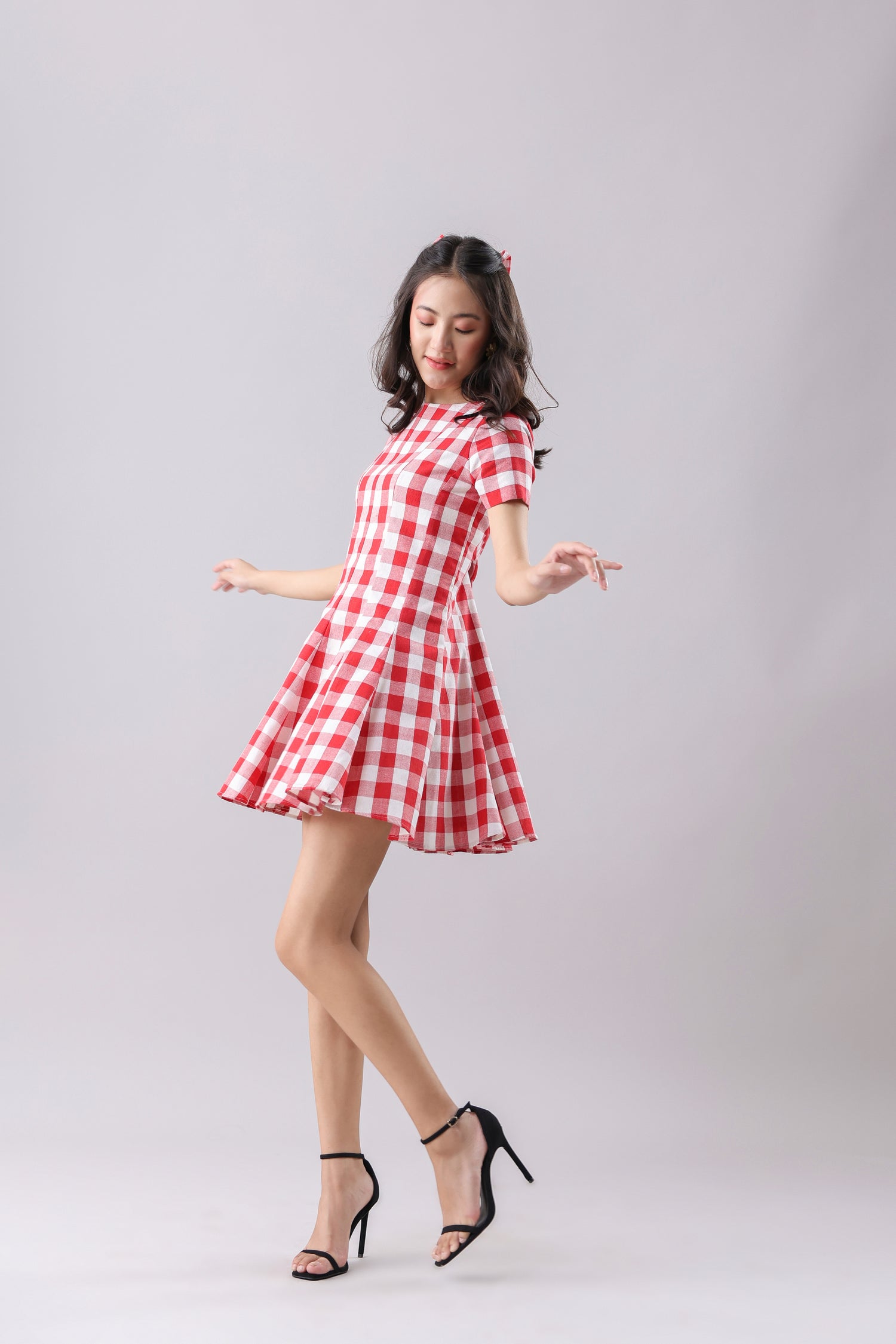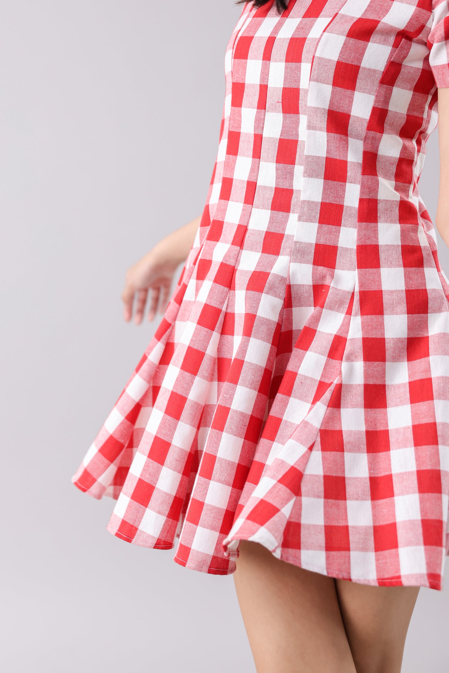Flared mini dress with panels, round neckline and short sleeves. Featuring a fit and flare look, back zipper closure concealed in the seam. Smooth lightweight cotton lining inside.