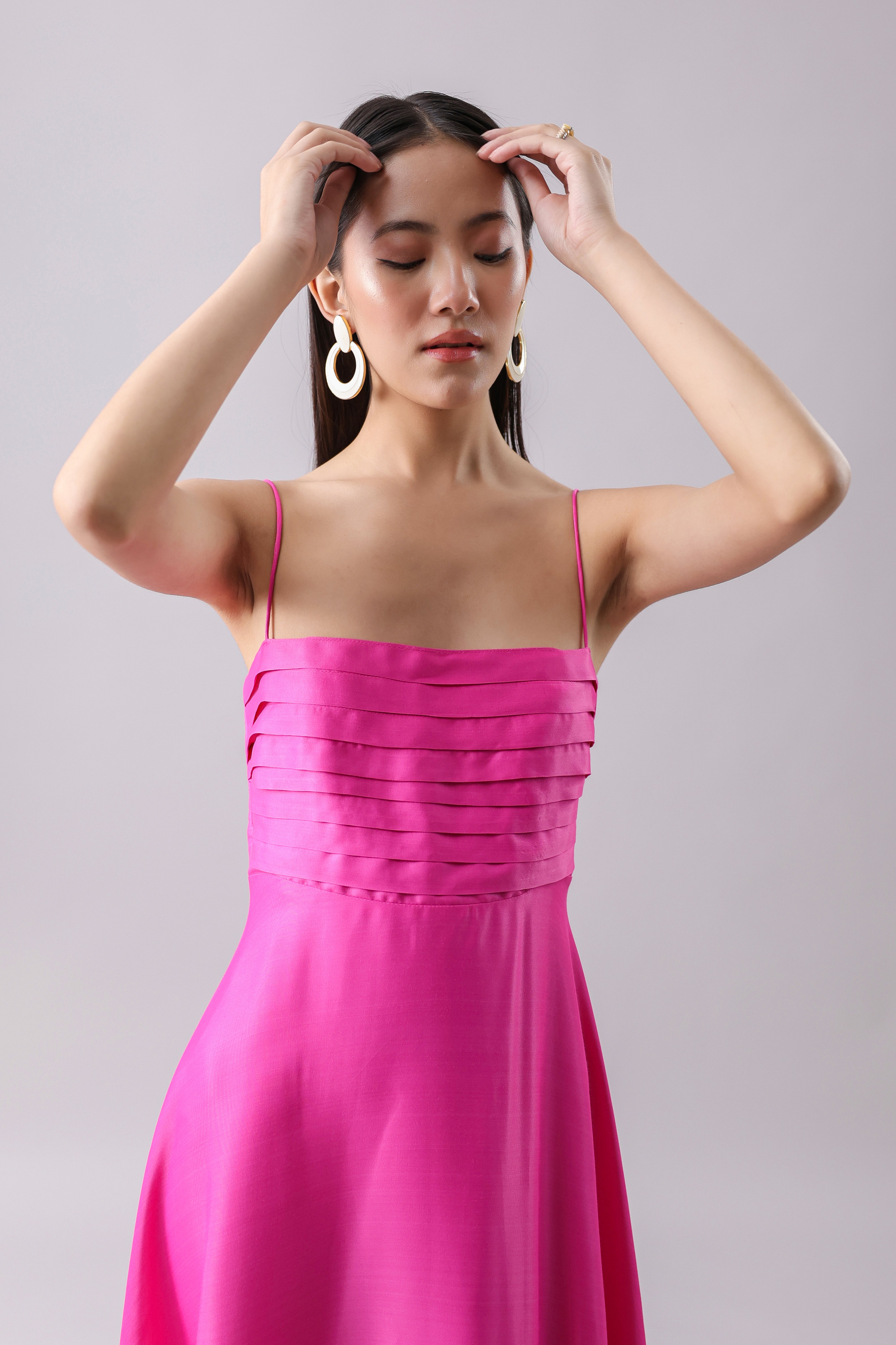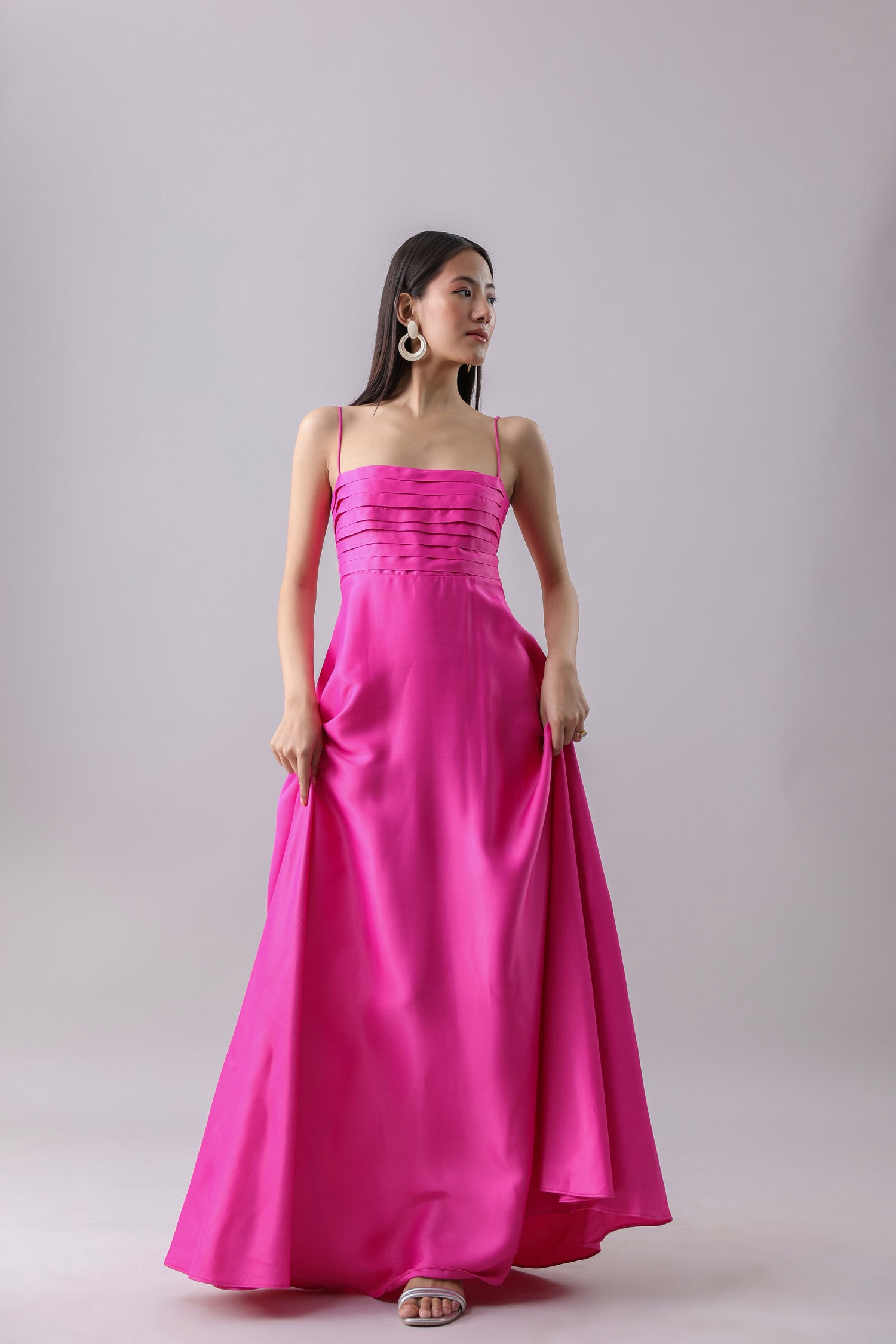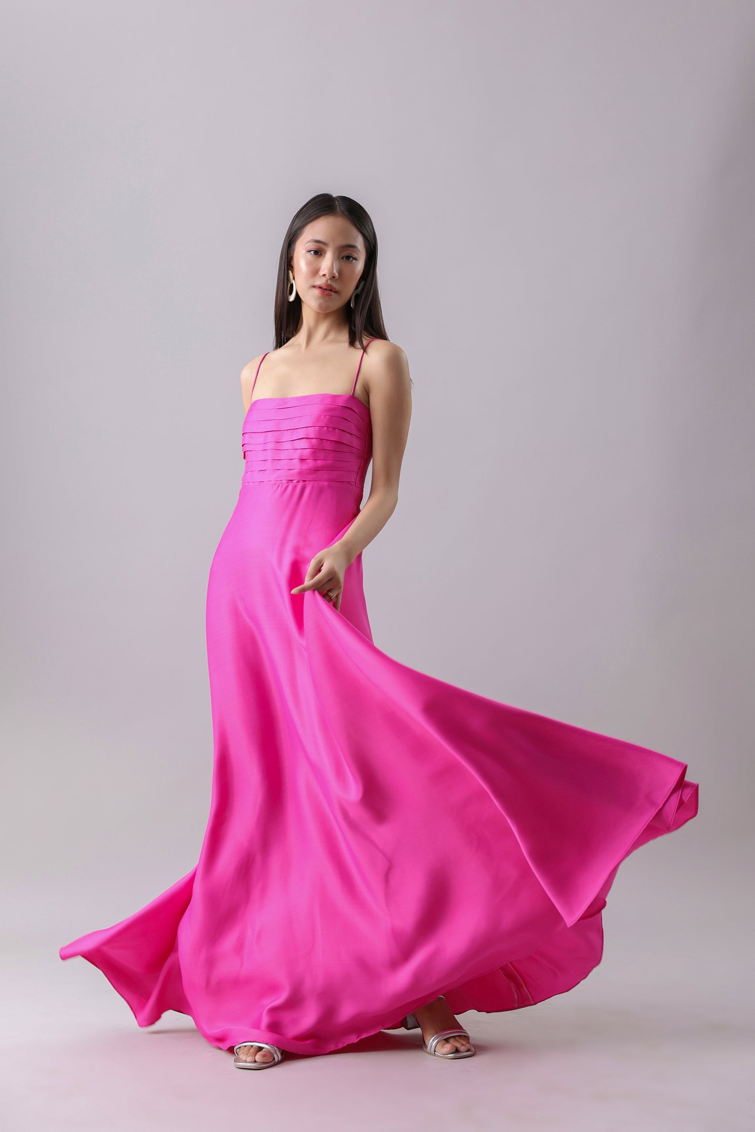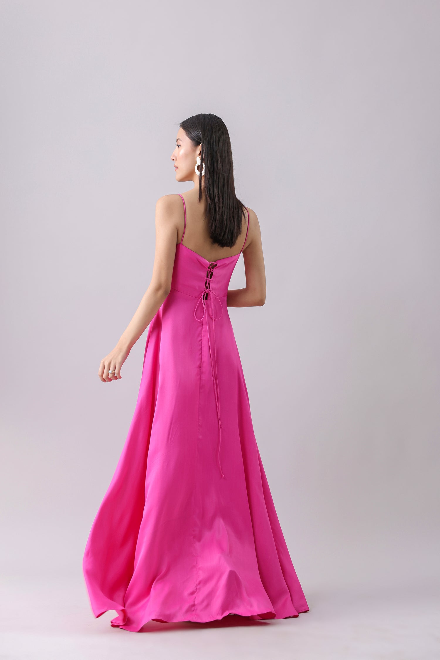 Satin gown with a pleated top and a drawstring back-tie detail, this ensemble is ideal for elevated stylish evenings out.