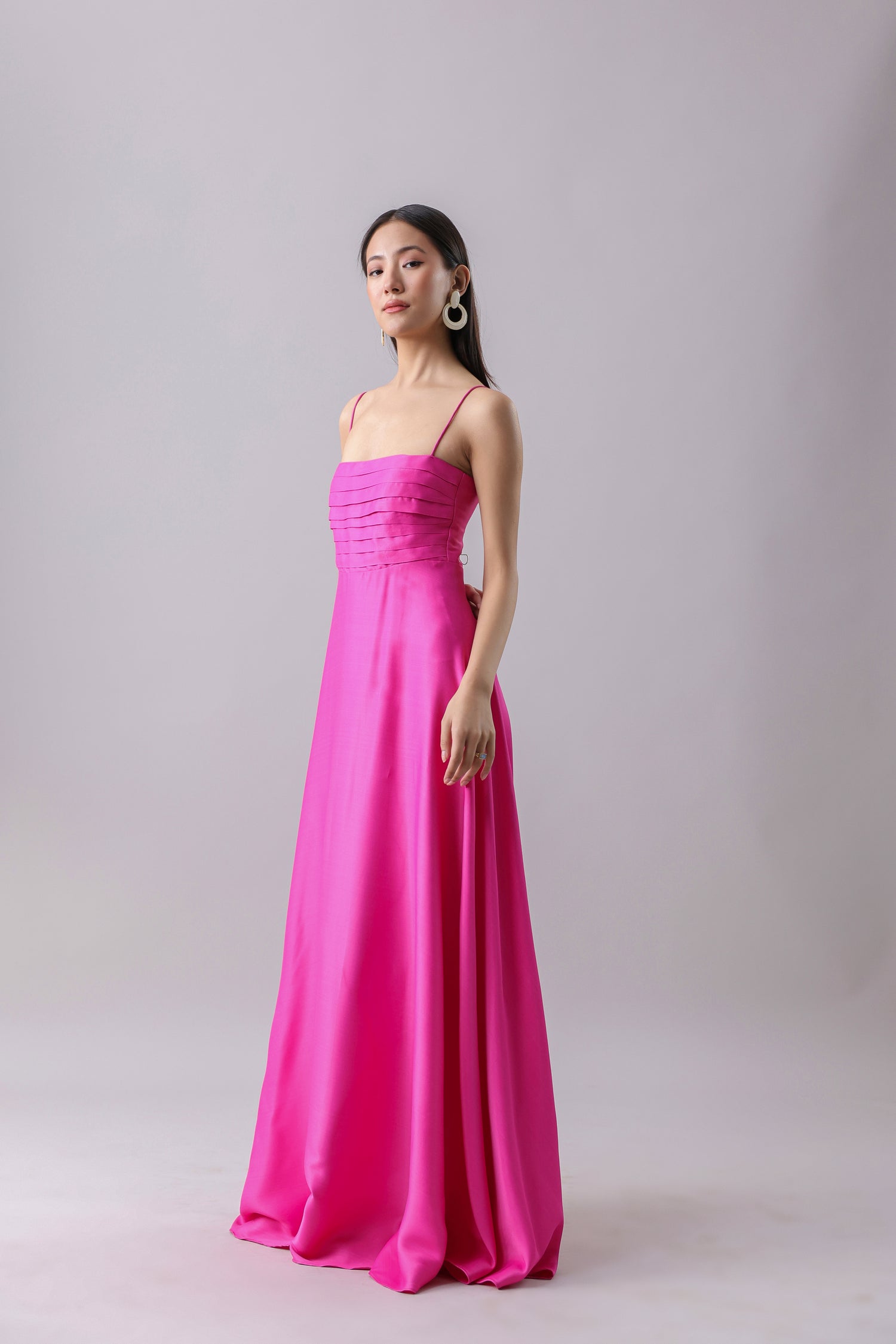 Satin gown with a square neckline and thin straps. Featuring a pleated top and bias skirt, and a tie back detail. Hidden zipper closure at the back.