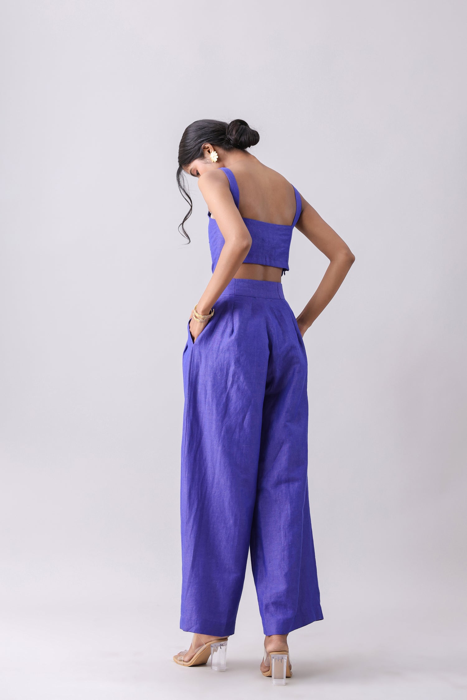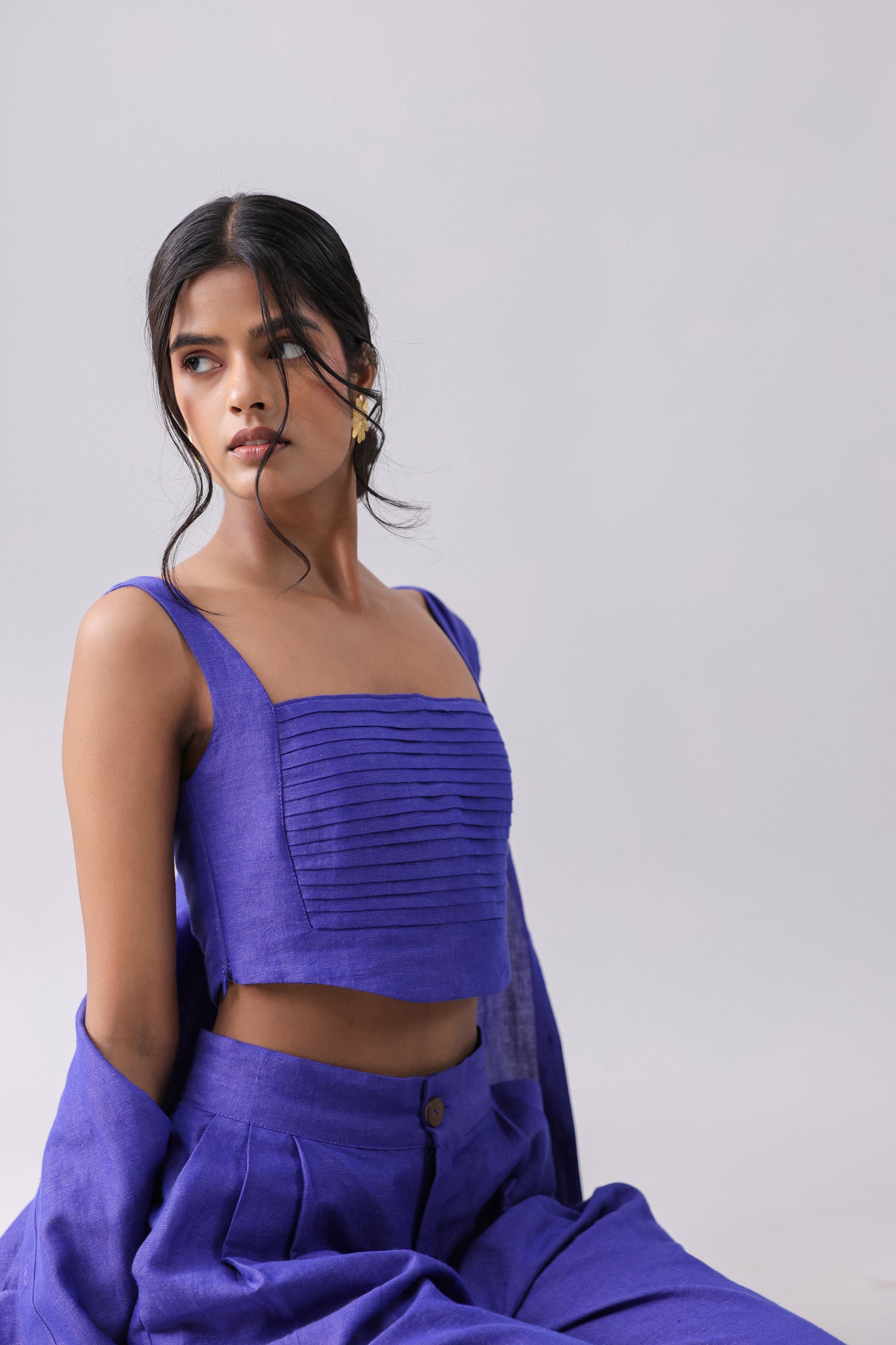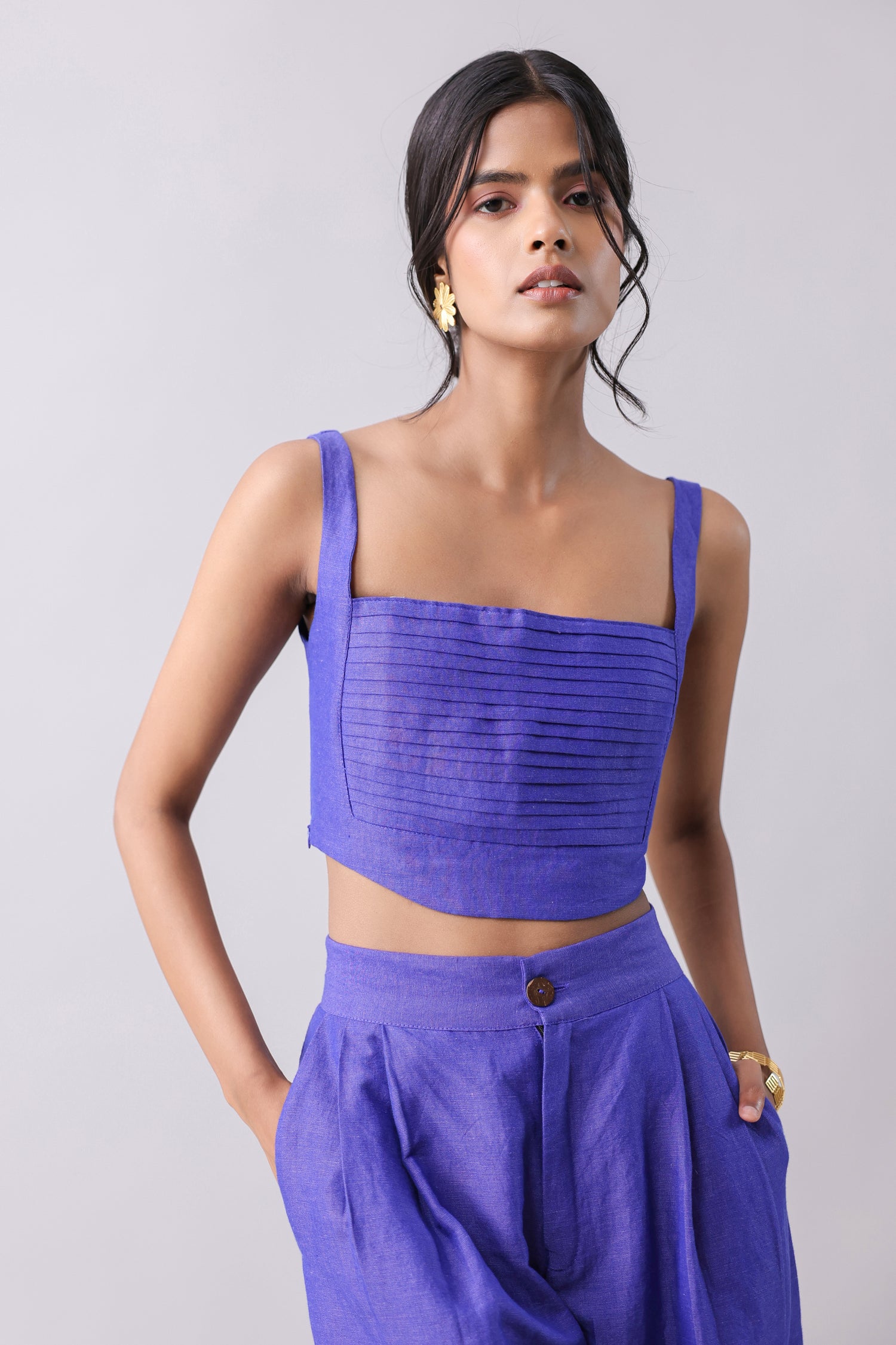 Crop top with a straight neckline and wide straps. Featuring pin-tucks detail and asymmetric hem.