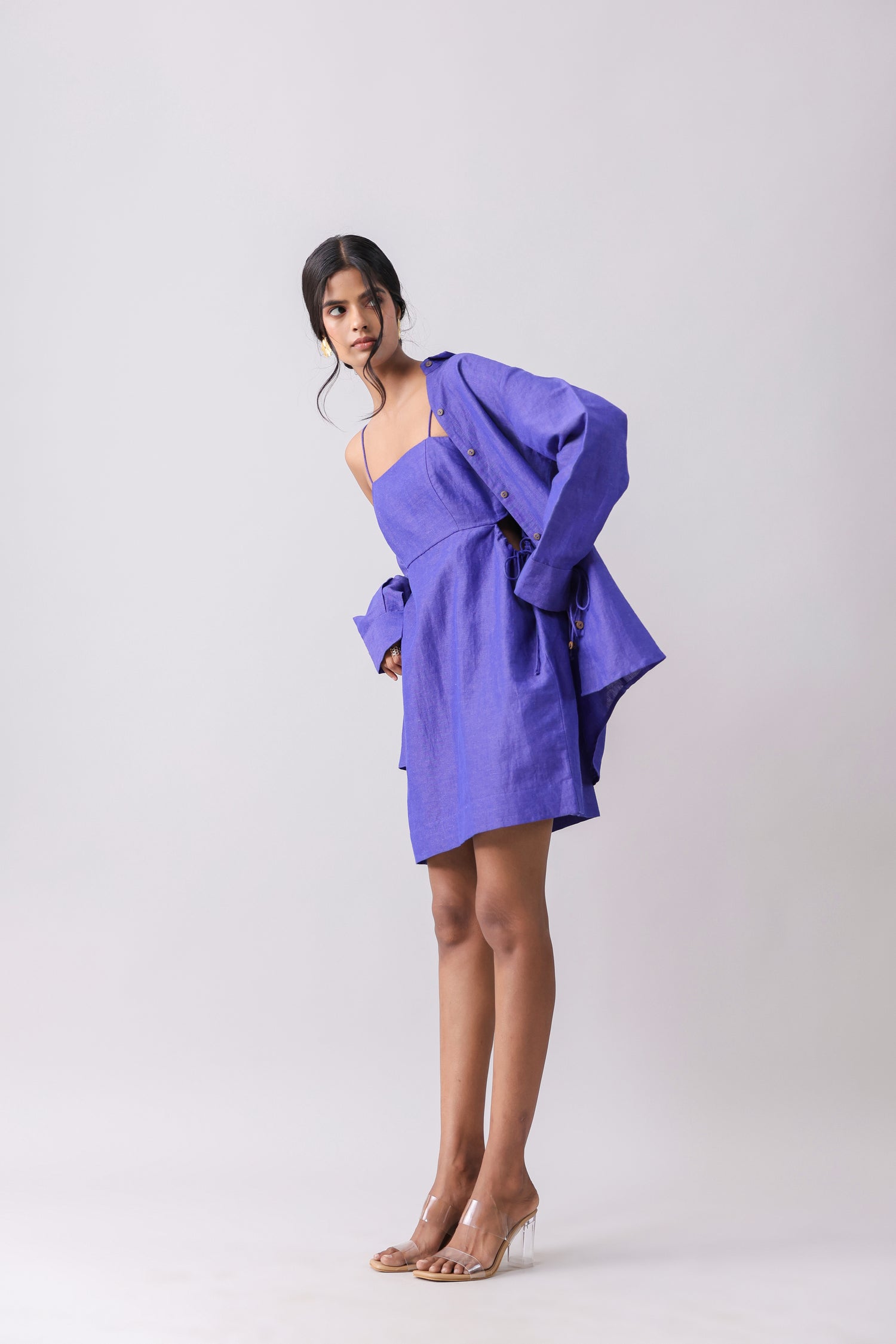 Playful cut-out mini dress with a drawstring detail, paired with a sensible oversized shirt.