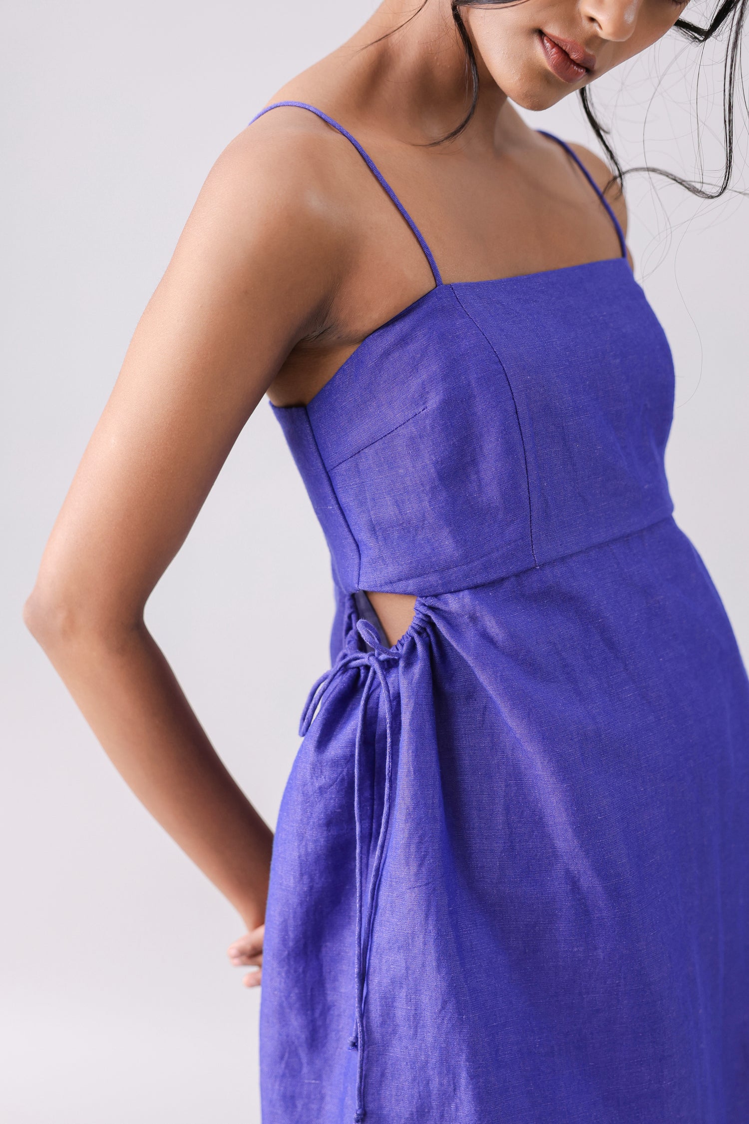 Mini dress with straight neckline and thin straps. Featuring cut-out details with a drawstring to adjust. Side zipper closure concealed in the seam.