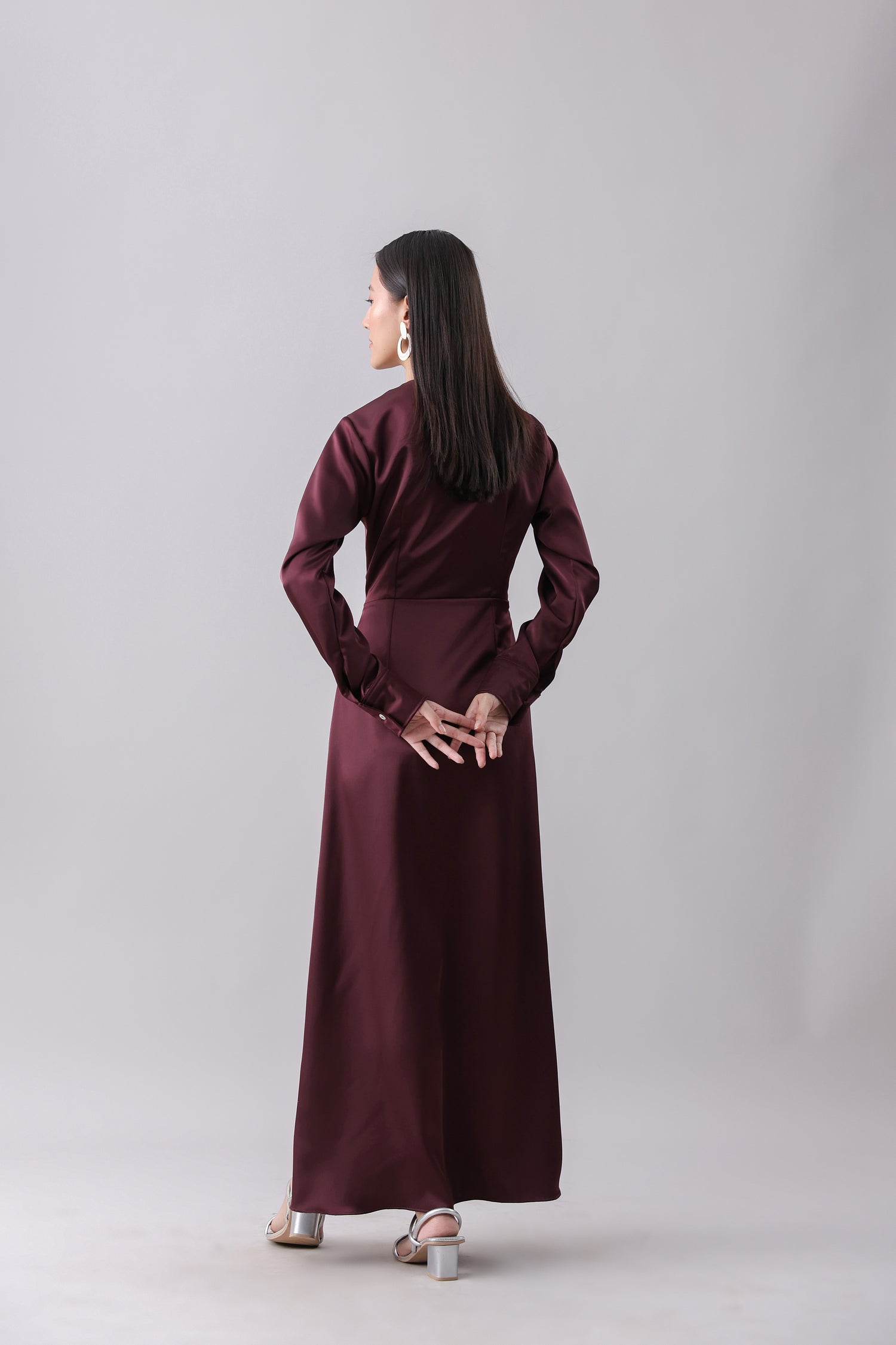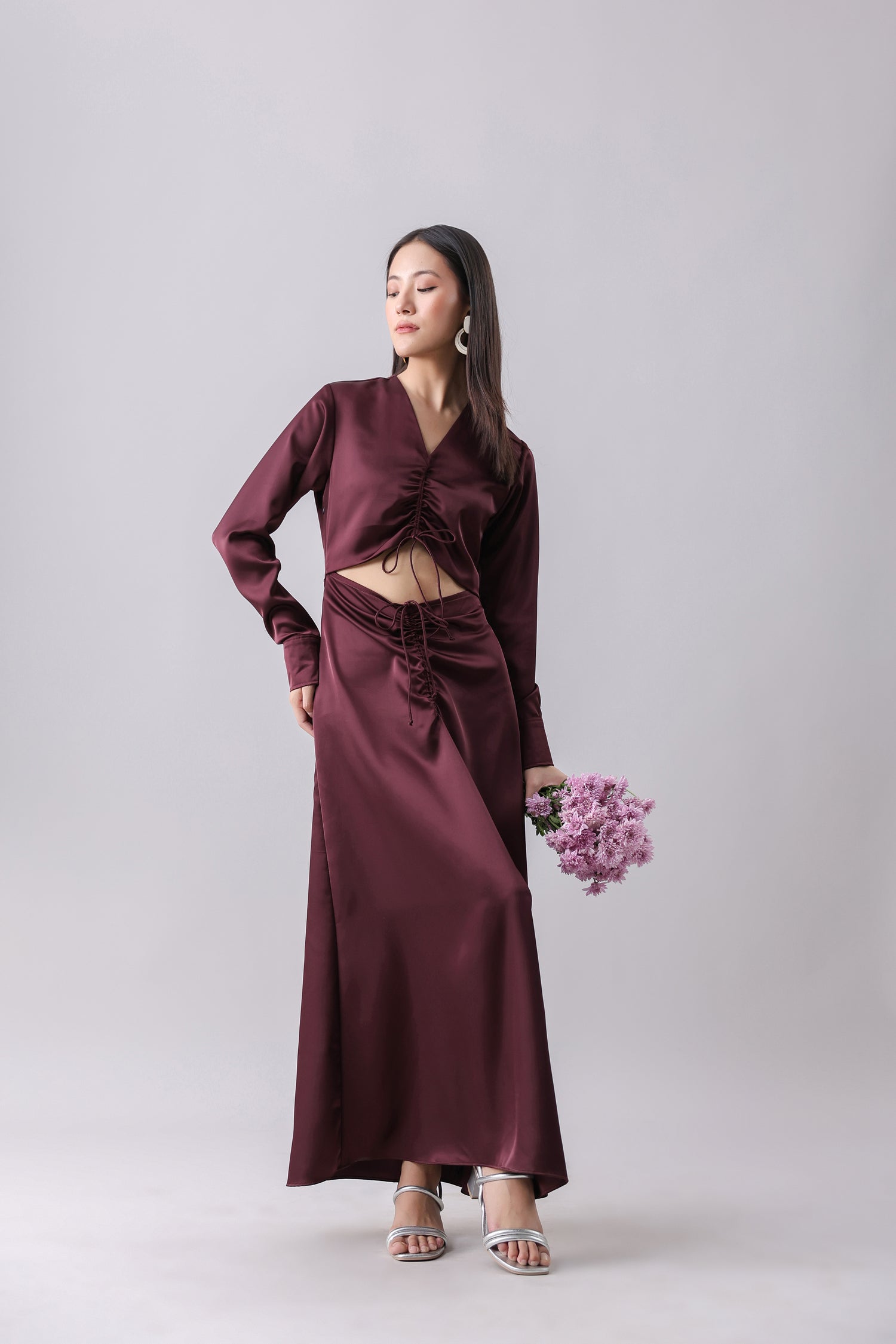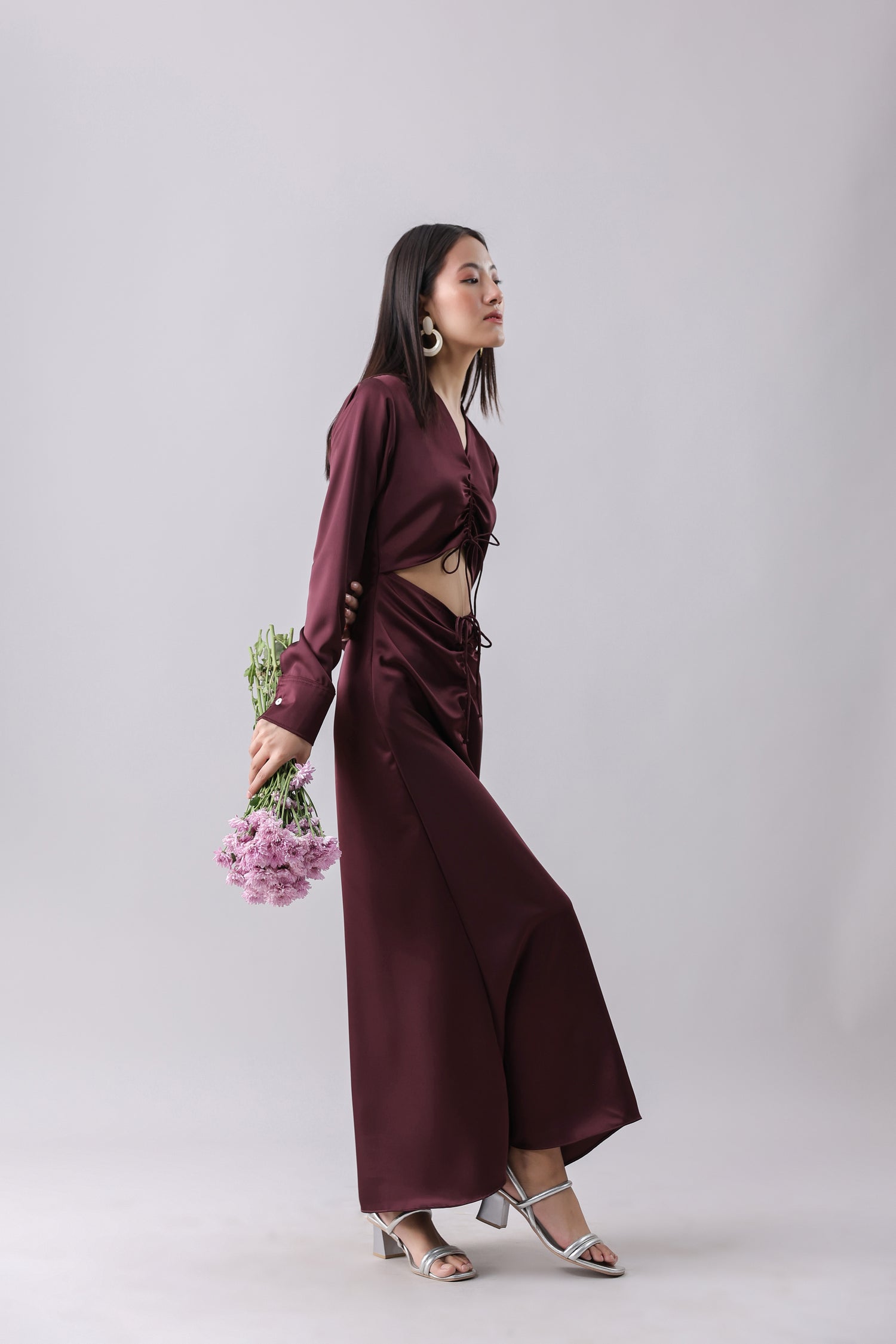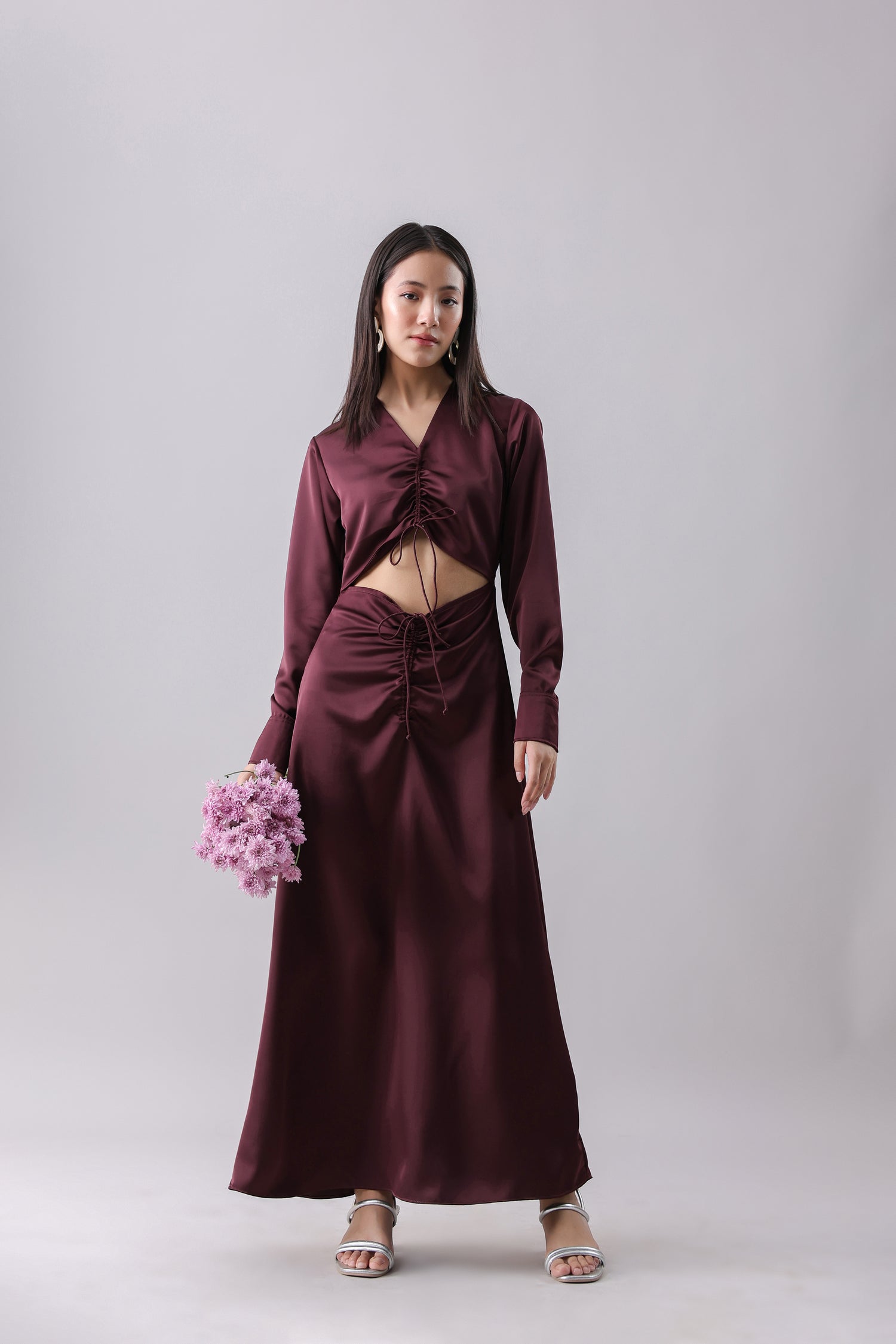 Satin gown with a V-neck and full sleeves. Featuring front cut-outs with adjustable drawstrings. Side zipper fastening hidden in the seam.