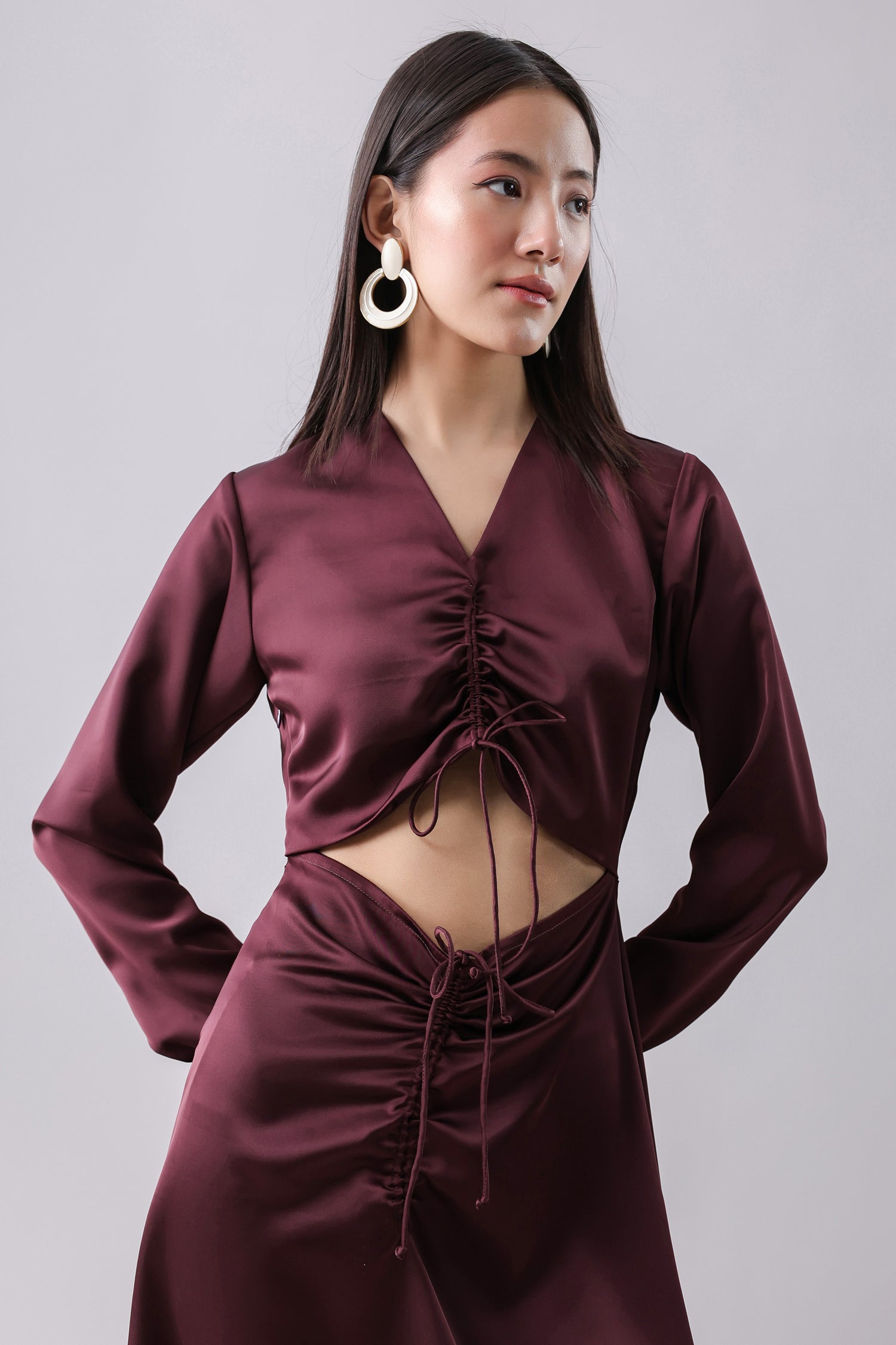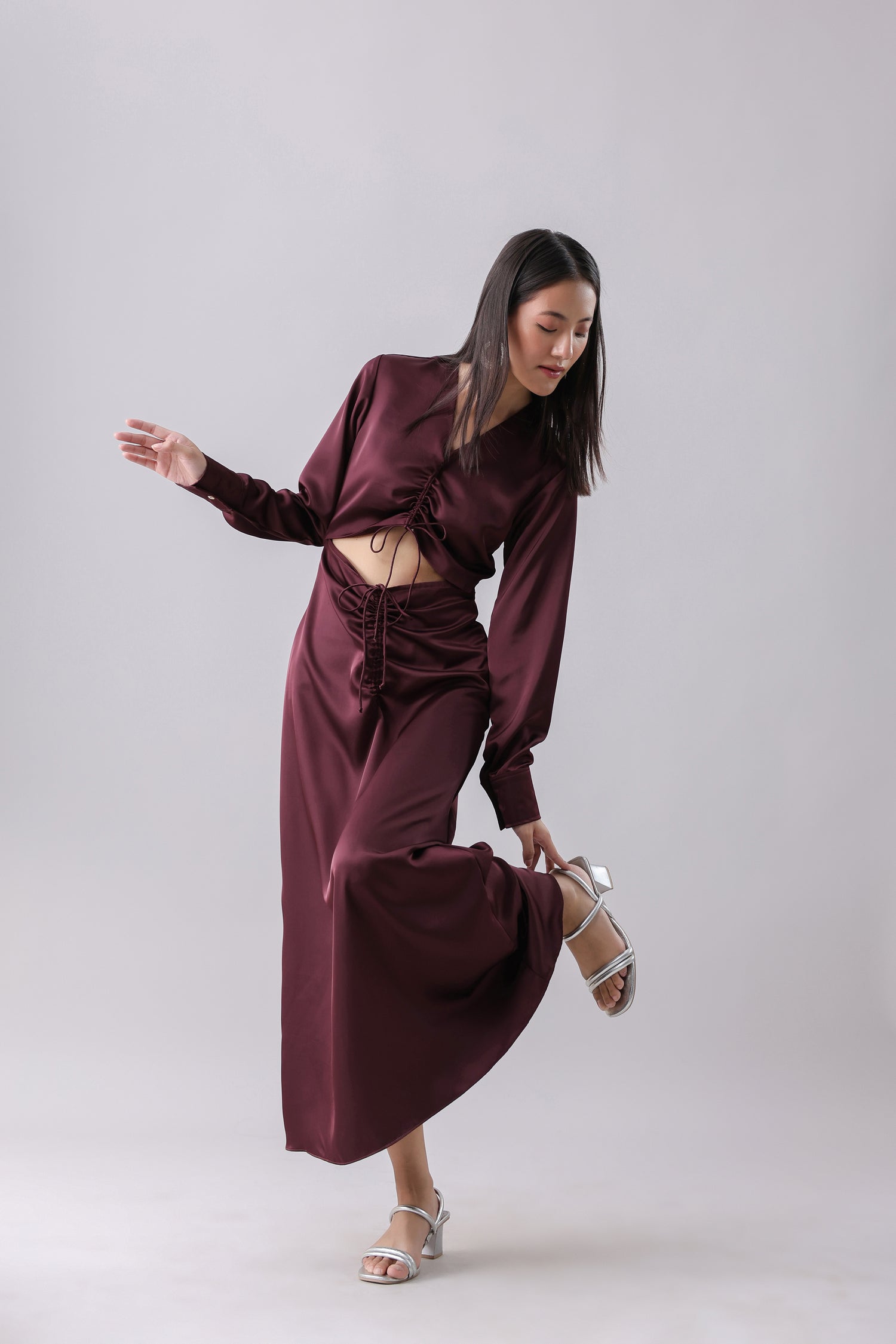 Satin maxi with an adjustable cut-out detail with drawstrings.