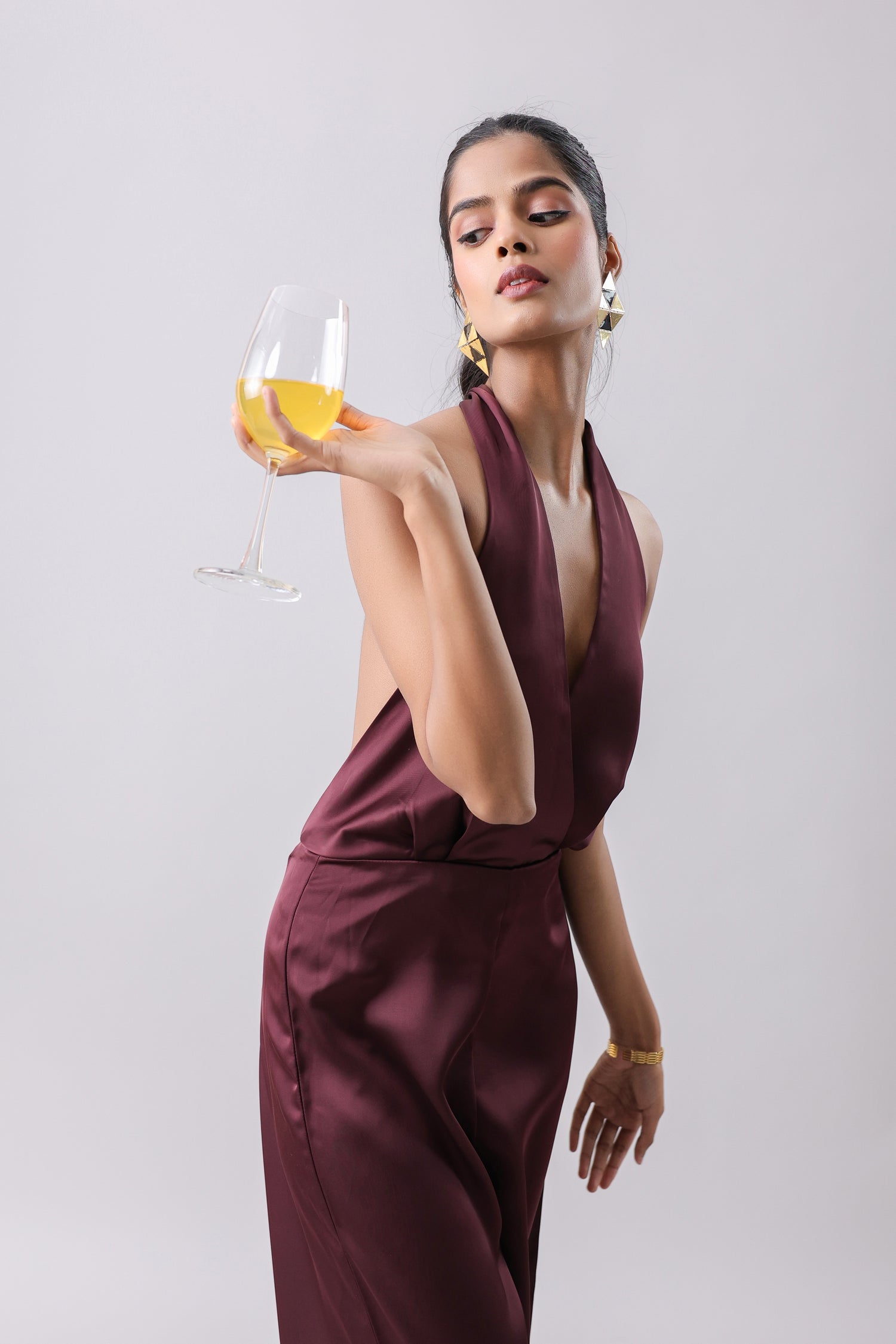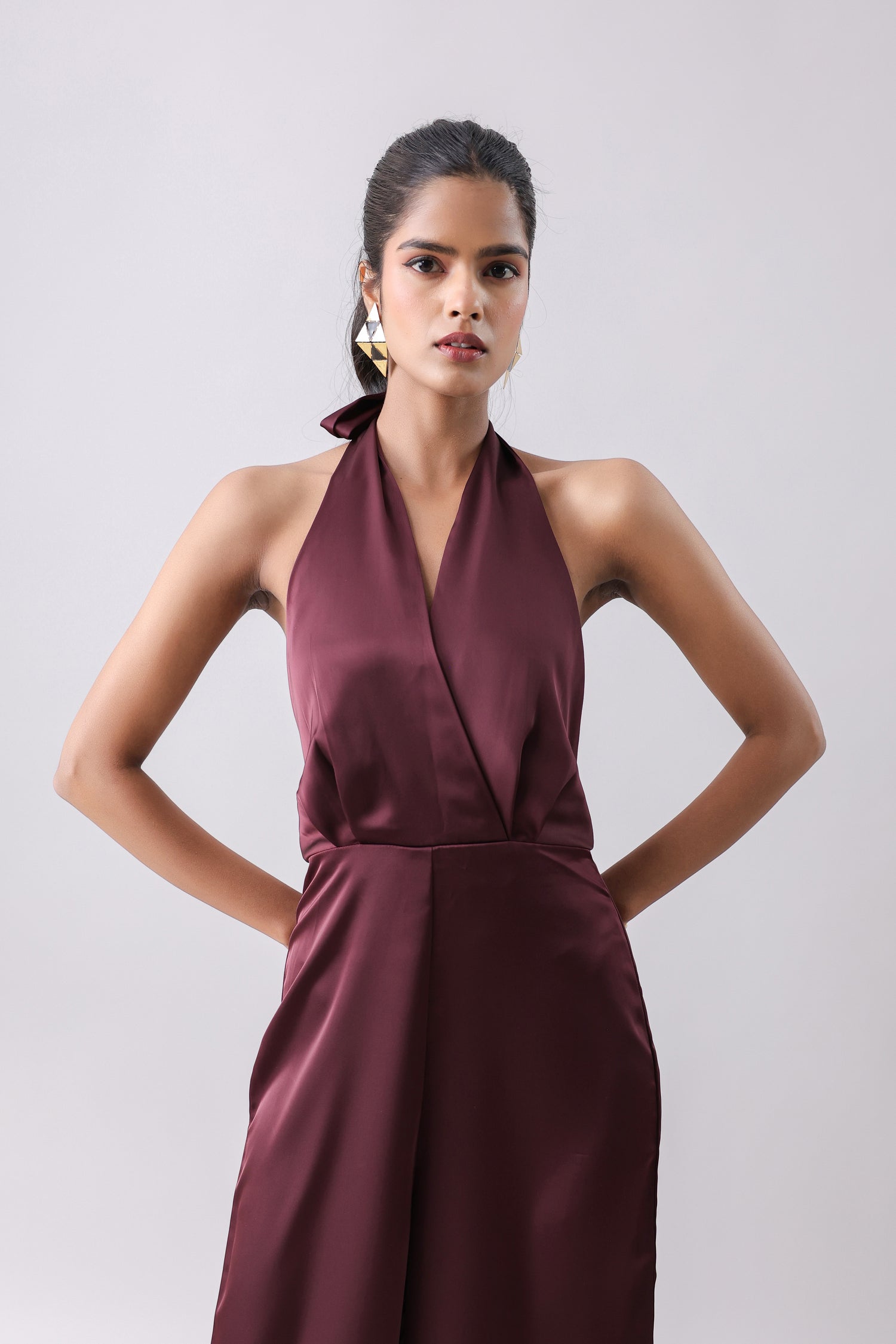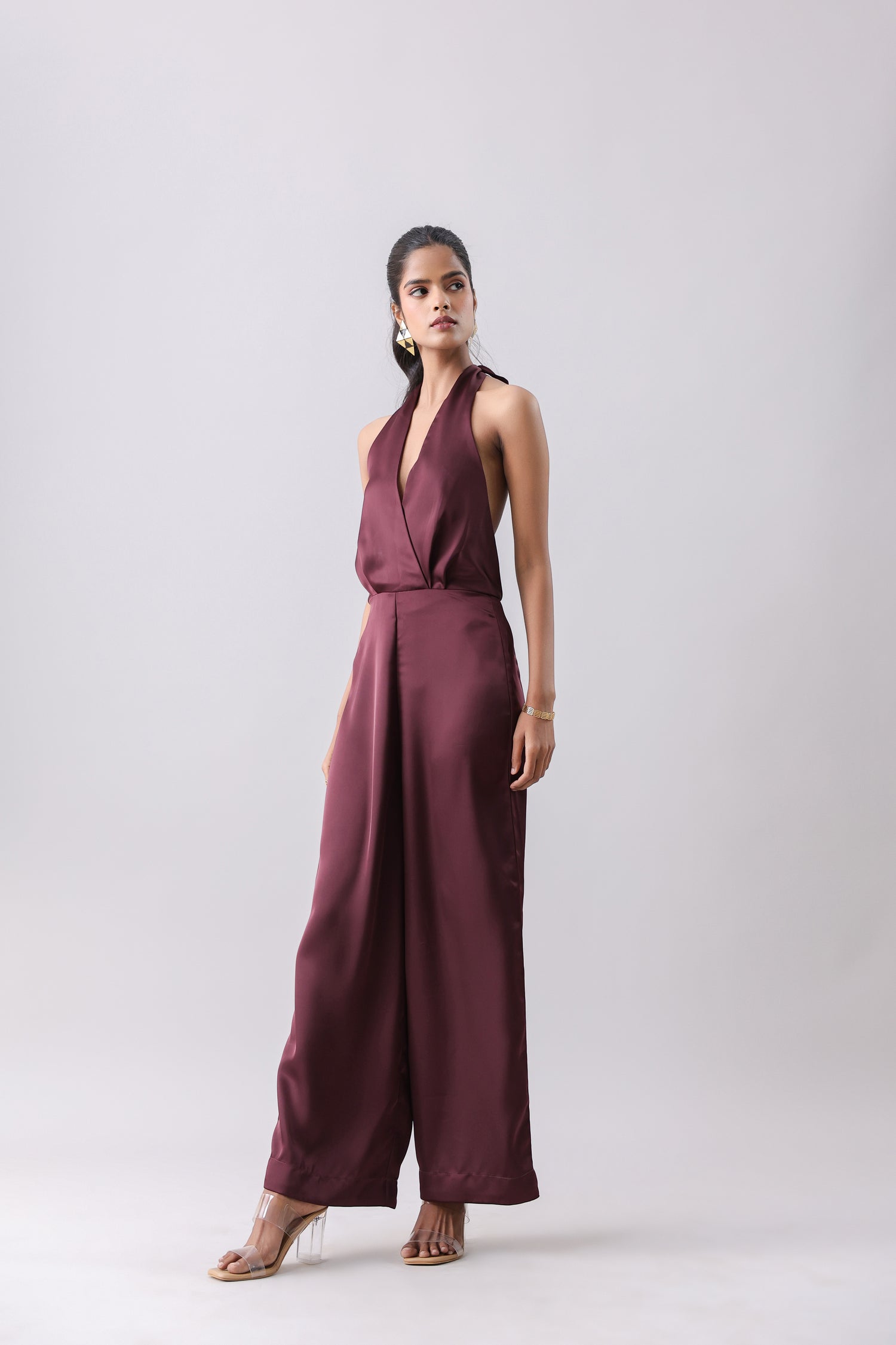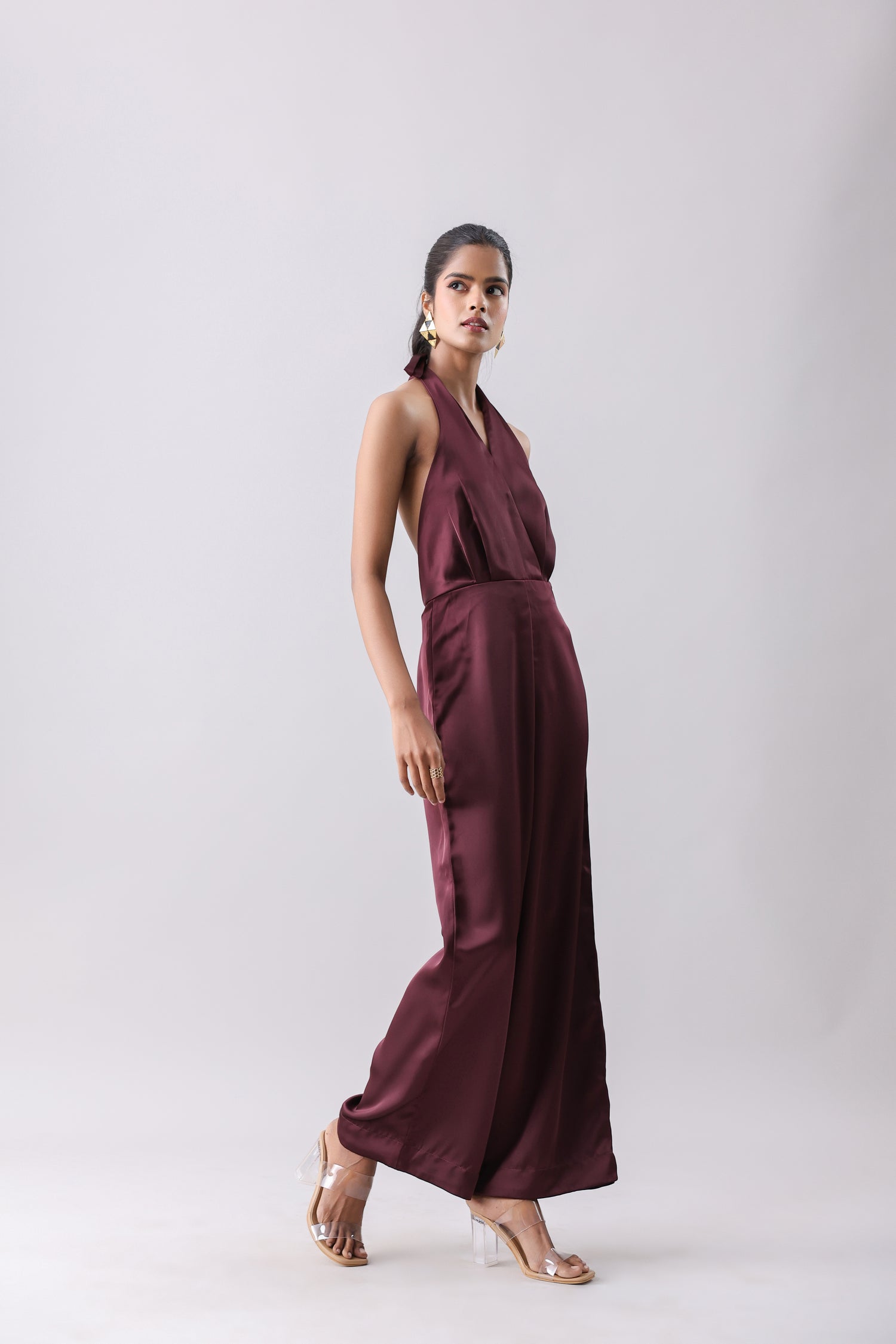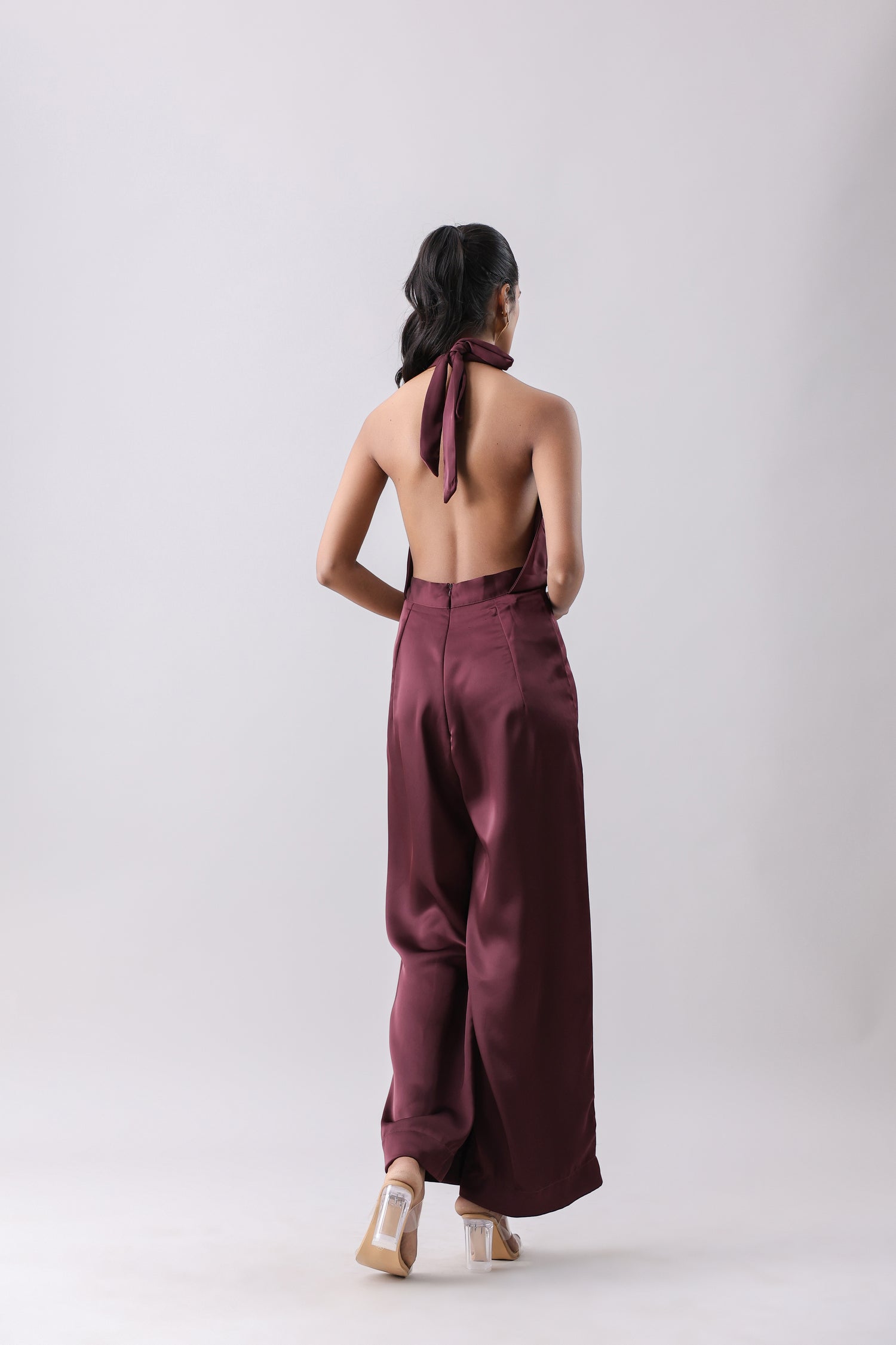 Satin backless jumpsuit with a halter neckline. Featuring a tie-up neck detail, and a back zipper closure.