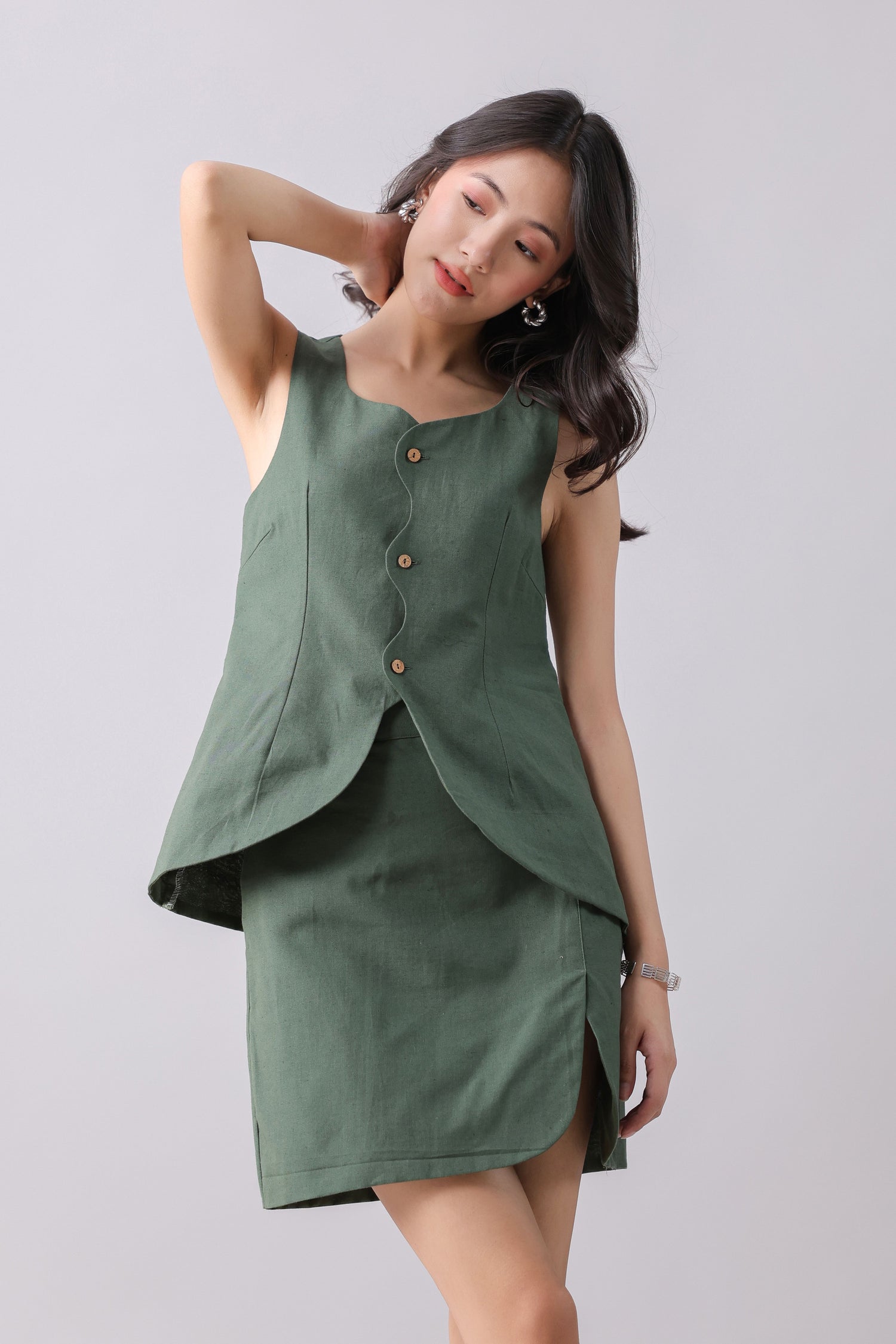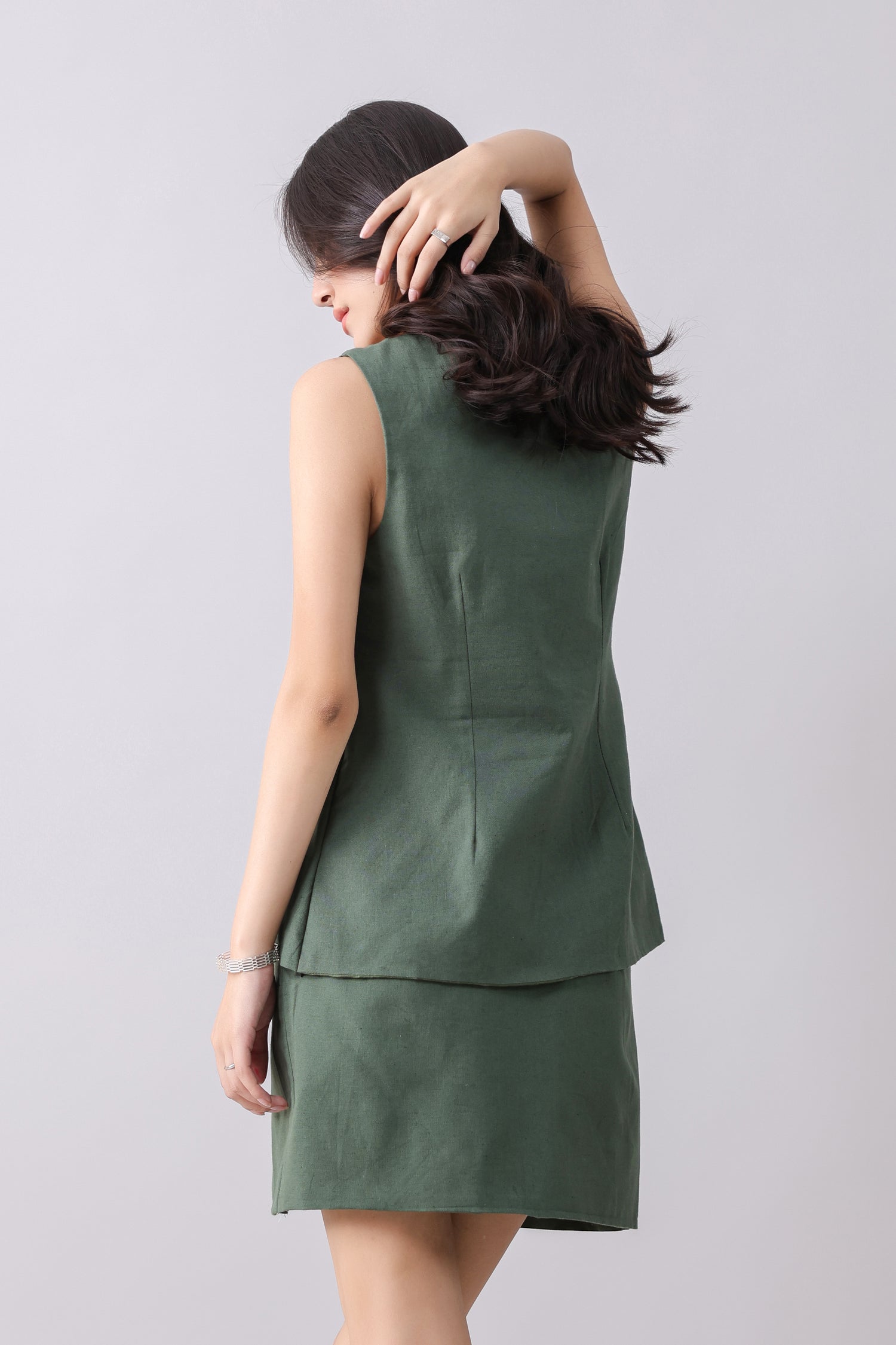 Green linen mini skirt.