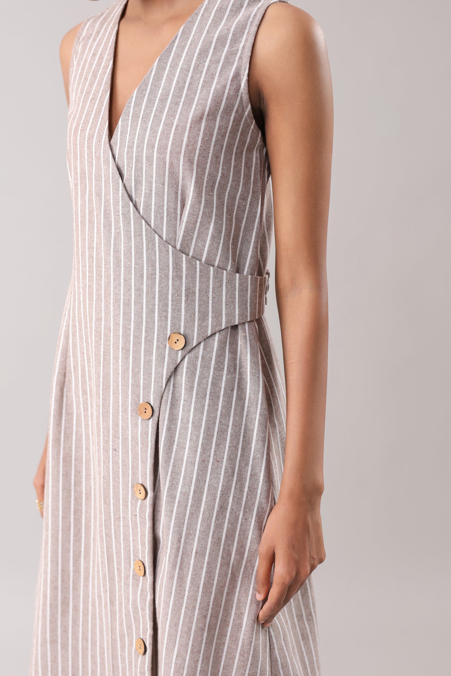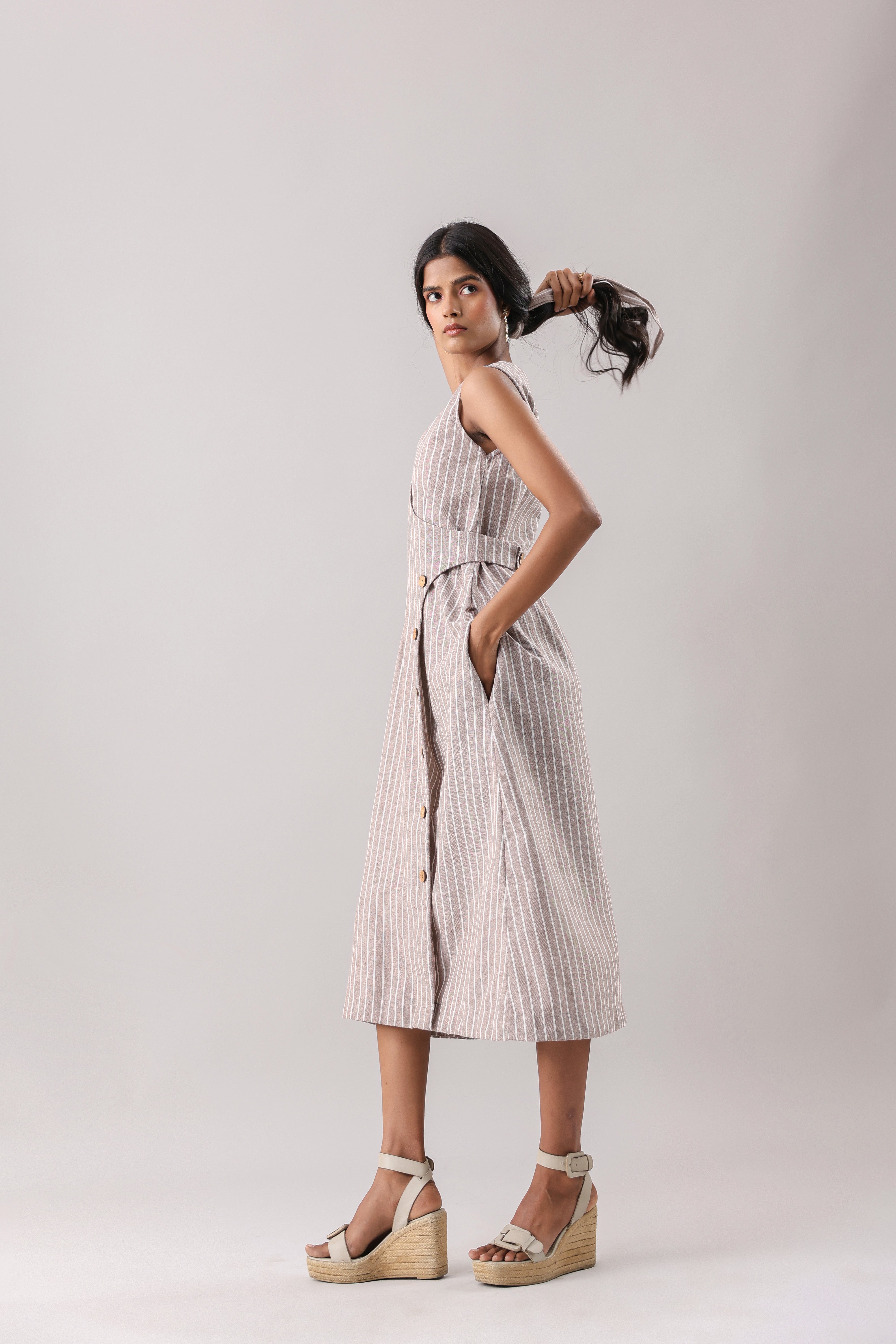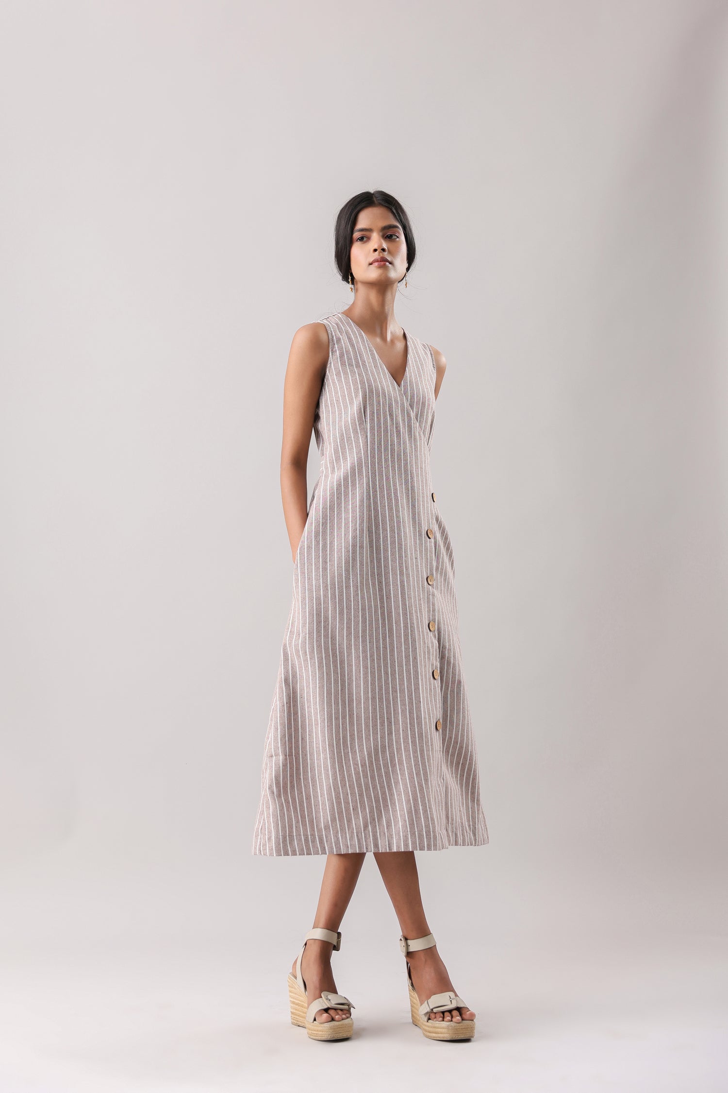 Wrap midi dress with adjustable button closures in a statement mocha striped linen fabric.