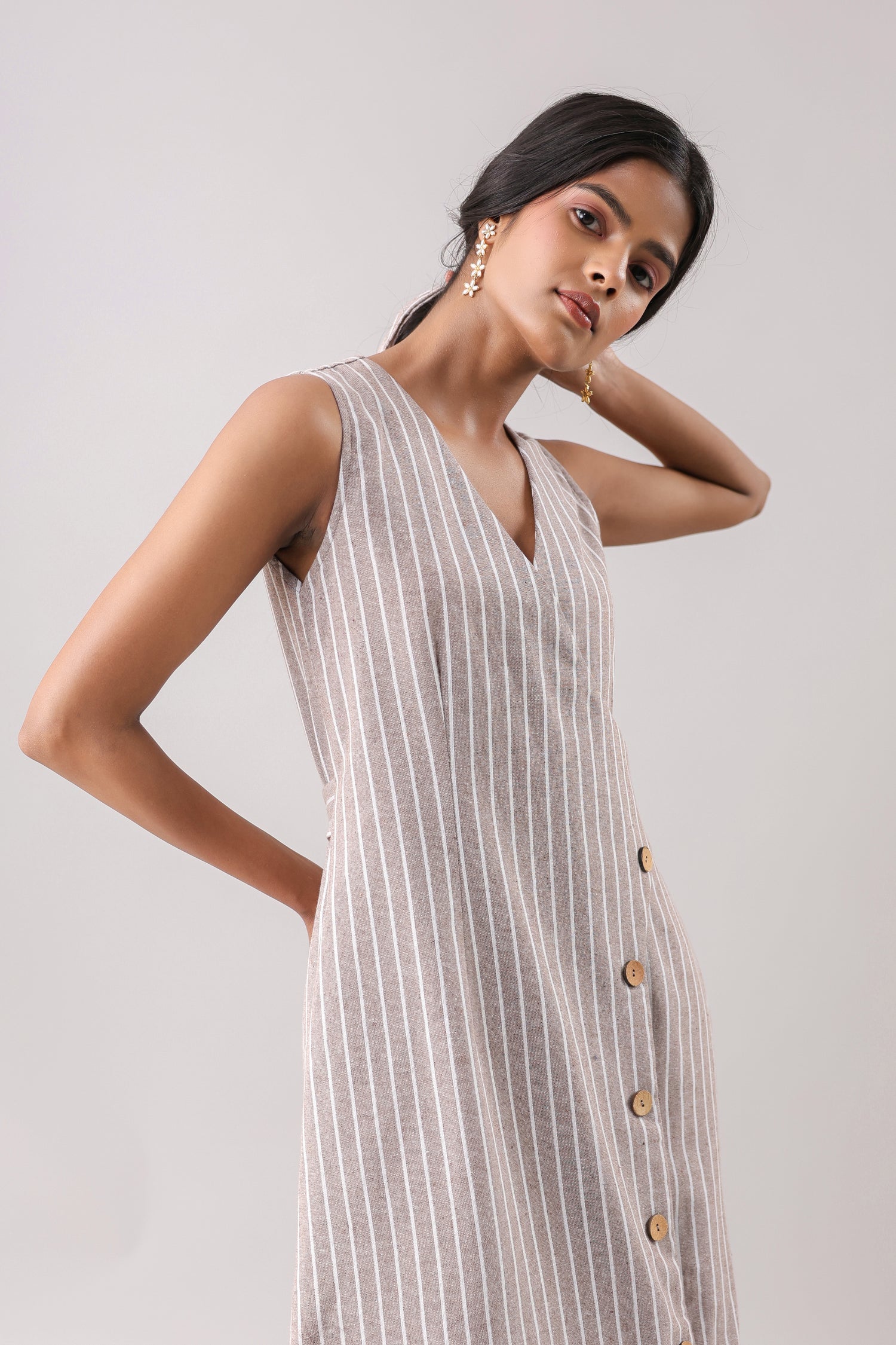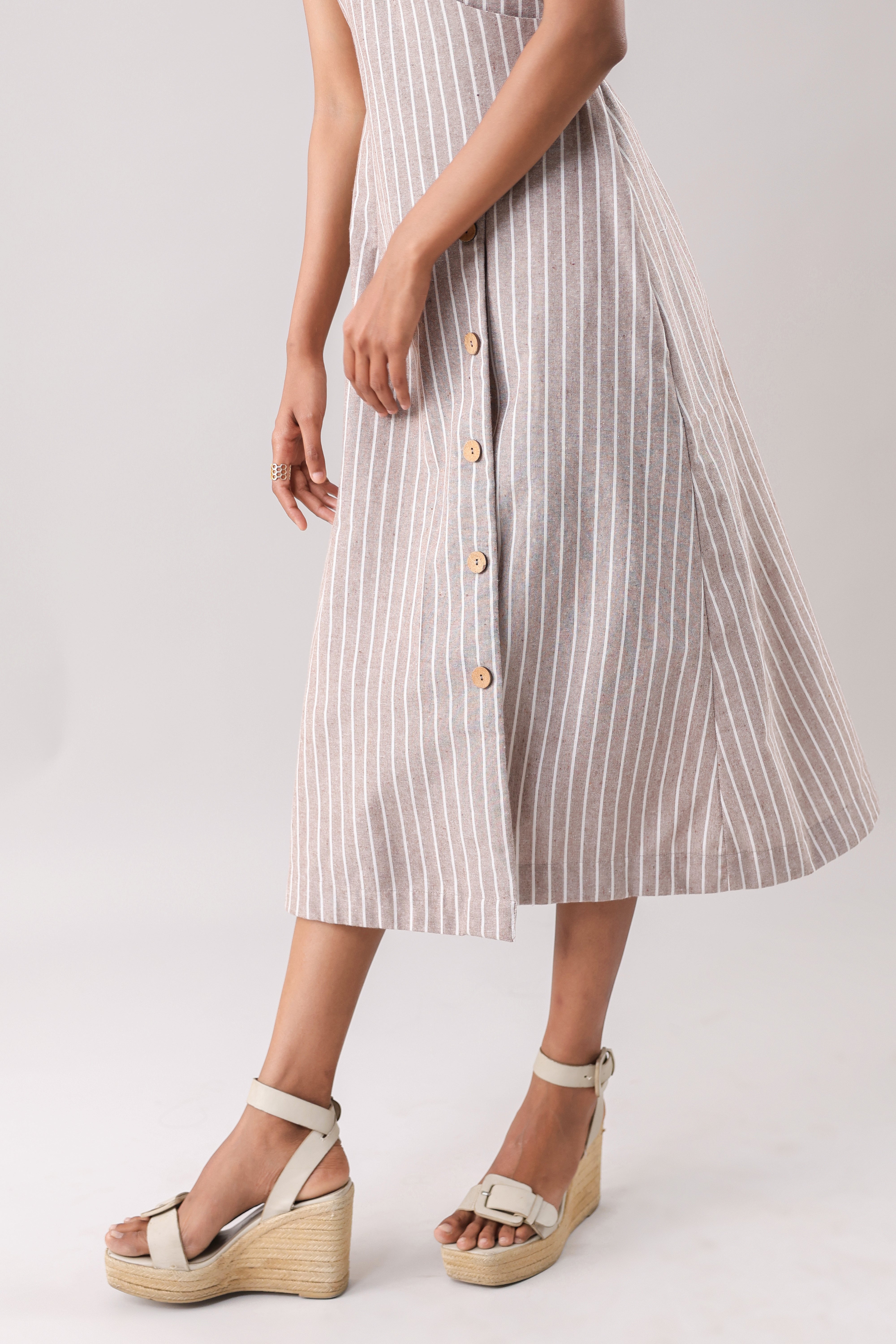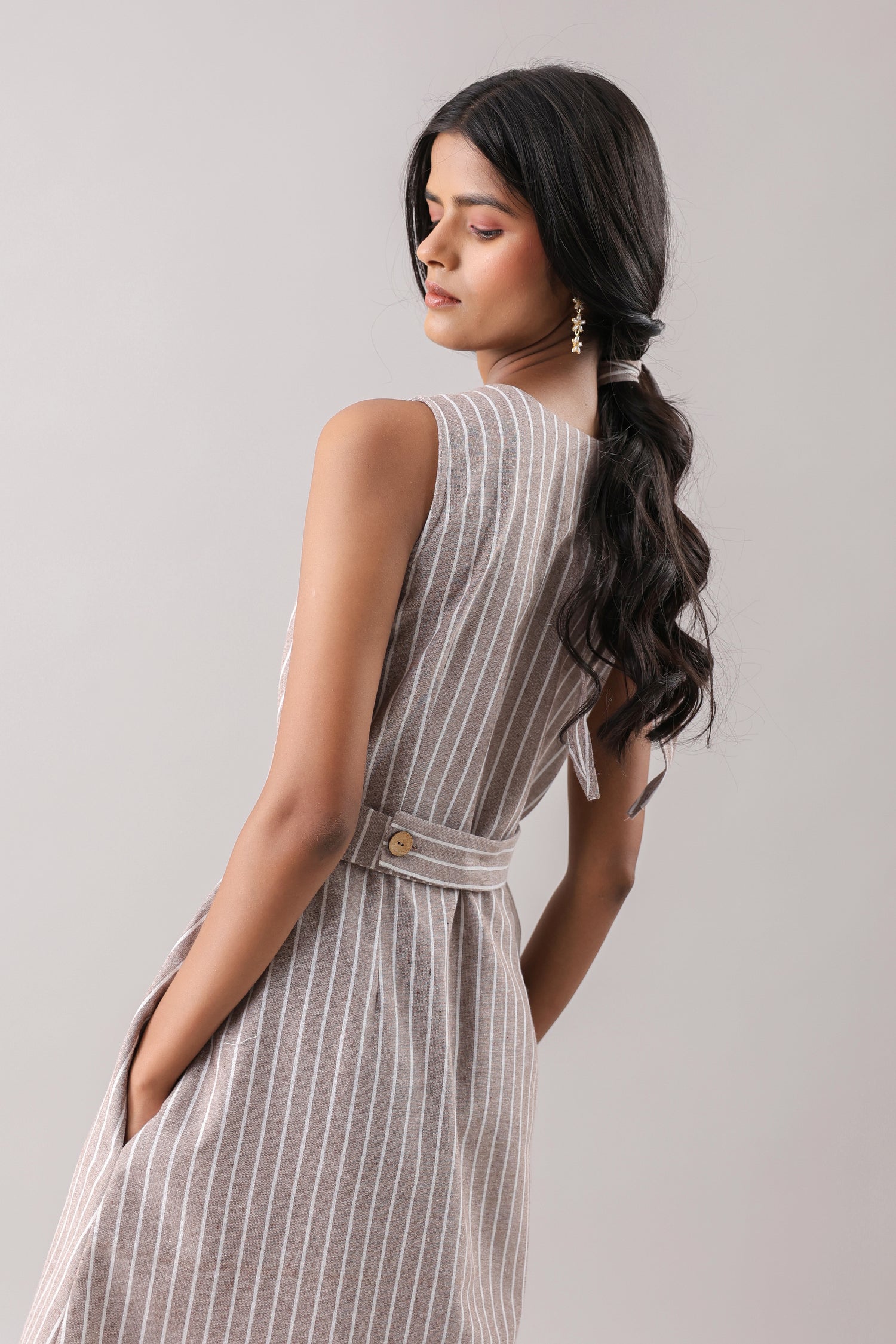 Wrap midi dress with adjustable button closures in a statement mocha striped linen fabric.