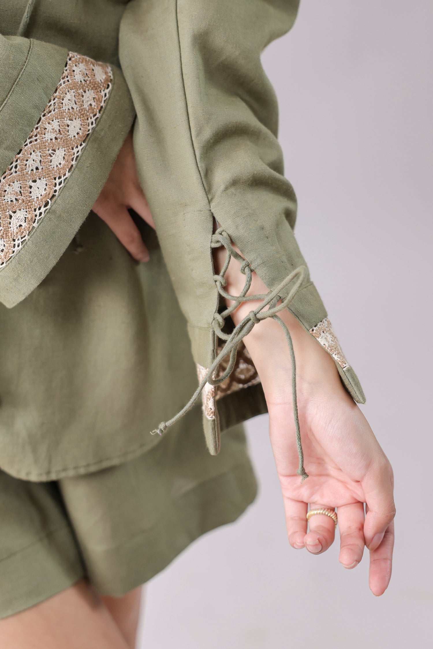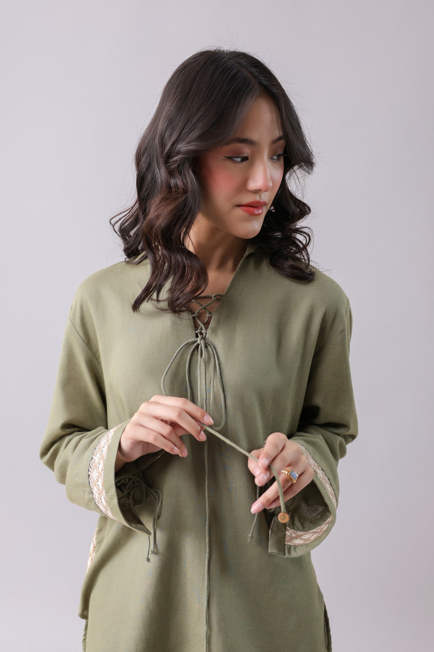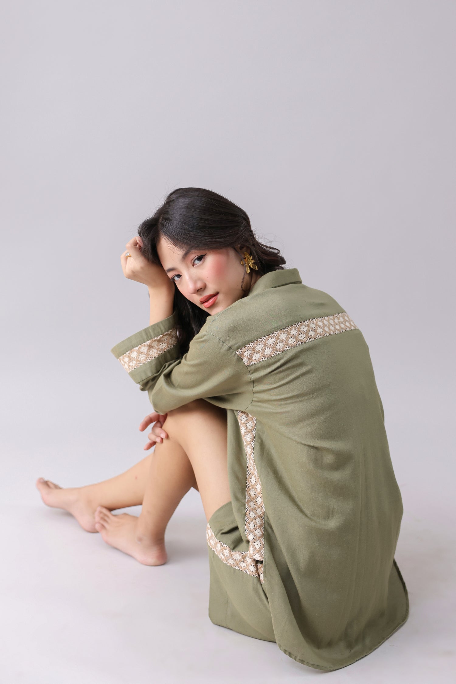 Collared oversized top with v-neck. Featuring crochet lace along seam lines and drawstring detail at the neck and cuffs.