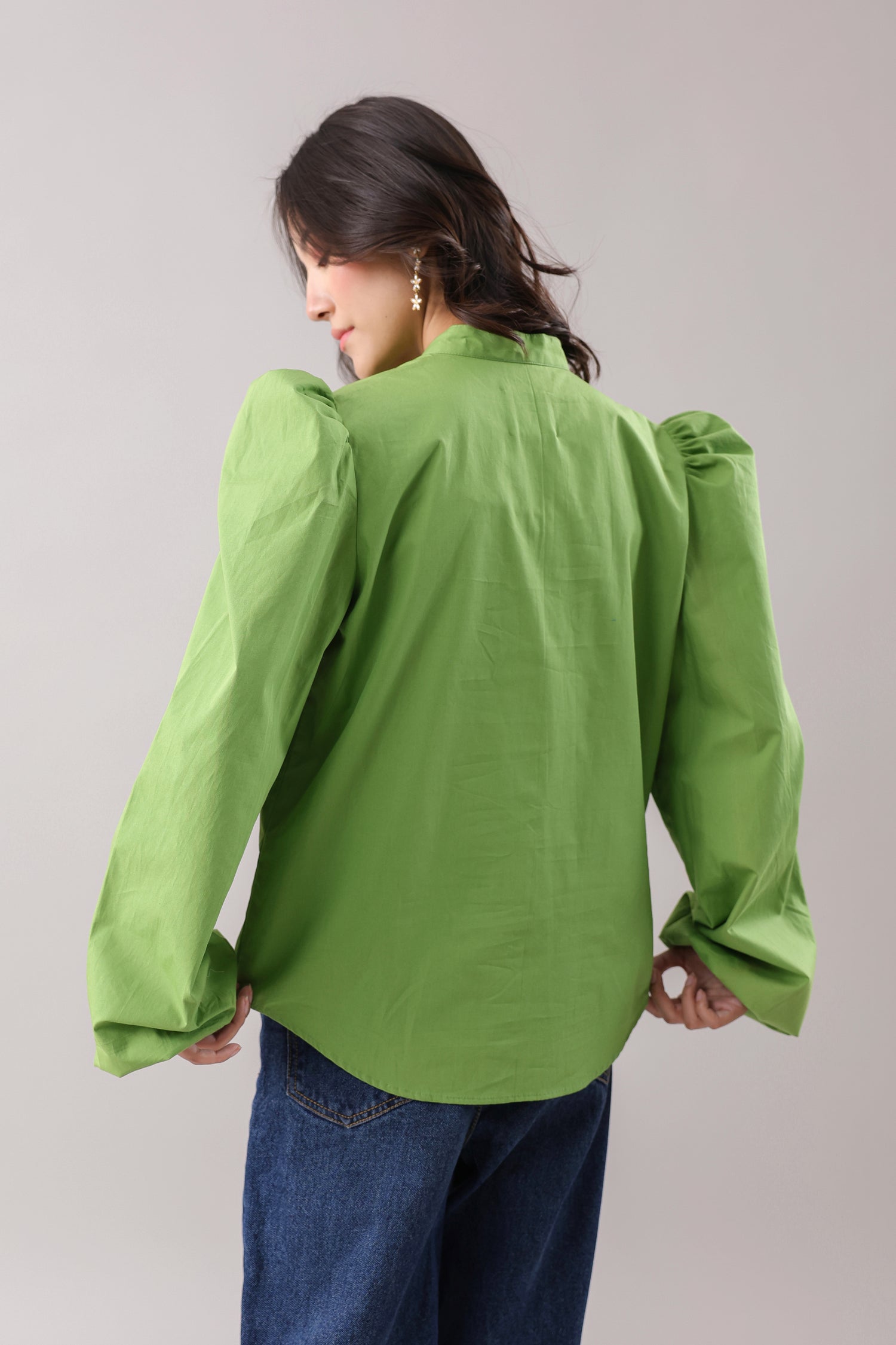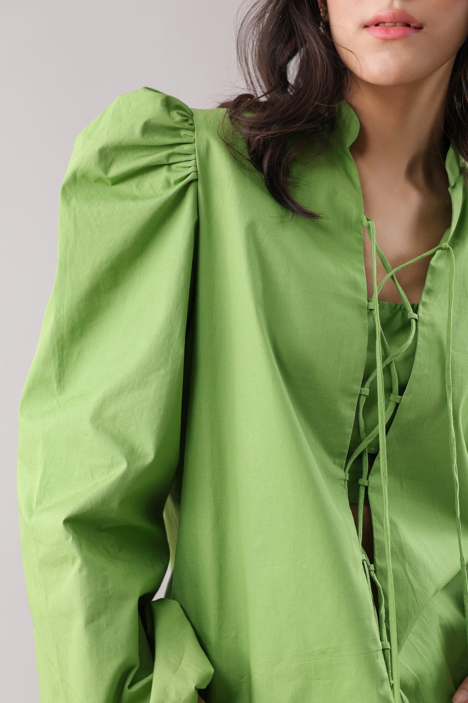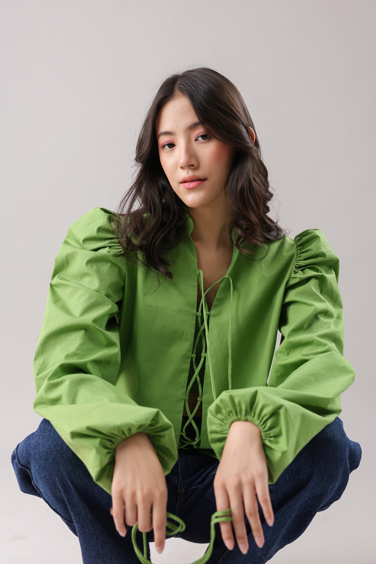 Round-neck stand collar tie-up drawstring shirt with long sleeves and elasticated cuffs. A well-fit bustier with zipper closure.