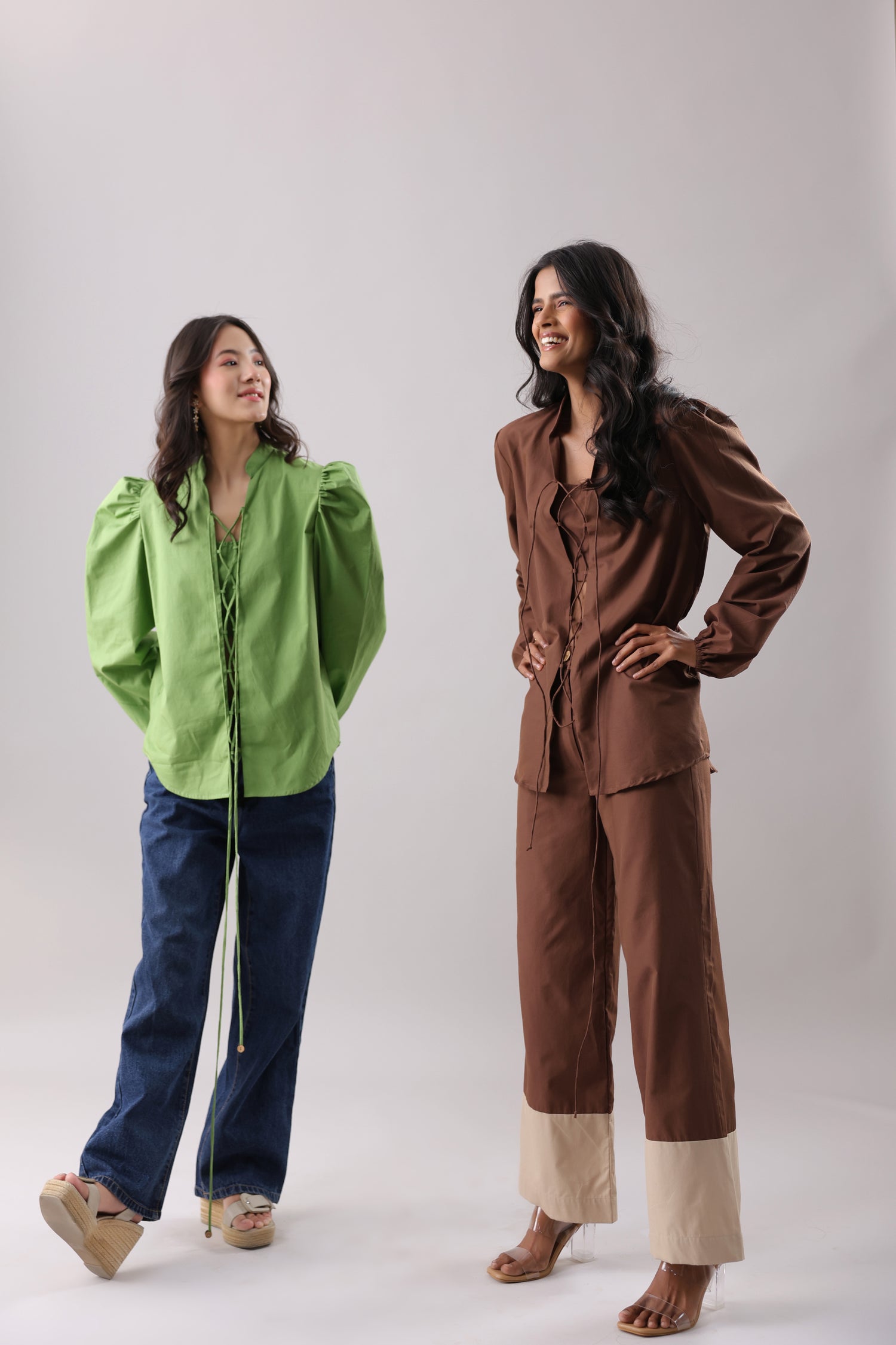 Perky tie-up shirt, with a drawstring detail, comes with a bustier.