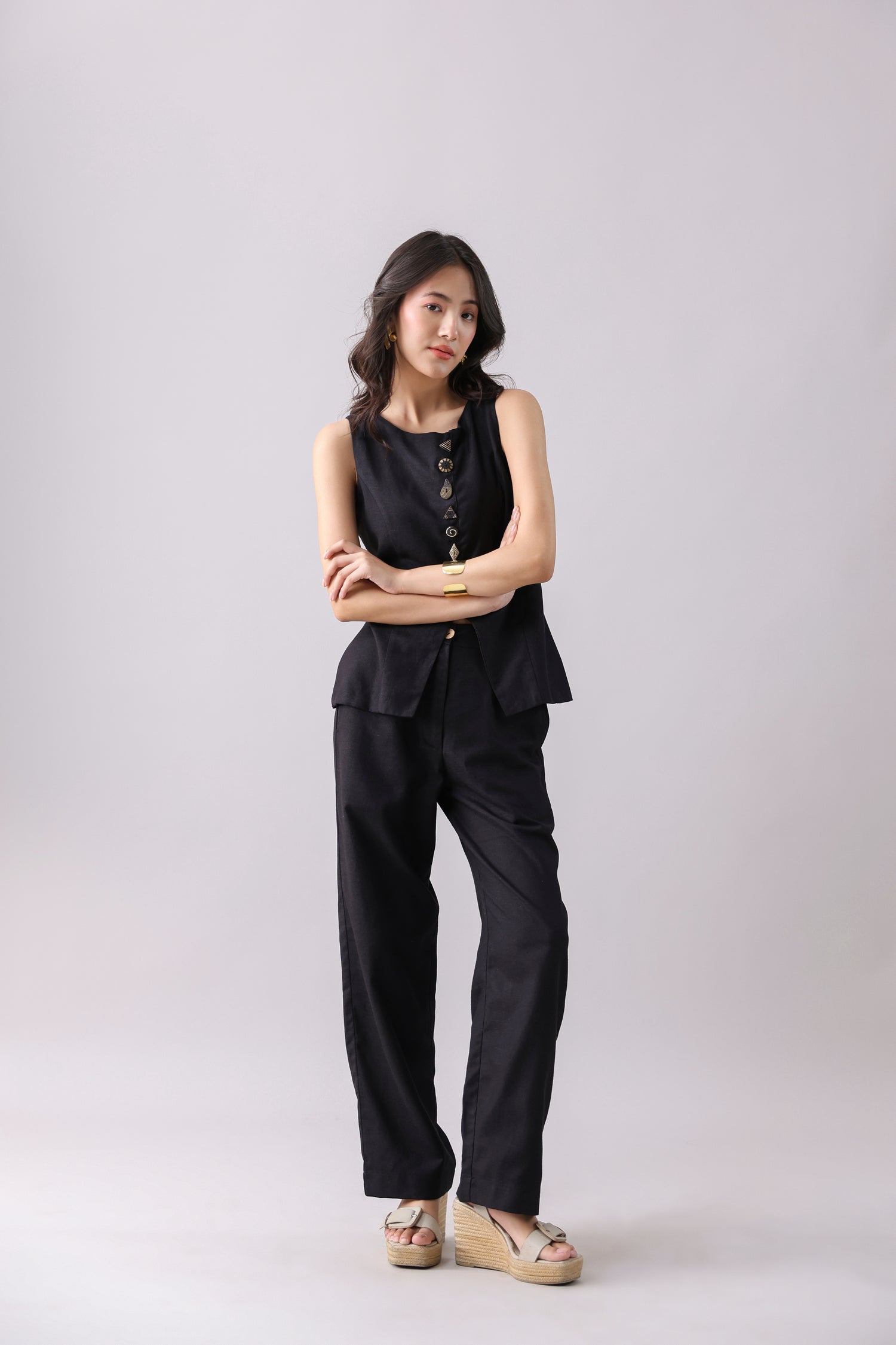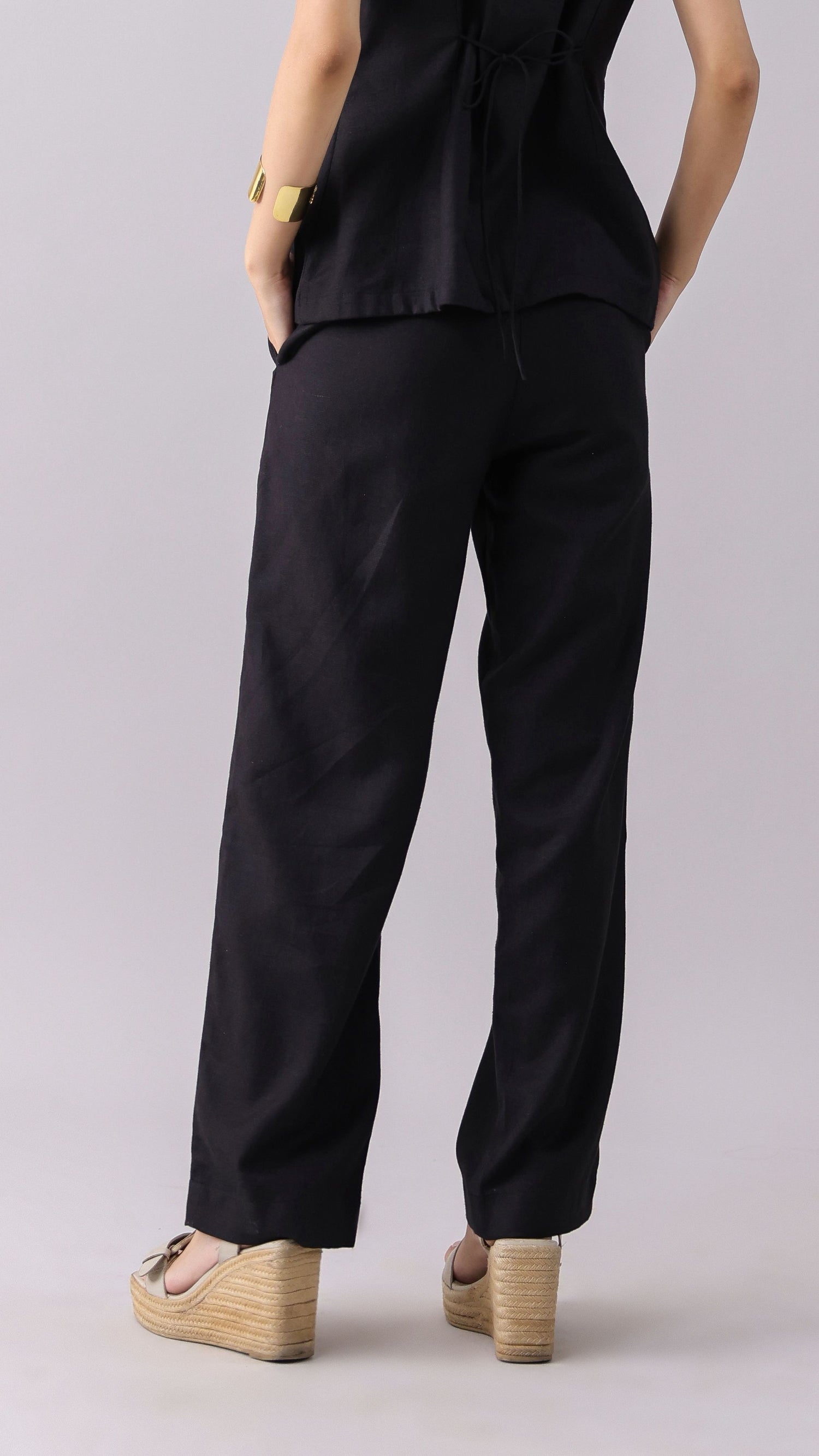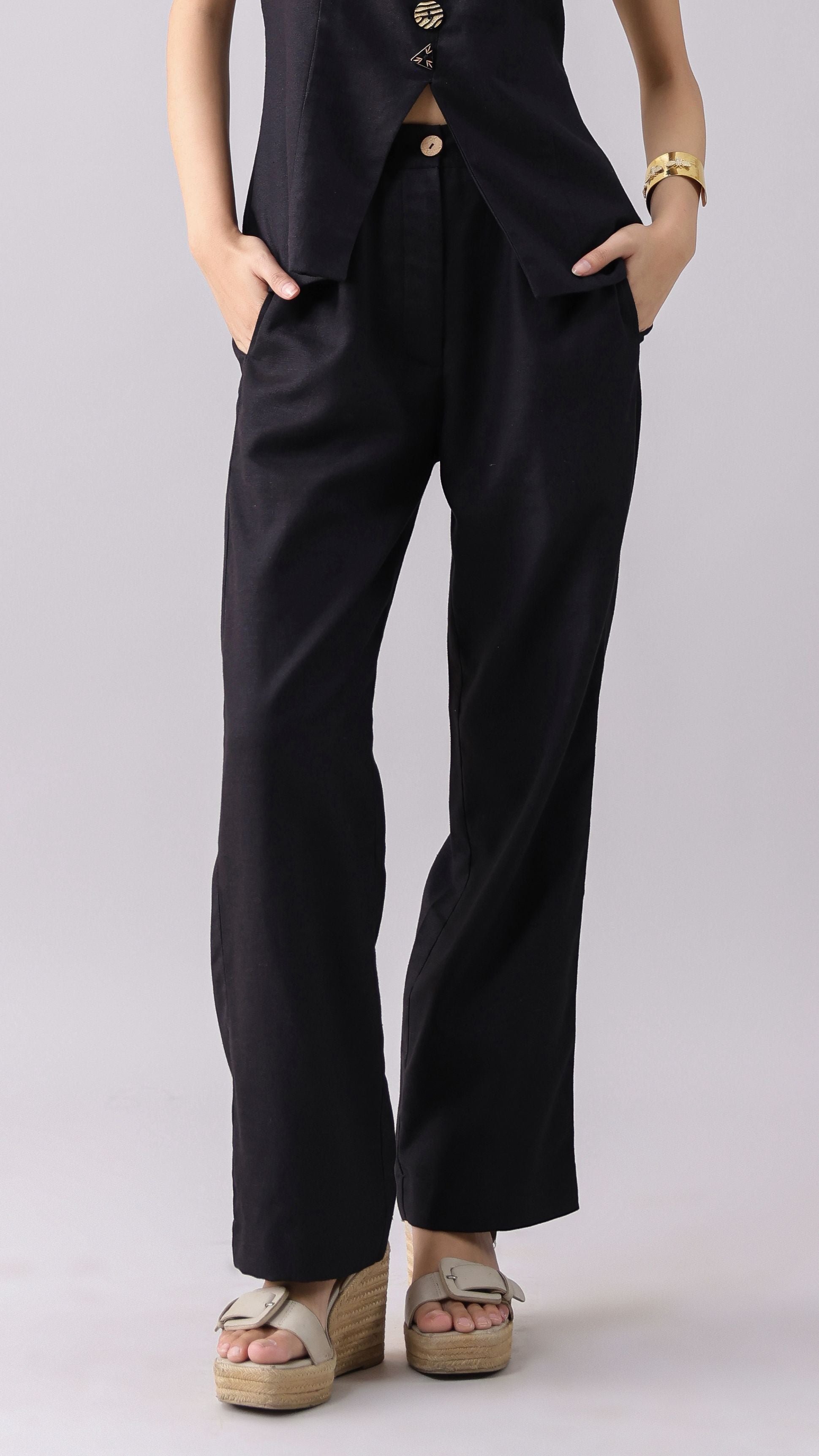 Black linen straight-fit pants.