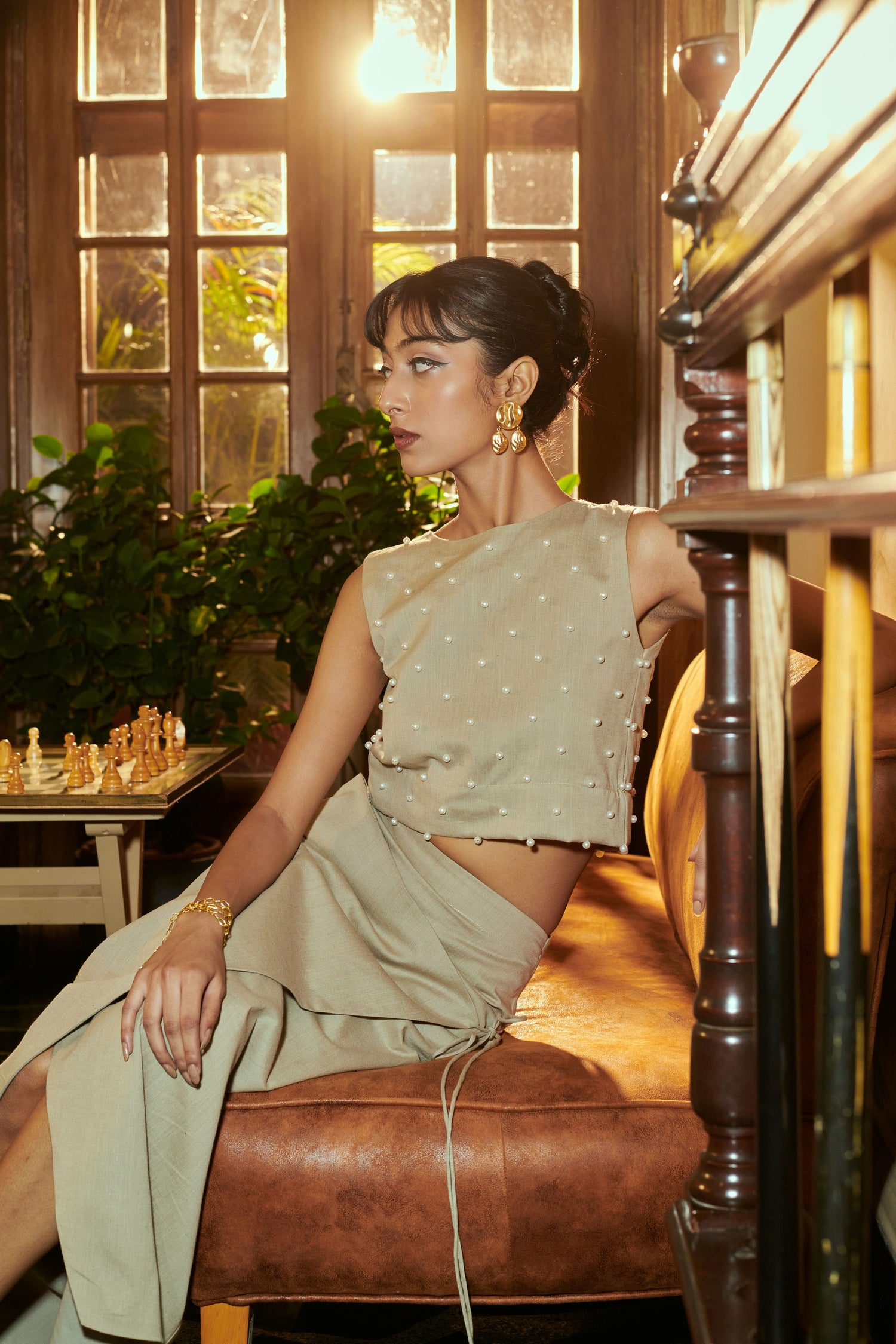 Wrap skirt, featuring a pencil shape, and tie-up at the side. Side concealed zipper fastening.